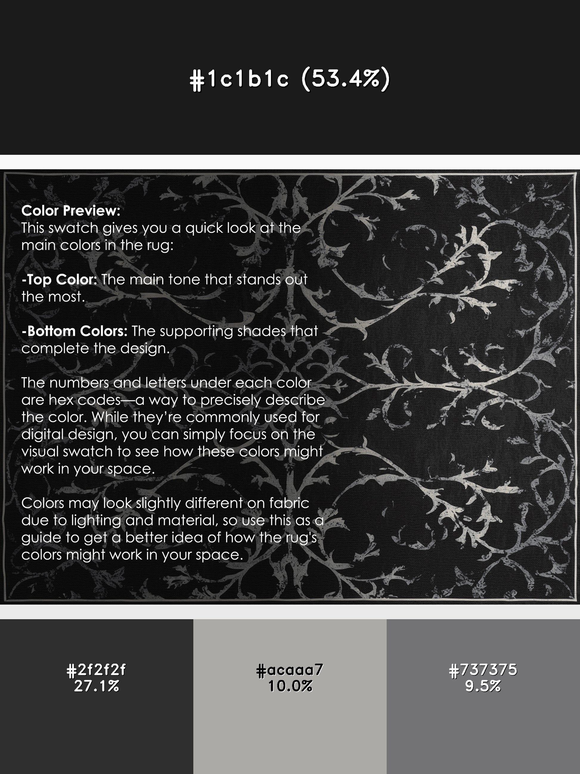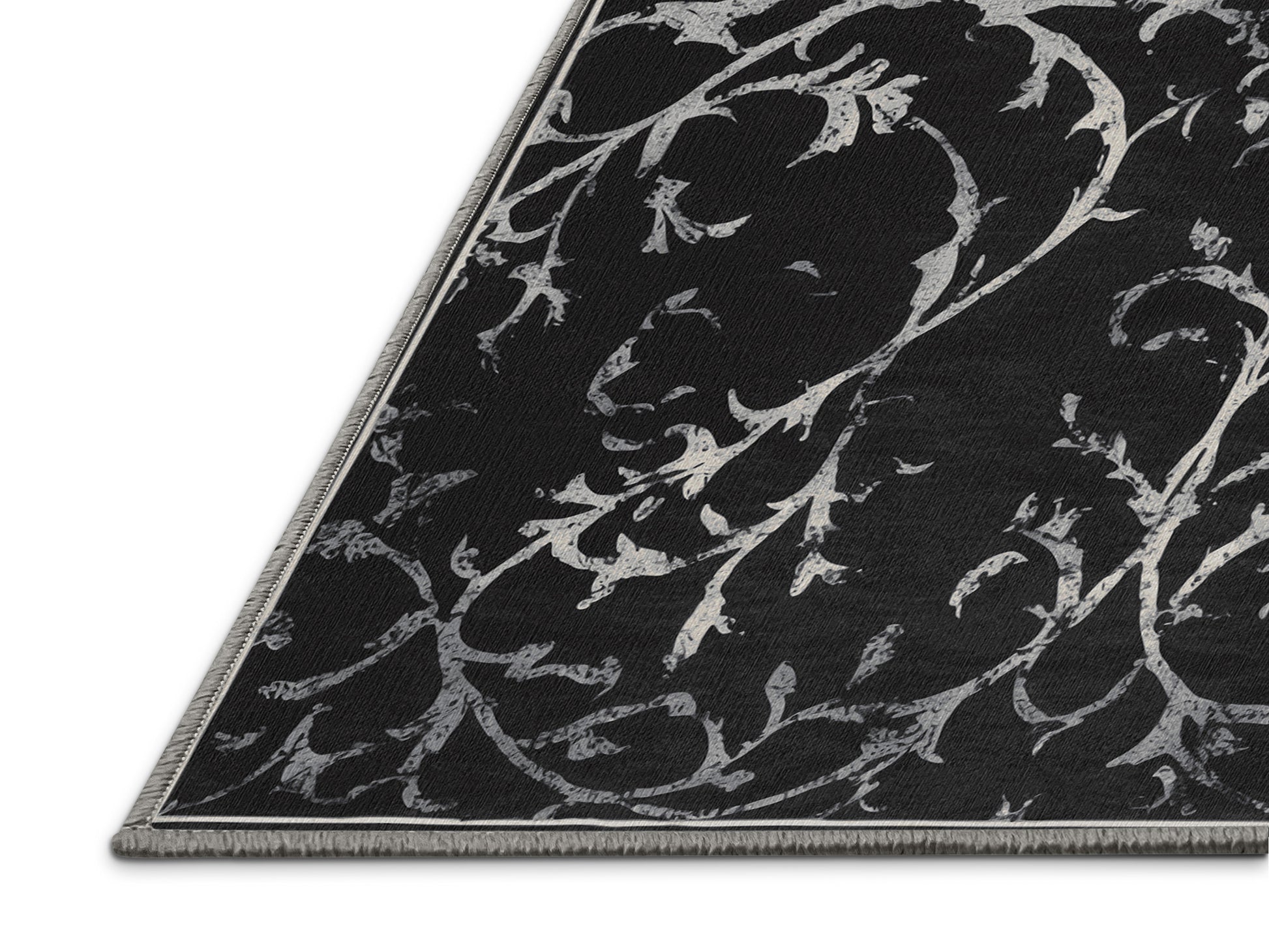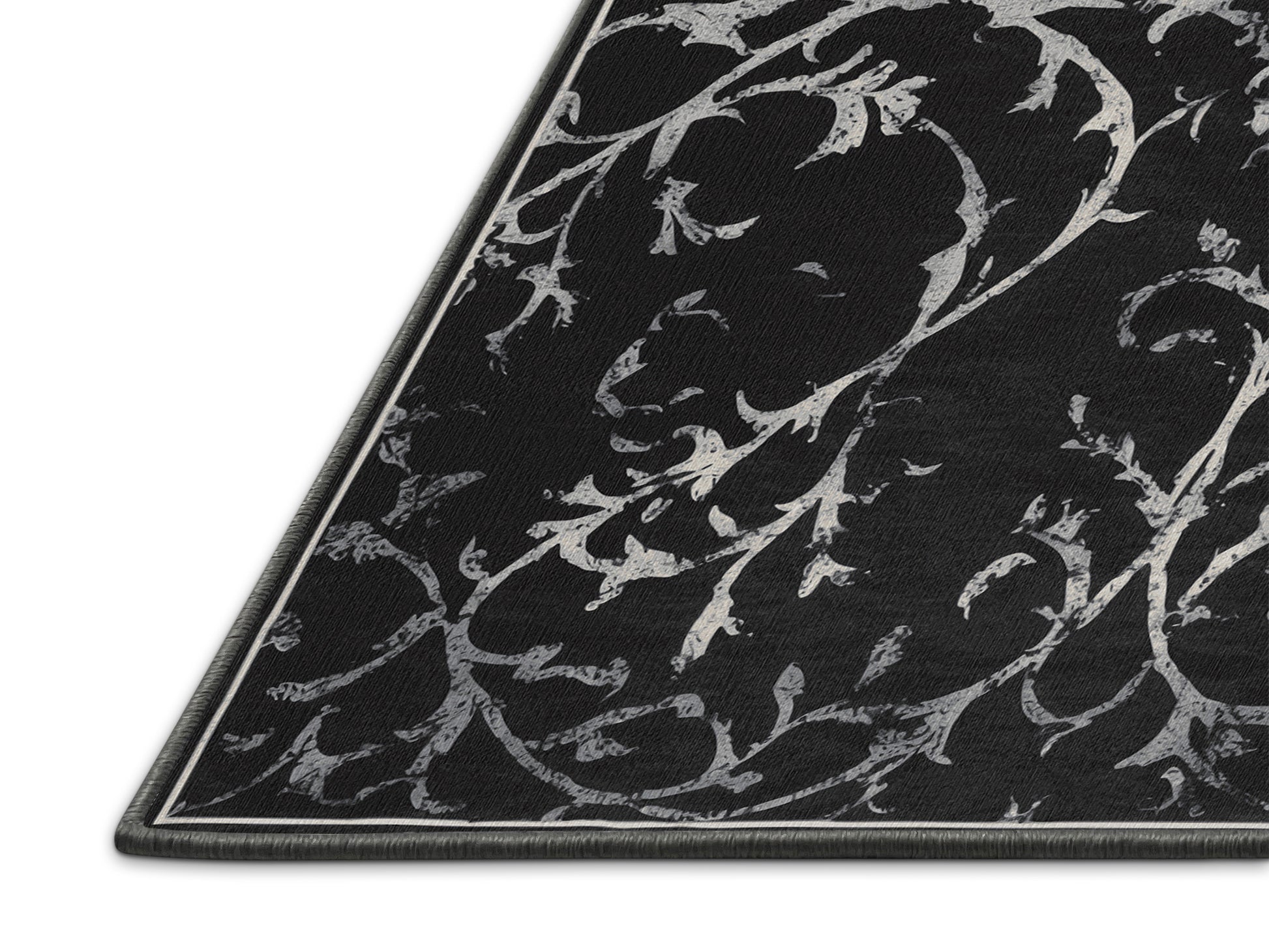 Phantom Bloom from the Nocturne Elegance collection exudes timeless sophistication with its captivating Midnight color (A deep, dark color with subtle red undertones, mysterious and bold.), a rich tone in the Black color family. Featuring intricate baroque-inspired patterns and swirling vine designs, this rug creates a sense of depth and refined elegance. Finished with Gray serging a durable edge that enhances its luxurious aesthetic this rug is crafted from premium polyester and machine-made in the USA with imported materials. Perfect for formal dining rooms, chic living areas, or cozy bedrooms, this design balances bold drama with subtle charm, complementing both contemporary and traditional interiors. Available in multiple sizes, the Nocturne Elegance collection transforms your home into a haven of understated grandeur and classic refinement.