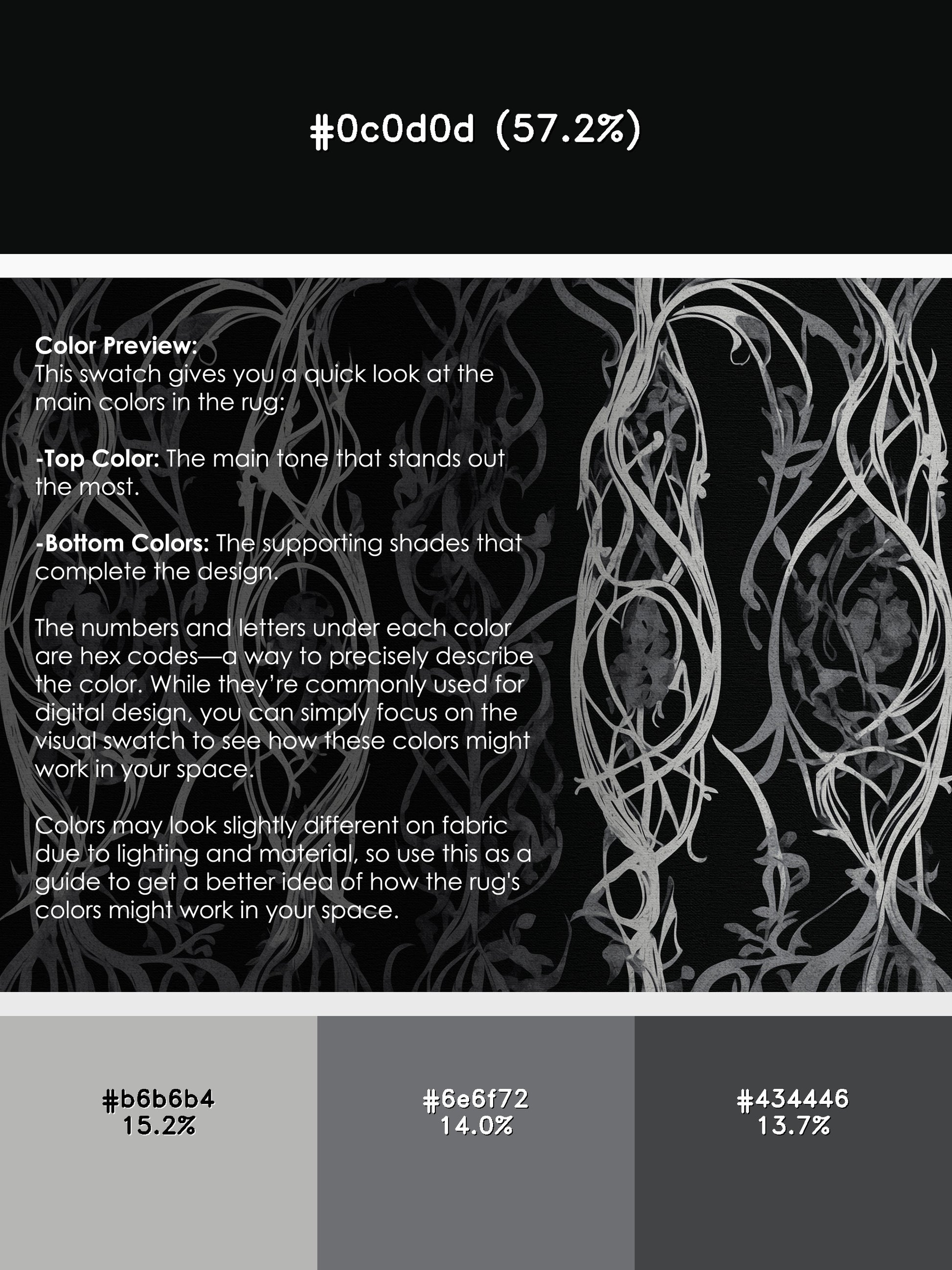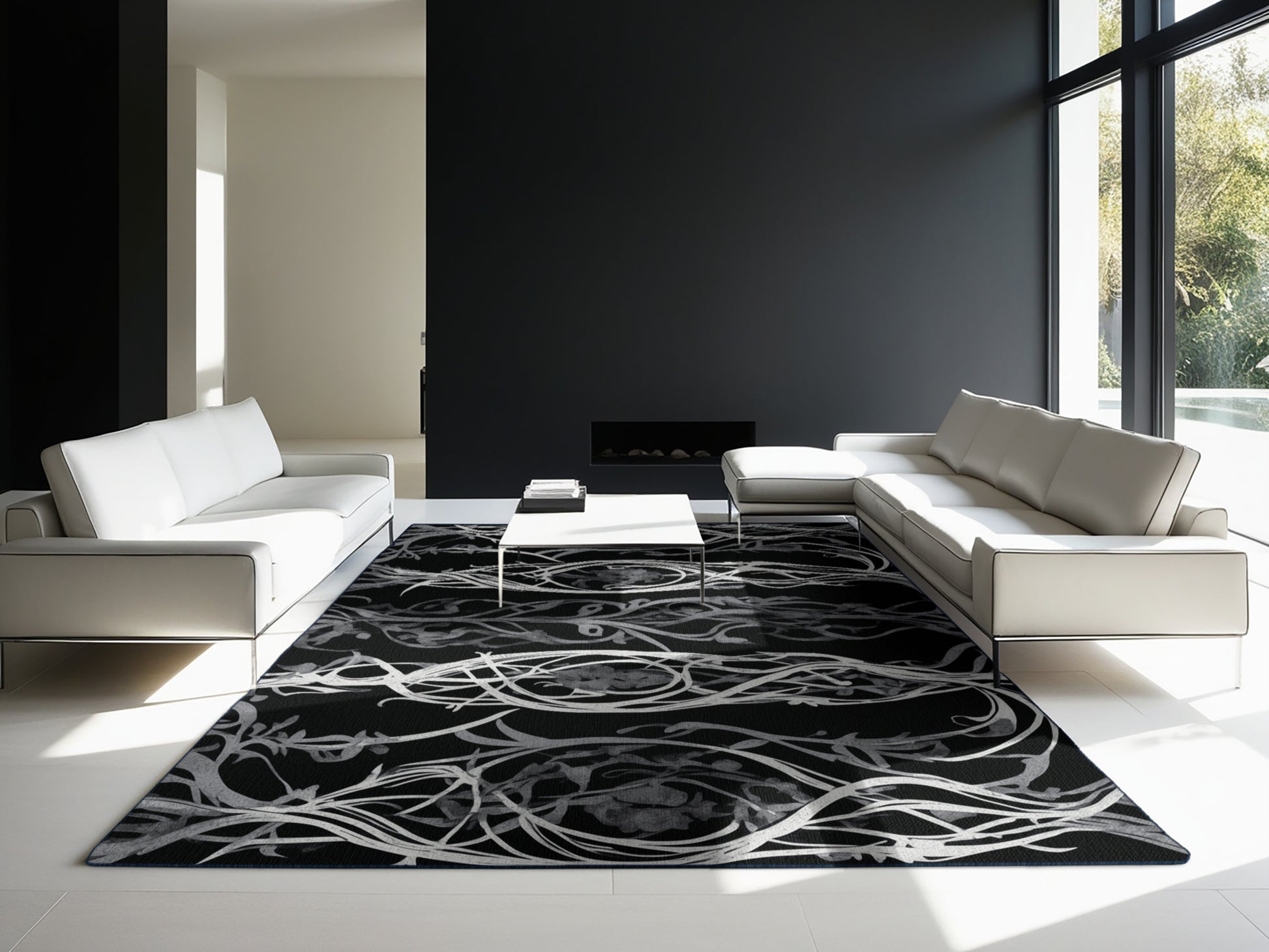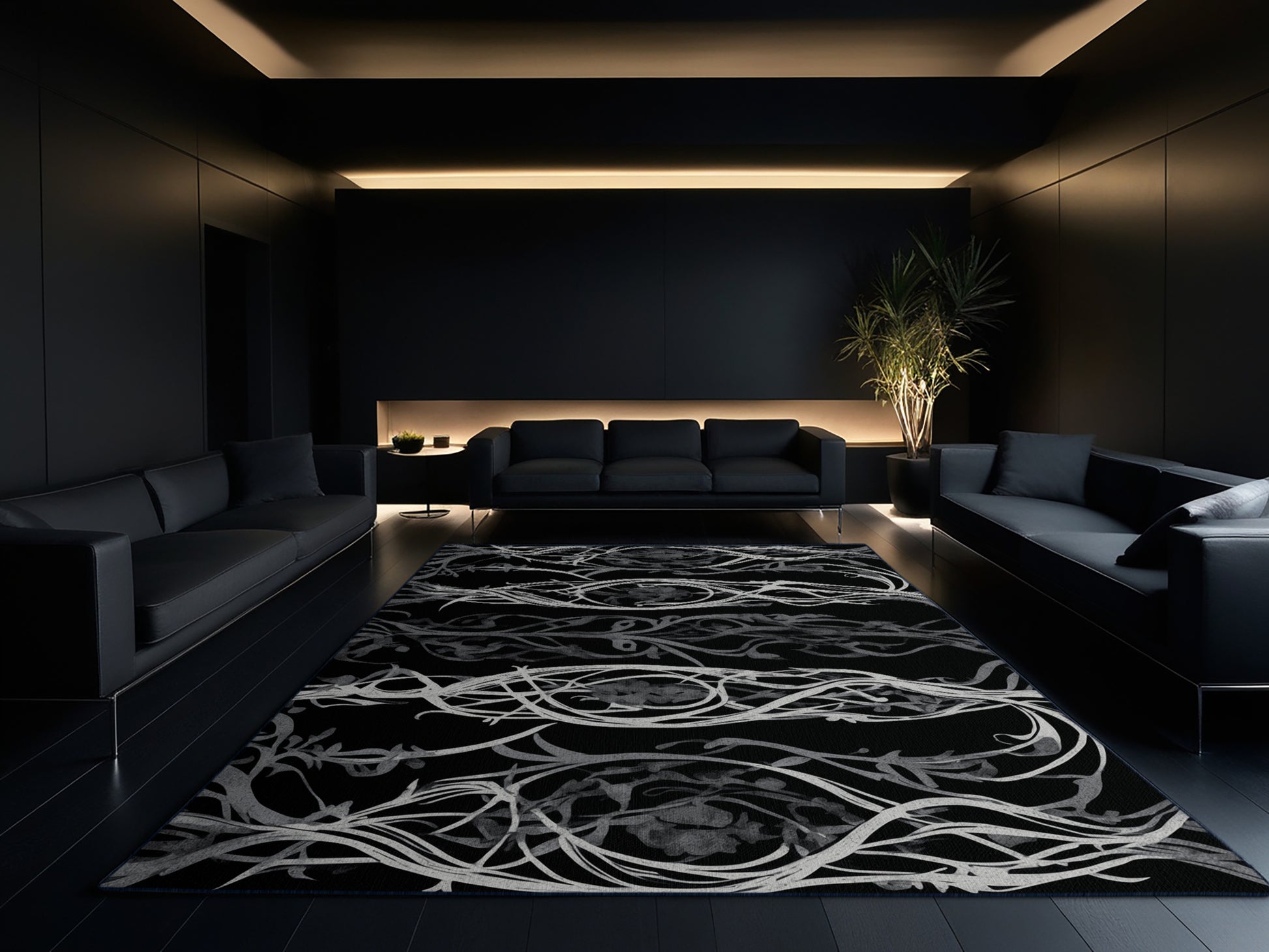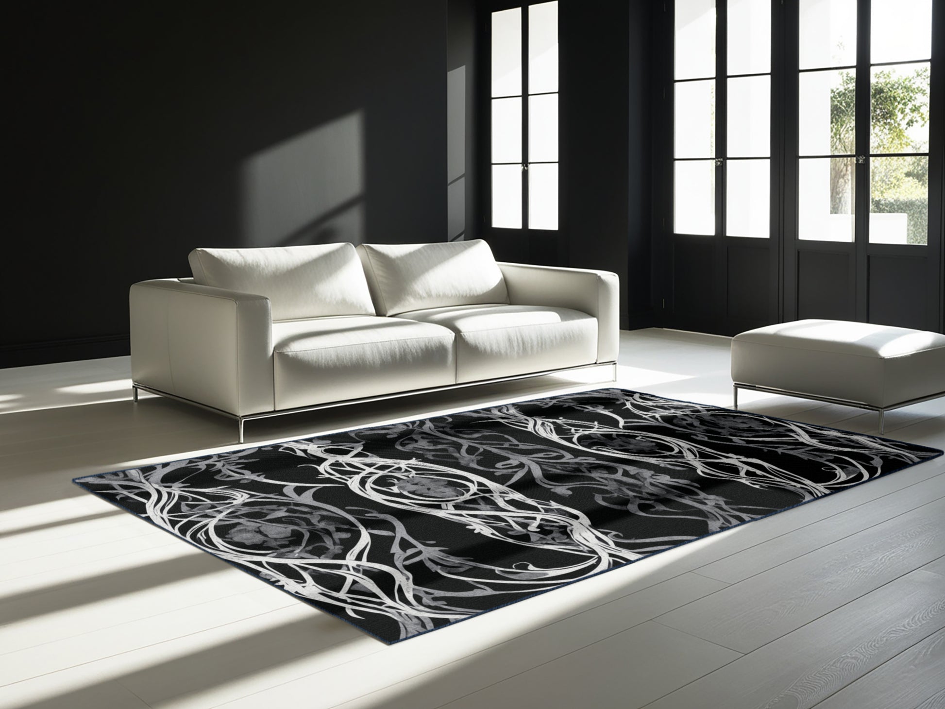 Phantom Lace from the Nocturne Elegance collection exudes timeless sophistication with its captivating Night color (A rich, dark black with a hint of depth, evoking the stillness of night.), a rich tone in the Black color family. Featuring intricate baroque-inspired patterns and swirling vine designs, this rug creates a sense of depth and refined elegance. Finished with Navy serging a durable edge that enhances its luxurious aesthetic this rug is crafted from premium polyester and machine-made in the USA with imported materials. Perfect for formal dining rooms, chic living areas, or cozy bedrooms, this design balances bold drama with subtle charm, complementing both contemporary and traditional interiors. Available in multiple sizes, the Nocturne Elegance collection transforms your home into a haven of understated grandeur and classic refinement.
