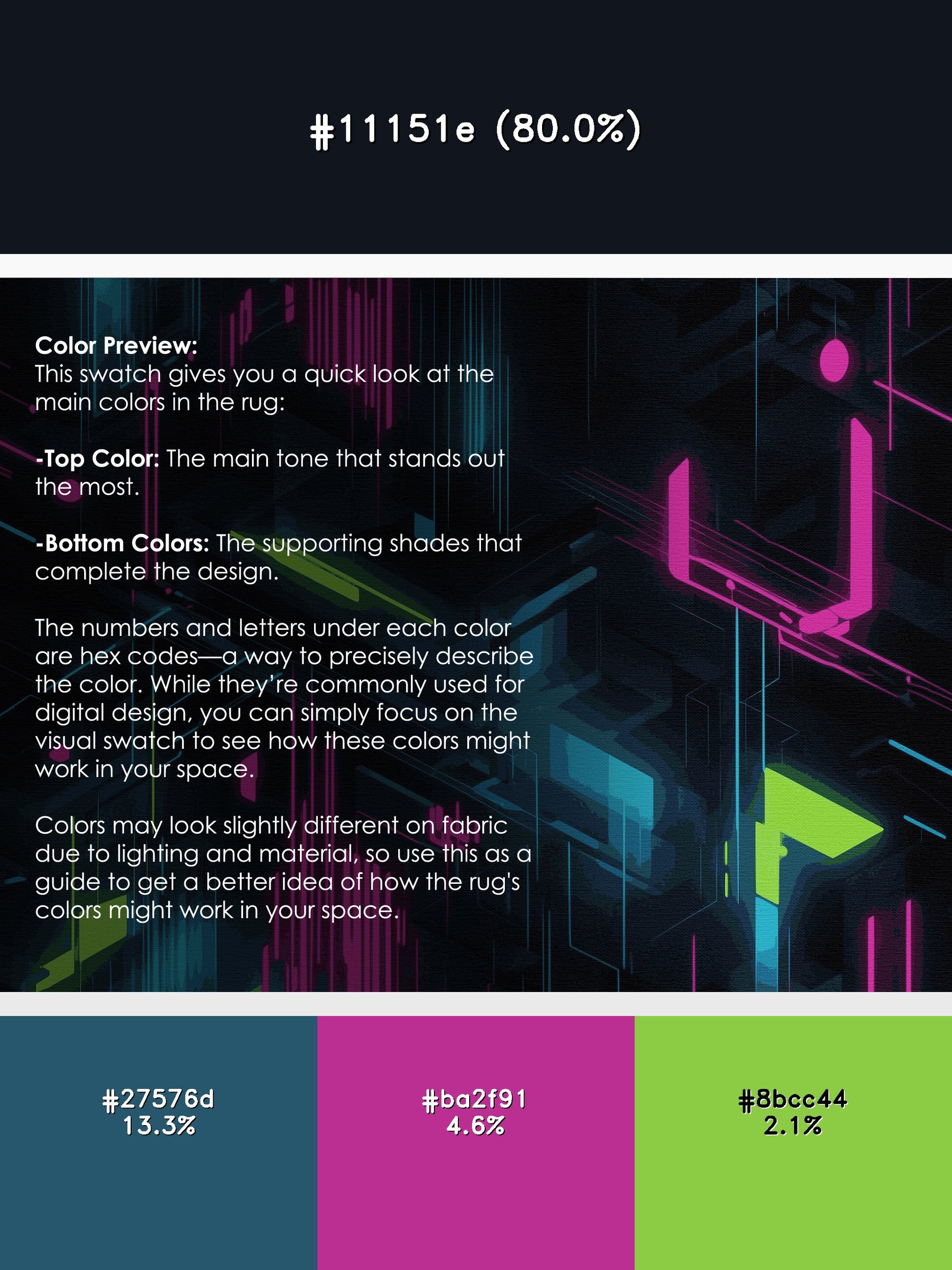 Photon Gleam from the Neon Nexus collection electrifies your space with its bold Dark Slate color (A dark slate blue with a cool and moody aesthetic.), a striking tone in the Blue color family. Inspired by neon-lit cityscapes and cyberpunk design, this rug features sharp geometric patterns and dynamic lines illuminated by vibrant, electric hues. Finished with Black serging a sleek edge that enhances its futuristic appeal this rug is crafted from premium polyester and machine-made in the USA with imported materials. Perfect for modern gaming rooms, creative studios, or contemporary living spaces, this design balances cutting-edge energy with adaptable elegance. Available in multiple sizes, the Neon Nexus collection transforms any room into a bold statement of innovation and style, channeling the vibrant glow of a cyberpunk universe.