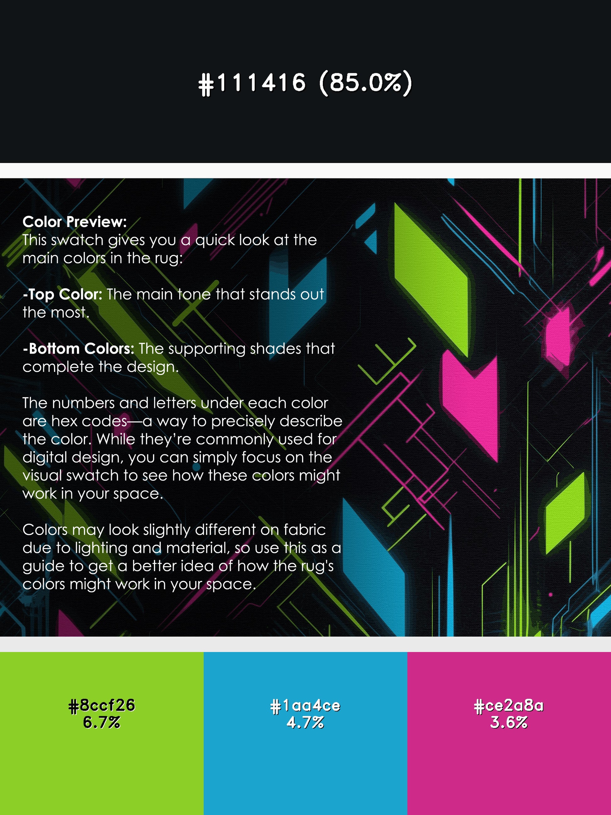 Pixel Rift from the Neon Nexus collection electrifies your space with its bold Gunmetal color (A deep, metallic gray with hints of green and blue.), a striking tone in the Gray color family. Inspired by neon-lit cityscapes and cyberpunk design, this rug features sharp geometric patterns and dynamic lines illuminated by vibrant, electric hues. Finished with Black serging a sleek edge that enhances its futuristic appeal this rug is crafted from premium polyester and machine-made in the USA with imported materials. Perfect for modern gaming rooms, creative studios, or contemporary living spaces, this design balances cutting-edge energy with adaptable elegance. Available in multiple sizes, the Neon Nexus collection transforms any room into a bold statement of innovation and style, channeling the vibrant glow of a cyberpunk universe.