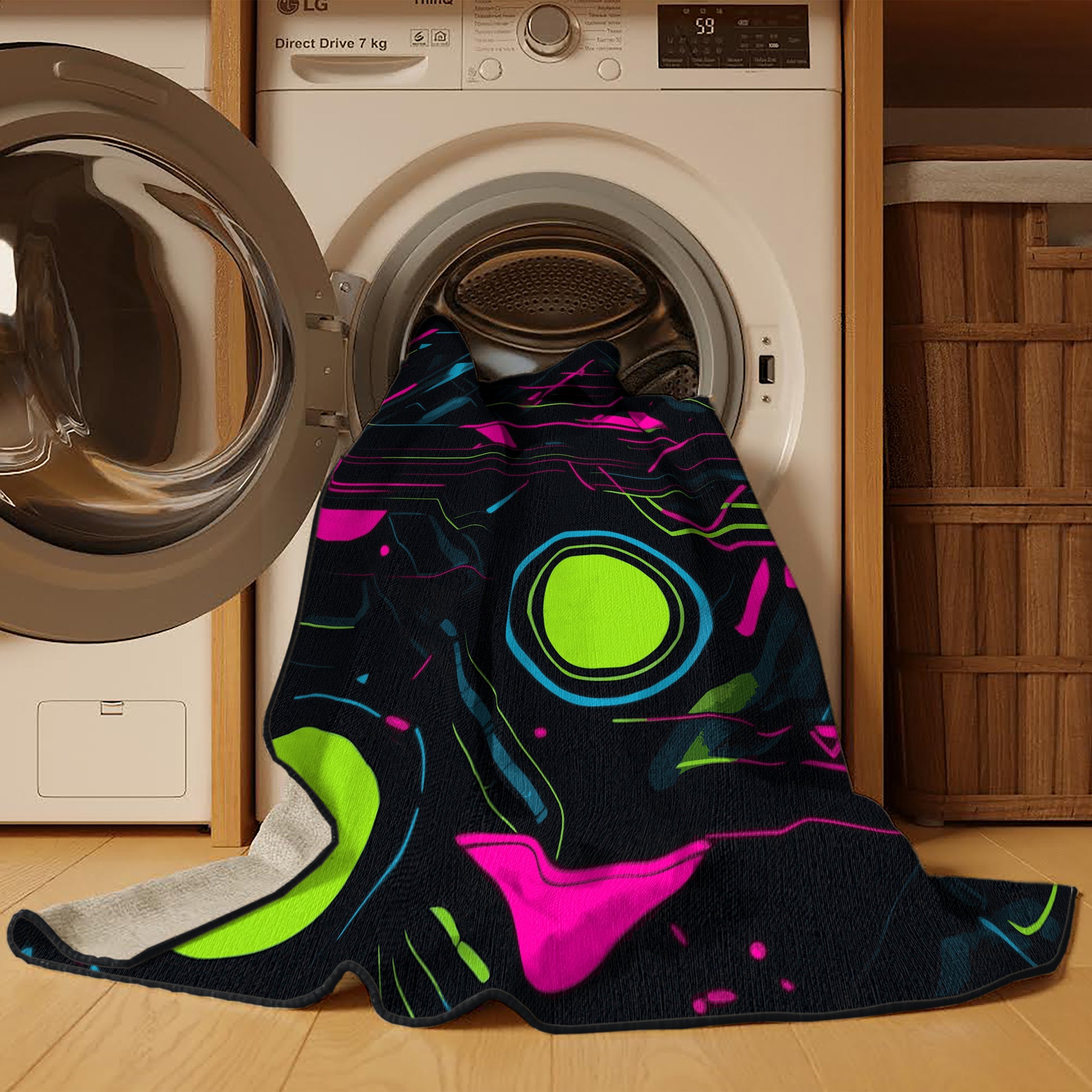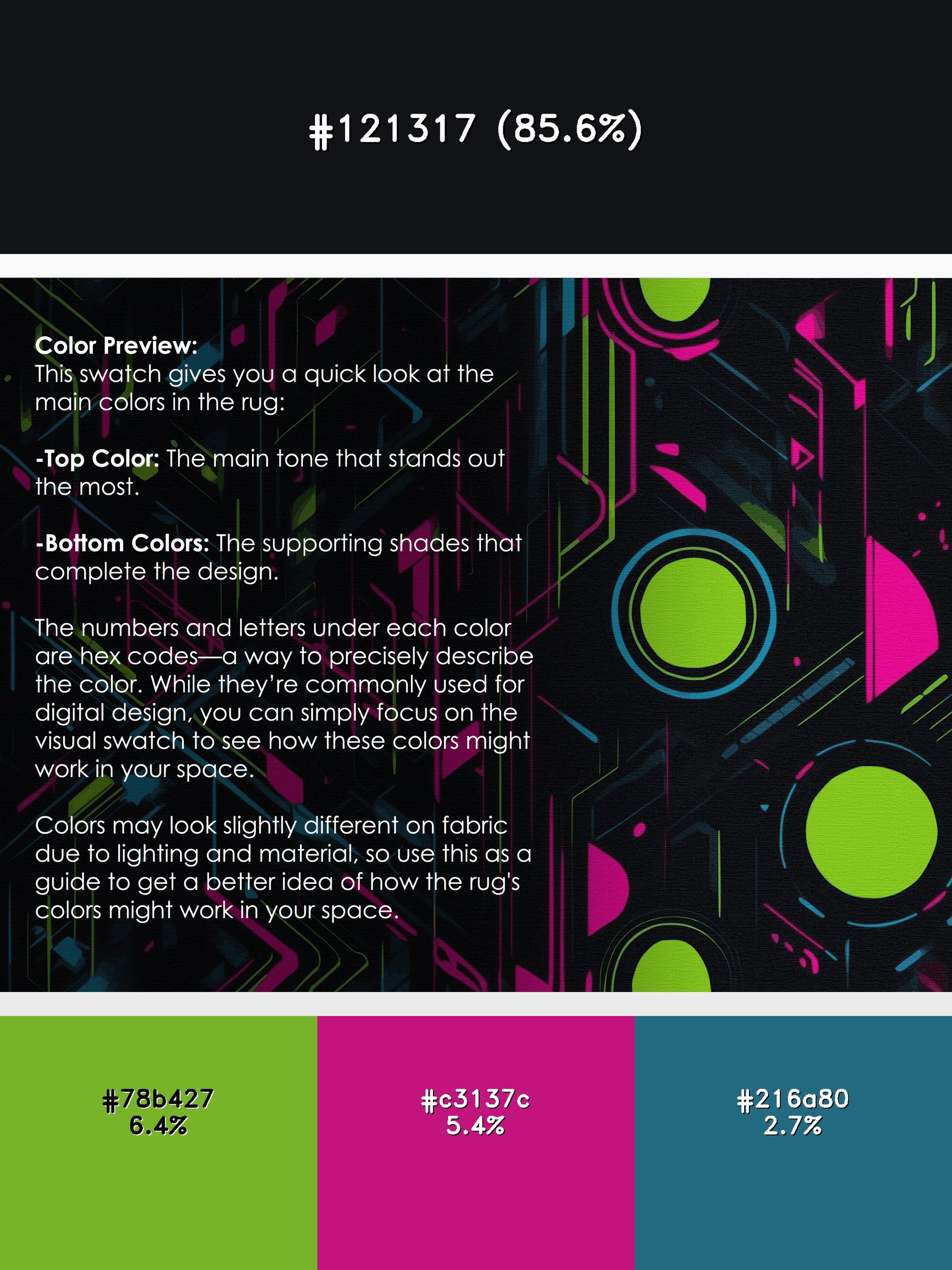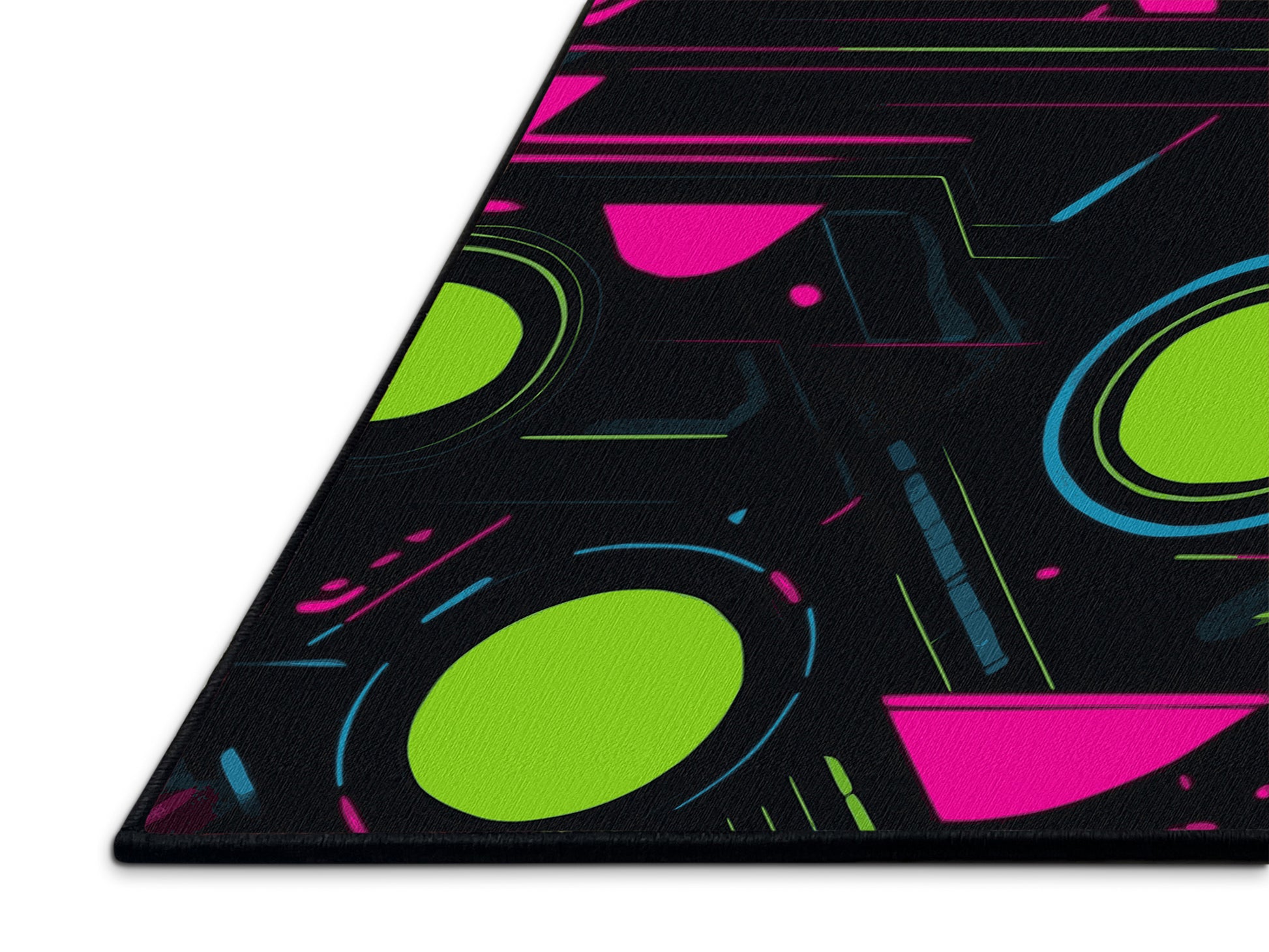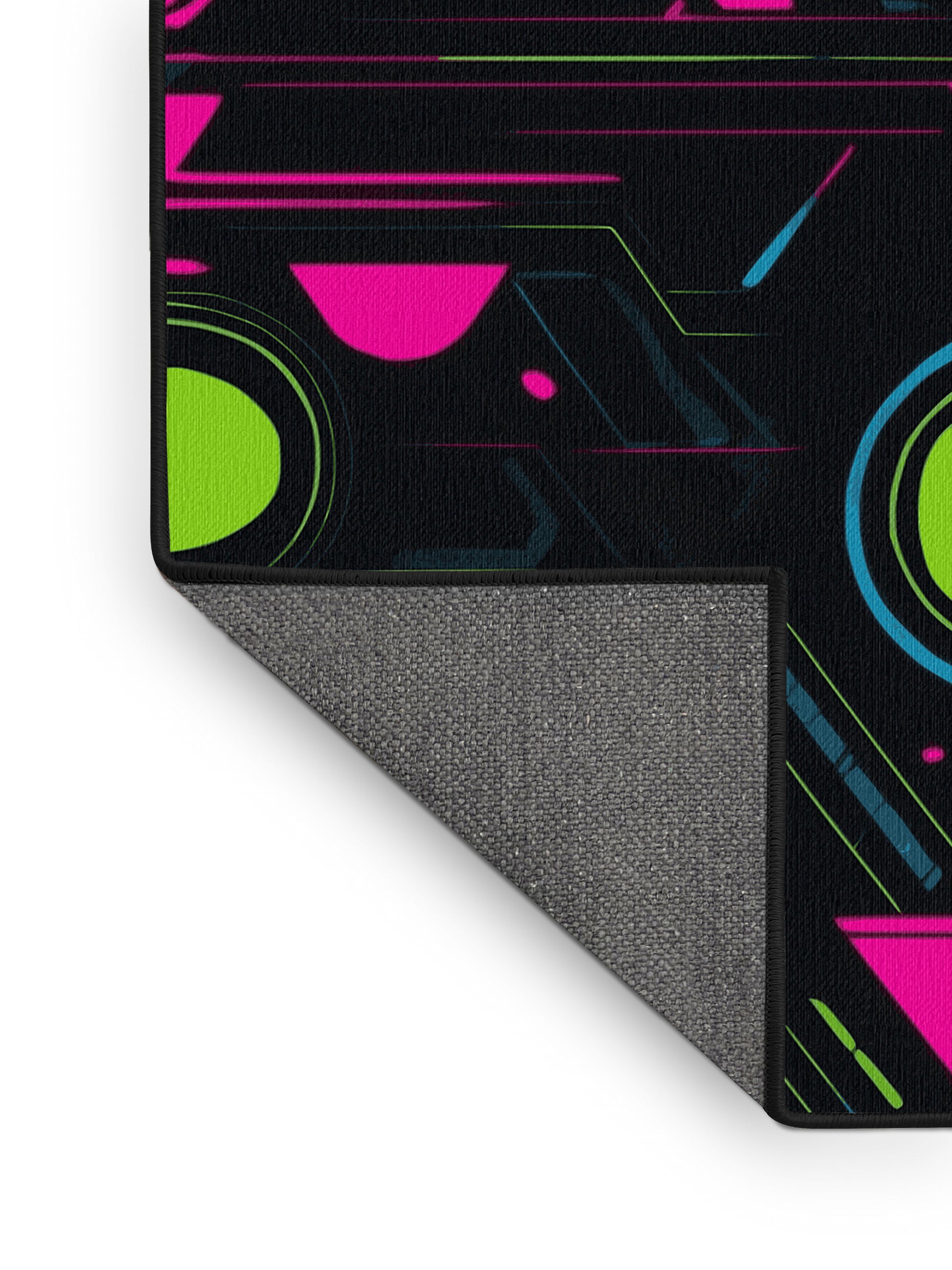 Plasma Focus from the Neon Nexus collection electrifies your space with its bold Gunmetal color (A deep, metallic gray with hints of green and blue.), a striking tone in the Gray color family. Inspired by neon-lit cityscapes and cyberpunk design, this rug features sharp geometric patterns and dynamic lines illuminated by vibrant, electric hues. Finished with Black serging a sleek edge that enhances its futuristic appeal this rug is crafted from premium polyester and machine-made in the USA with imported materials. Perfect for modern gaming rooms, creative studios, or contemporary living spaces, this design balances cutting-edge energy with adaptable elegance. Available in multiple sizes, the Neon Nexus collection transforms any room into a bold statement of innovation and style, channeling the vibrant glow of a cyberpunk universe.