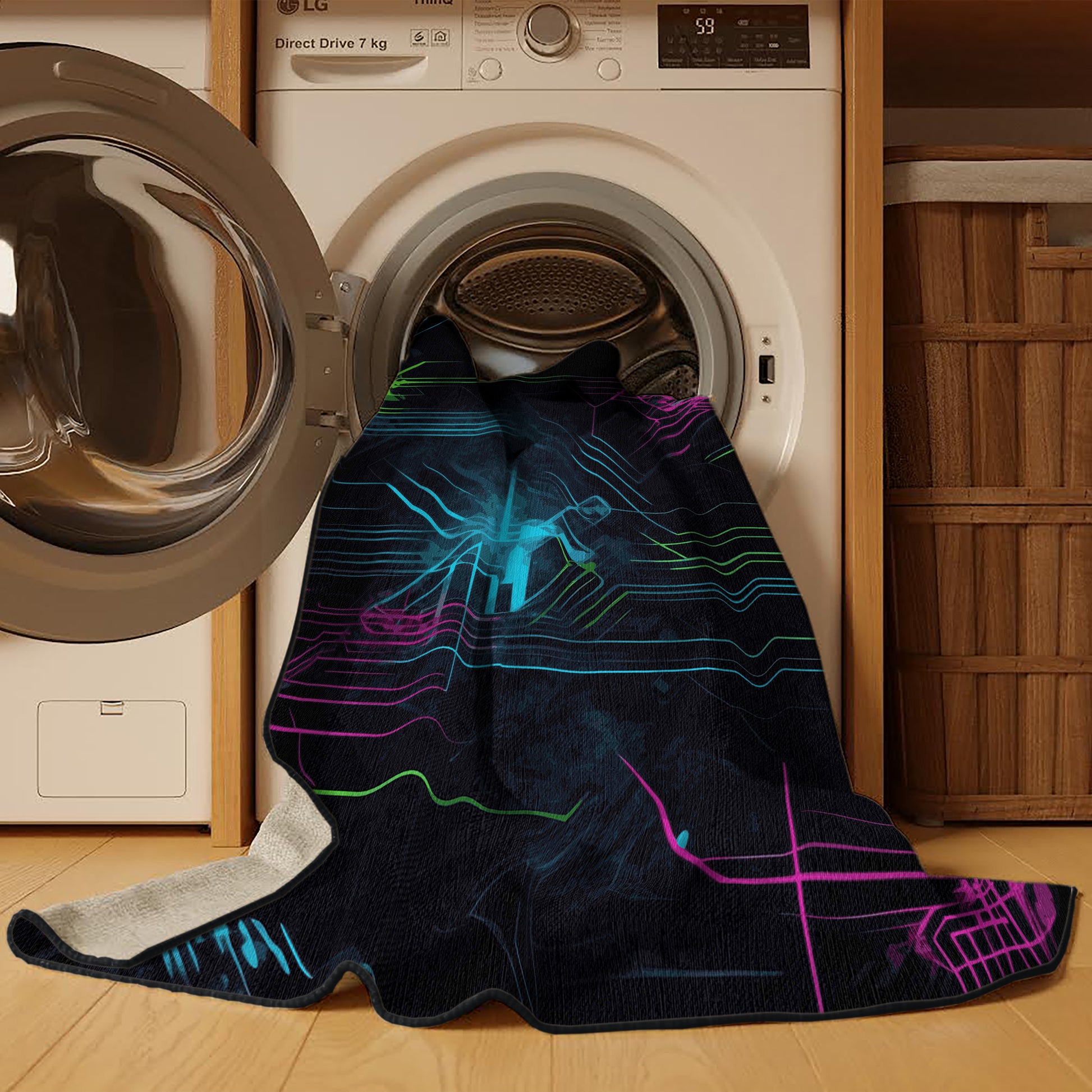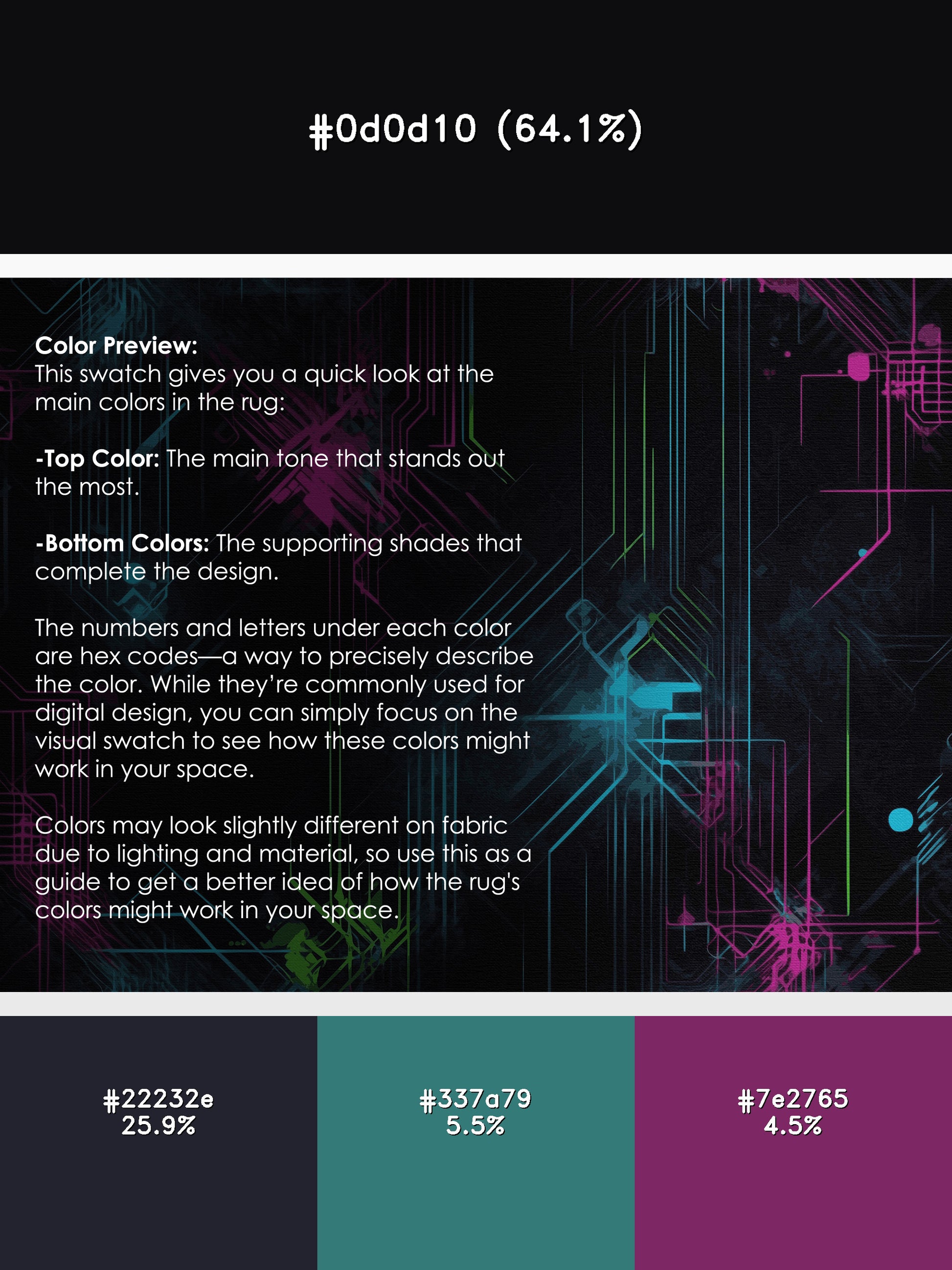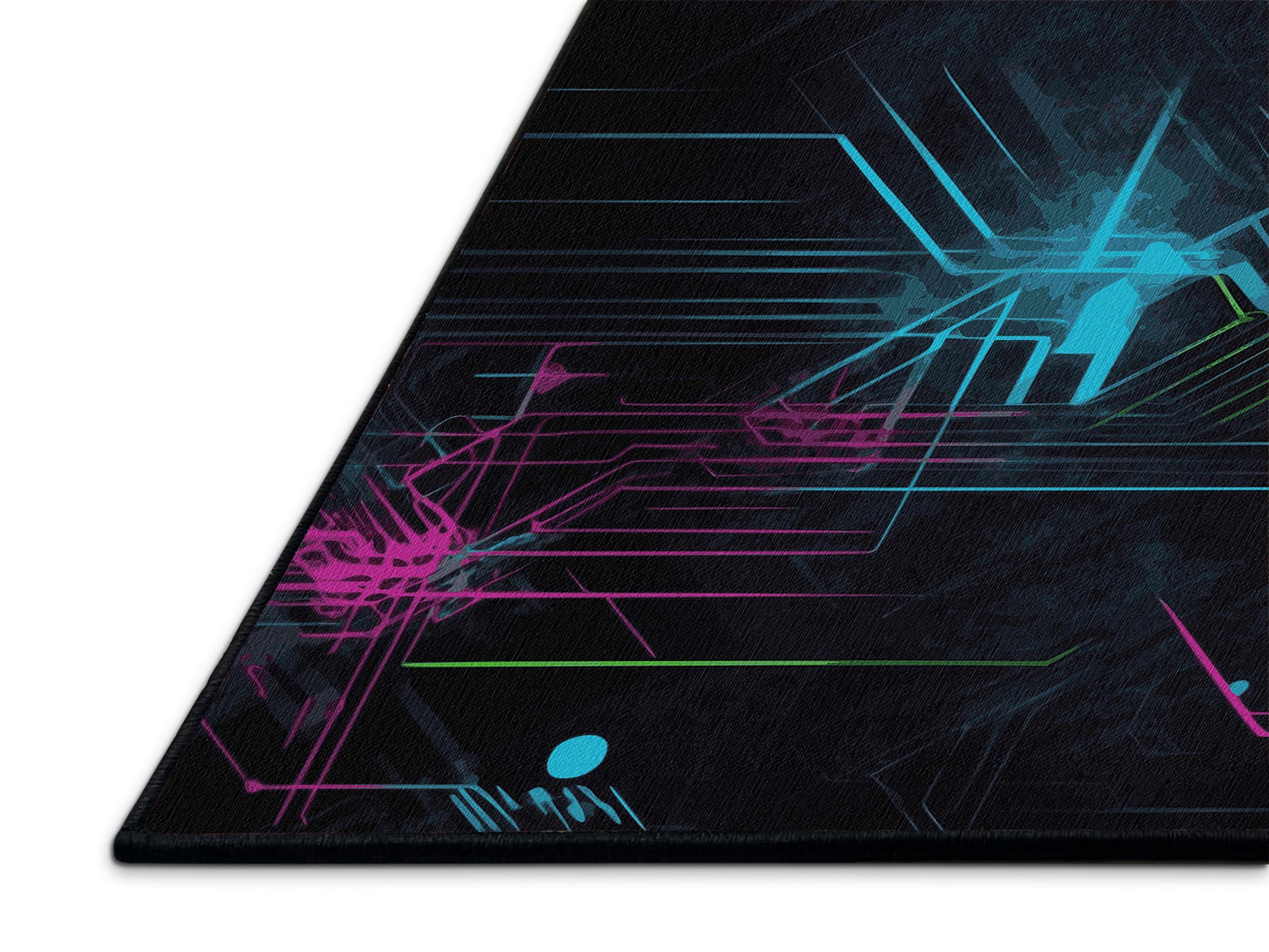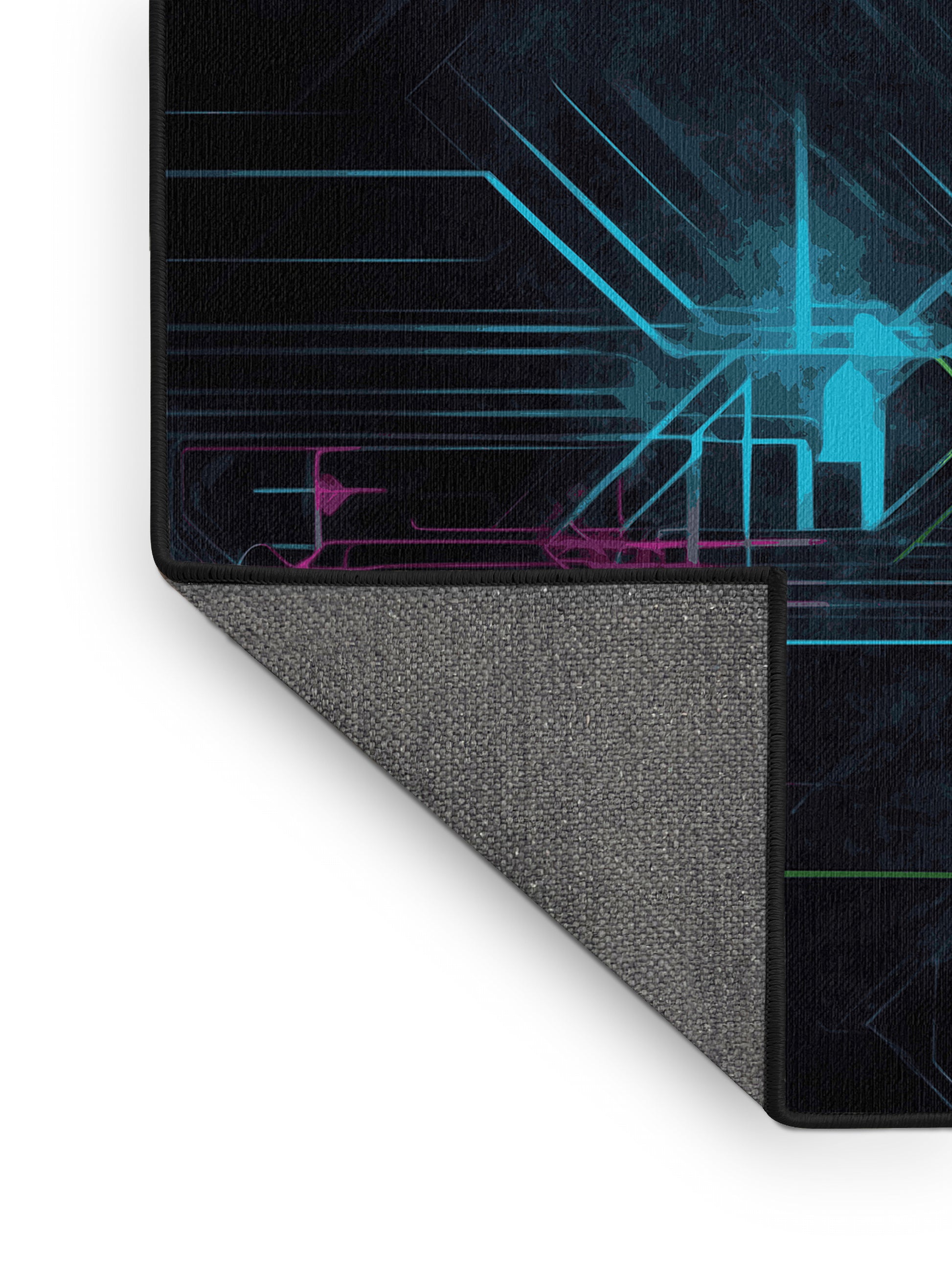 Radiant Charge from the Neon Nexus collection electrifies your space with its bold Charcoal Blue color (A dark, muted blue with gray undertones, sleek and understated.), a striking tone in the Blue color family. Inspired by neon-lit cityscapes and cyberpunk design, this rug features sharp geometric patterns and dynamic lines illuminated by vibrant, electric hues. Finished with Black serging a sleek edge that enhances its futuristic appeal this rug is crafted from premium polyester and machine-made in the USA with imported materials. Perfect for modern gaming rooms, creative studios, or contemporary living spaces, this design balances cutting-edge energy with adaptable elegance. Available in multiple sizes, the Neon Nexus collection transforms any room into a bold statement of innovation and style, channeling the vibrant glow of a cyberpunk universe.