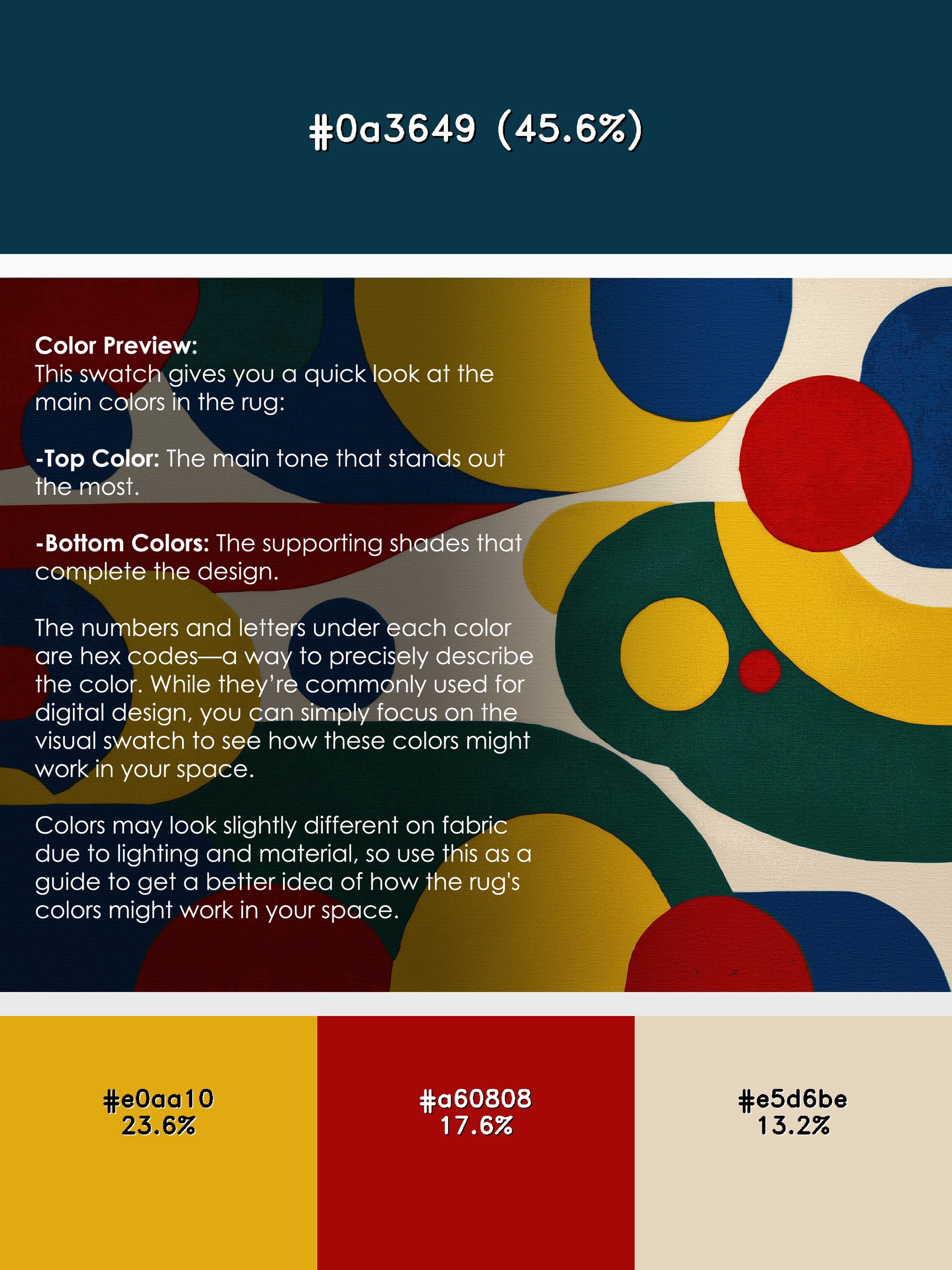 Radiant Shimmer from the Retro Ruckus collection revives the bold, playful charm of mid-century modern design with its captivating Deep Sea Blue color (A deep, dark blue reminiscent of the ocean depths.), a vibrant tone in the Blue color family. Featuring a dynamic mix of geometric patterns, freeform swirls, and abstract shapes, this rug brings a nostalgic yet modern aesthetic to your space. Finished with Navy serging a durable edge that enhances its retro flair this rug is crafted from premium polyester and machine-made in the USA with imported materials. Perfect for eclectic living rooms, creative studios, or retro-inspired dining areas, this design adds warmth, personality, and energy to your decor. Available in multiple sizes, the Retro Ruckus collection seamlessly blends vintage aesthetics with contemporary functionality, transforming your home with its unique style and durable comfort.