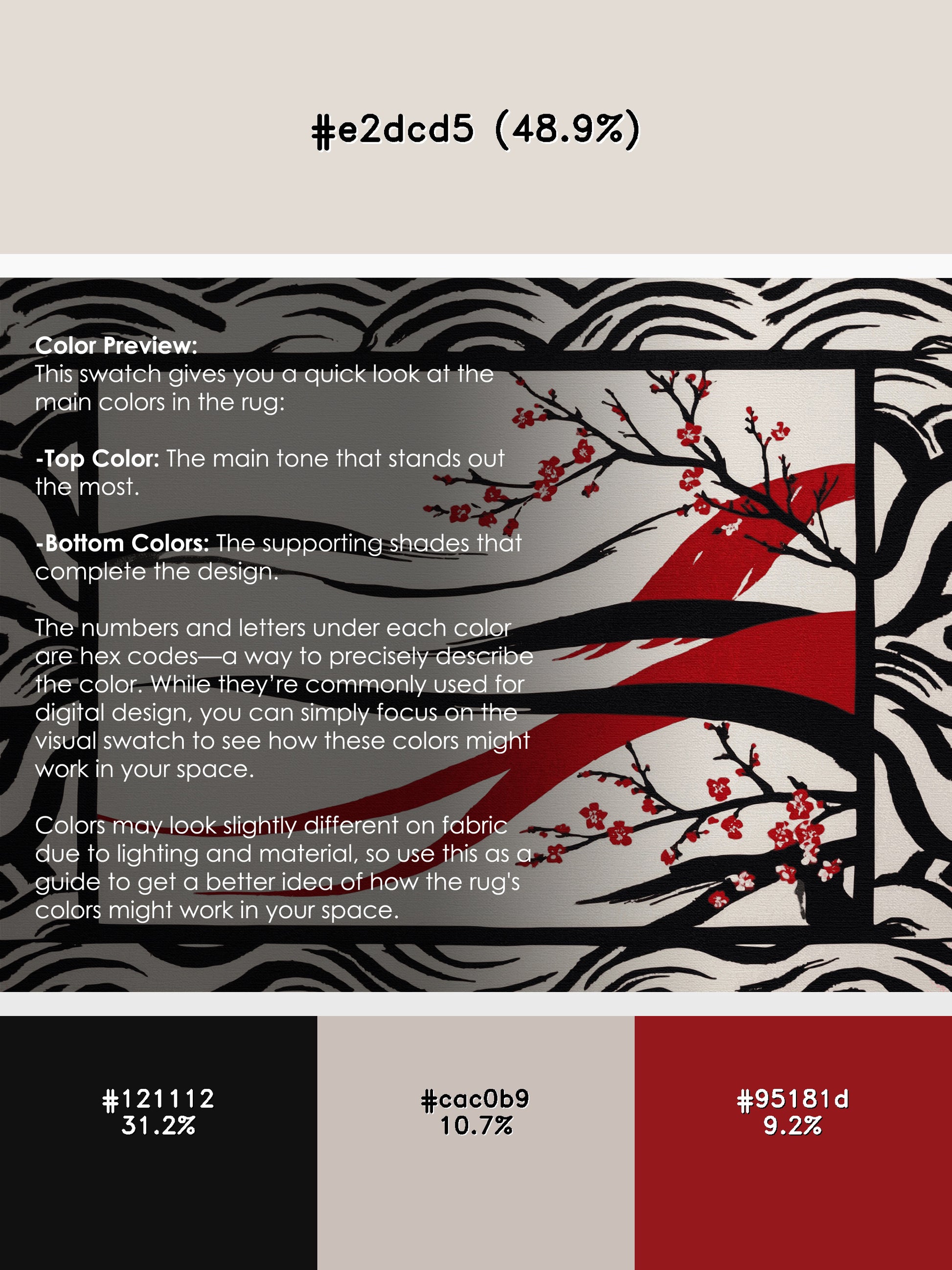 Red Dawn from the Sakura Waves collection captures the timeless elegance of Japanese artistry with its captivating Dark White color (A muted white with soft grayish tones, calm and neutral.), a refined tone in the White color family. Featuring delicate cherry blossom motifs and flowing wave-inspired patterns, this rug evokes the serene beauty of nature and the transient charm of sakura in bloom. Finished with White serging a durable edge that enhances its artistic appeal this rug is crafted from premium polyester and machine-made in the USA with imported materials. Perfect for minimalist living rooms, tranquil bedrooms, or zen-inspired spaces, this design blends cultural sophistication with modern functionality. Available in multiple sizes, the Sakura Waves collection transforms your home into a serene retreat, balancing artistic expression and versatile style seamlessly.