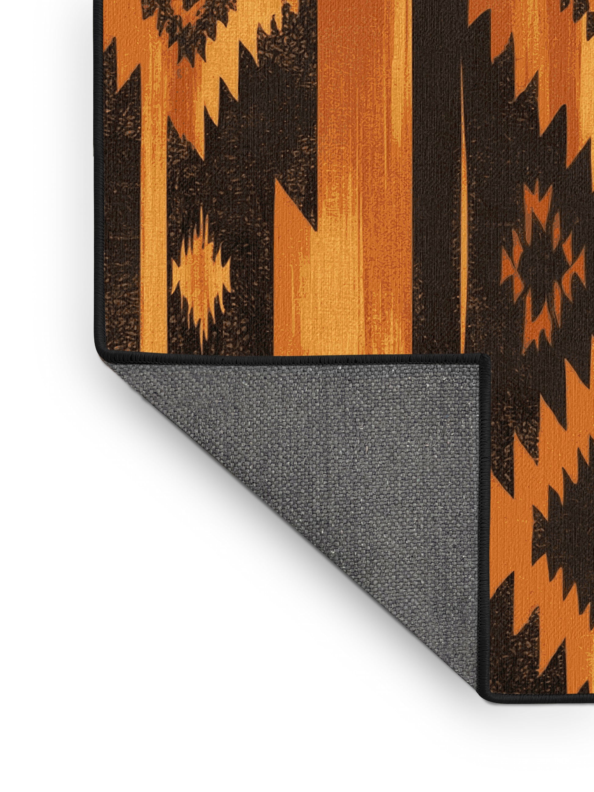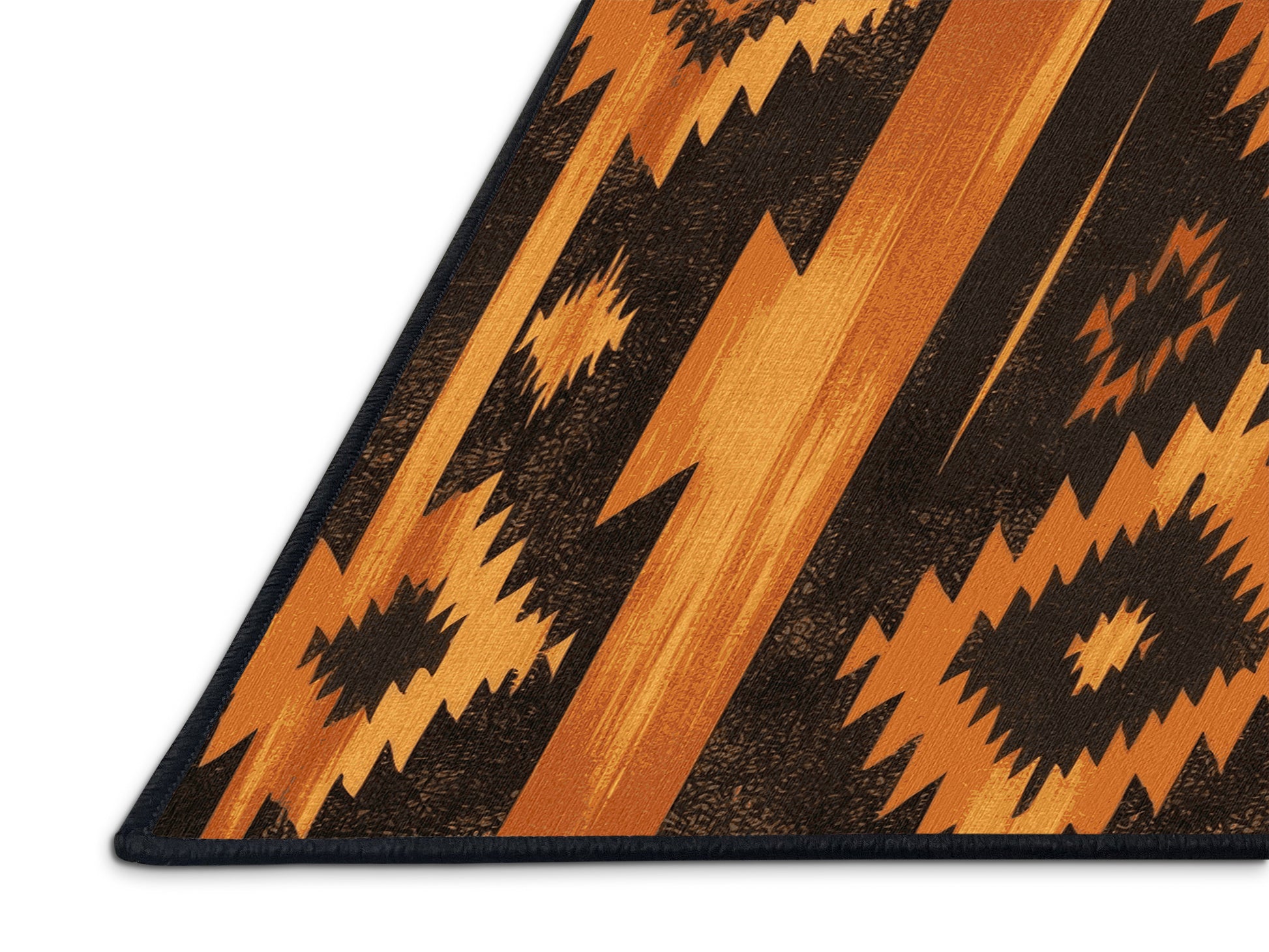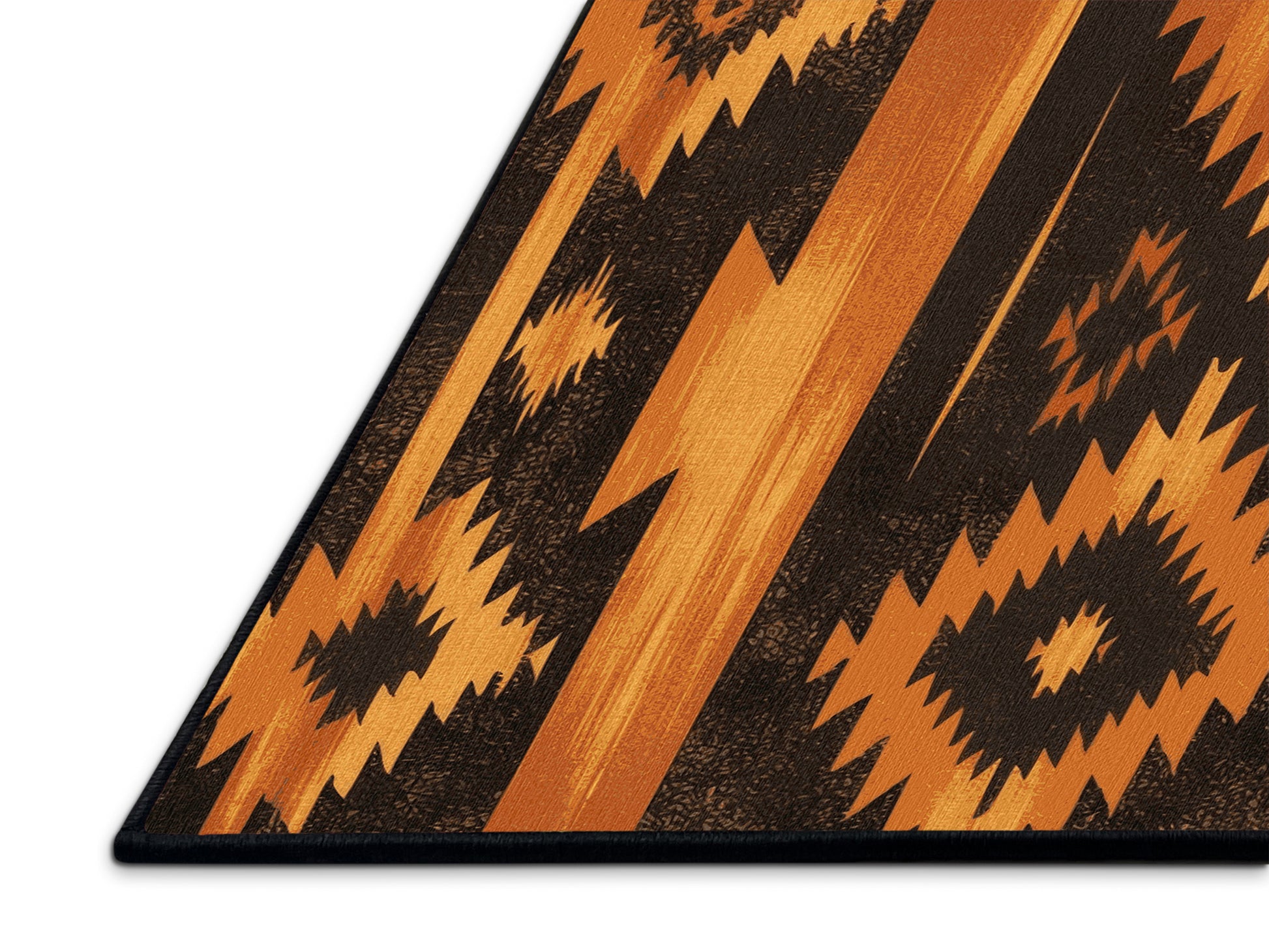 Roaming Ridge from the Heritage Southwest collection captures the rugged charm of the American Southwest with its bold Midnight color (A deep, dark color with subtle red undertones, mysterious and bold.), a striking tone in the Black color family. Inspired by traditional Navajo artistry and desert landscapes, this rug features geometric patterns and tribal-inspired designs that evoke cultural heritage and timeless beauty. Finished with Black serging a durable stitched edge that prevents fraying and enhances its rustic appeal this rug is crafted from premium polyester and machine-made in the USA with imported materials. Perfect for grounding a living room, adding warmth to a bedroom, or enhancing a dining area, this design seamlessly complements rustic, bohemian, or modern interiors. Available in multiple sizes, the Heritage Southwest collection brings the spirit of the desert into your home with its warm tones and artisanal charm.