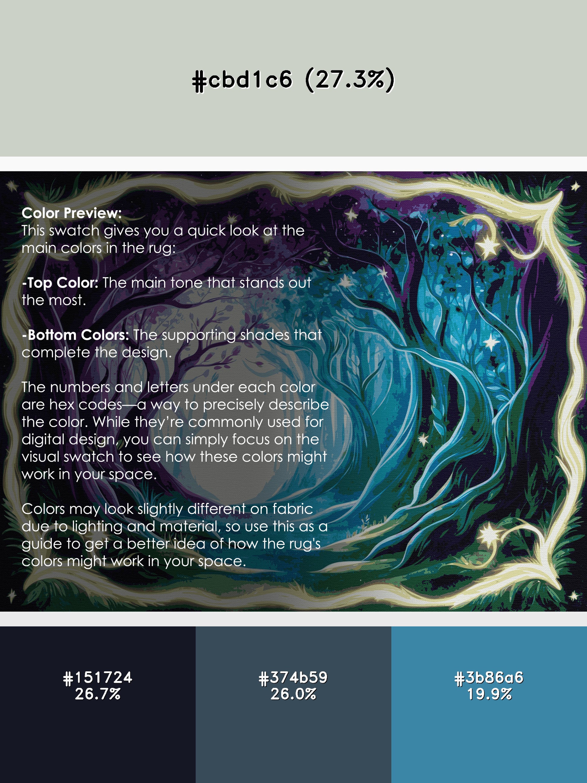 Secret Glade from the Mystic Grove collection captures the tranquil essence of lush forest canopies with its stunning Beetle Green color (A medium green inspired by the iridescence of beetles.), a calming tone in the Green color family. Inspired by flourishing greenery and woodland shadows, this rug features intricate leaf patterns, organic shapes, and layered designs that evoke depth and elegance. Finished with SkyBlue serging a durable edge that enhances its artisanal look this rug is crafted from premium polyester and machine-made in the USA with imported materials. Perfect for creating a serene retreat in living rooms, calming bedrooms, or artistic reading corners, this design brings a harmonious blend of nature and refinement to your space. Available in multiple sizes, the Mystic Grove collection transforms your home into a tranquil haven, offering timeless beauty and versatile style for modern or nature-inspired interiors.