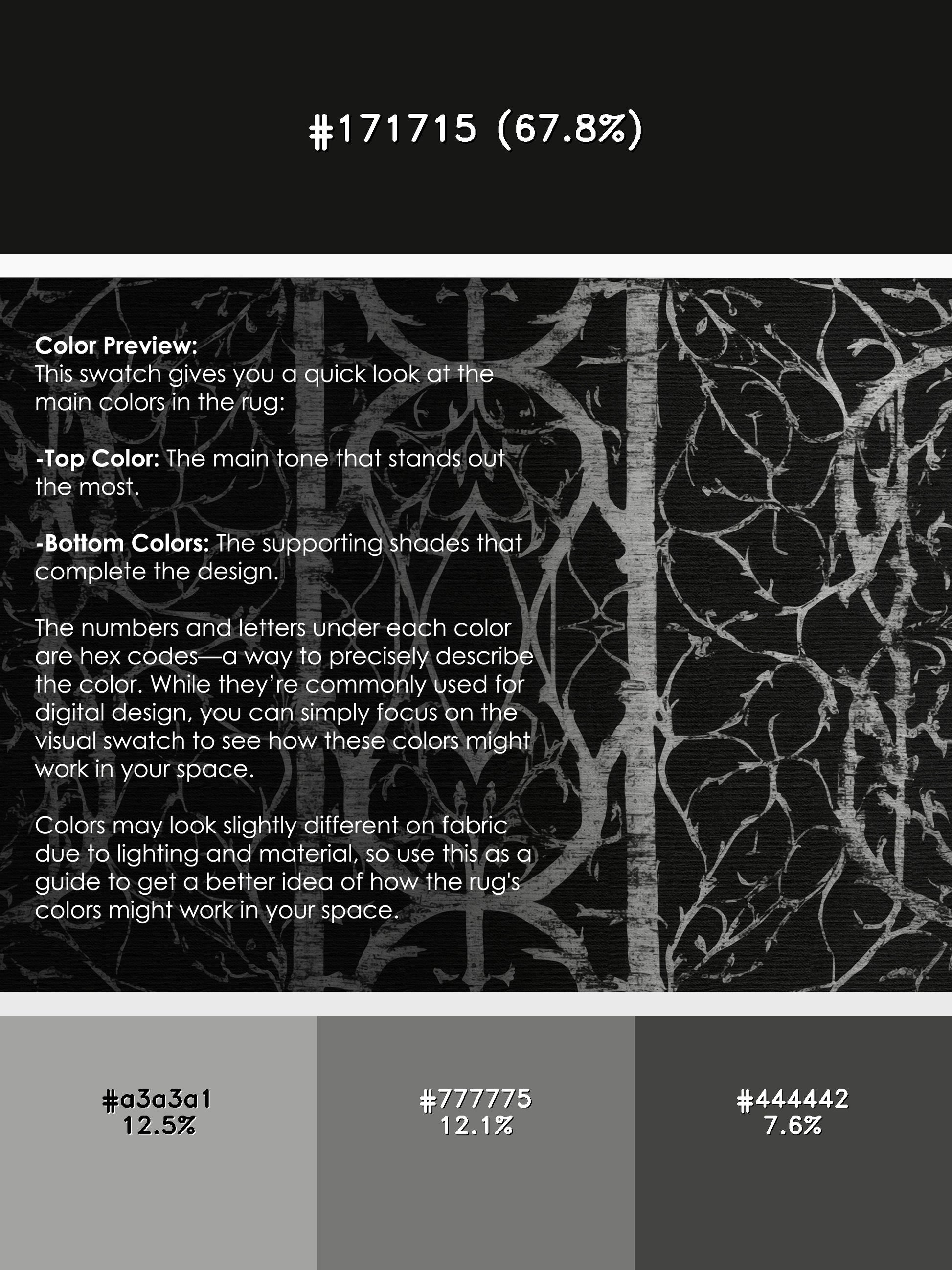 Shaded Grace from the Nocturne Elegance collection exudes timeless sophistication with its captivating Gunmetal Gray color (A cool, dark gray with a metallic feel, sleek and modern.), a rich tone in the Gray color family. Featuring intricate baroque-inspired patterns and swirling vine designs, this rug creates a sense of depth and refined elegance. Finished with Black serging a durable edge that enhances its luxurious aesthetic this rug is crafted from premium polyester and machine-made in the USA with imported materials. Perfect for formal dining rooms, chic living areas, or cozy bedrooms, this design balances bold drama with subtle charm, complementing both contemporary and traditional interiors. Available in multiple sizes, the Nocturne Elegance collection transforms your home into a haven of understated grandeur and classic refinement.