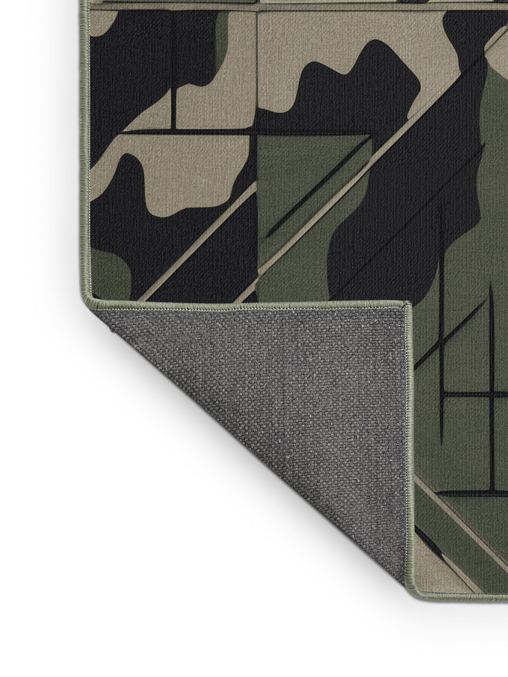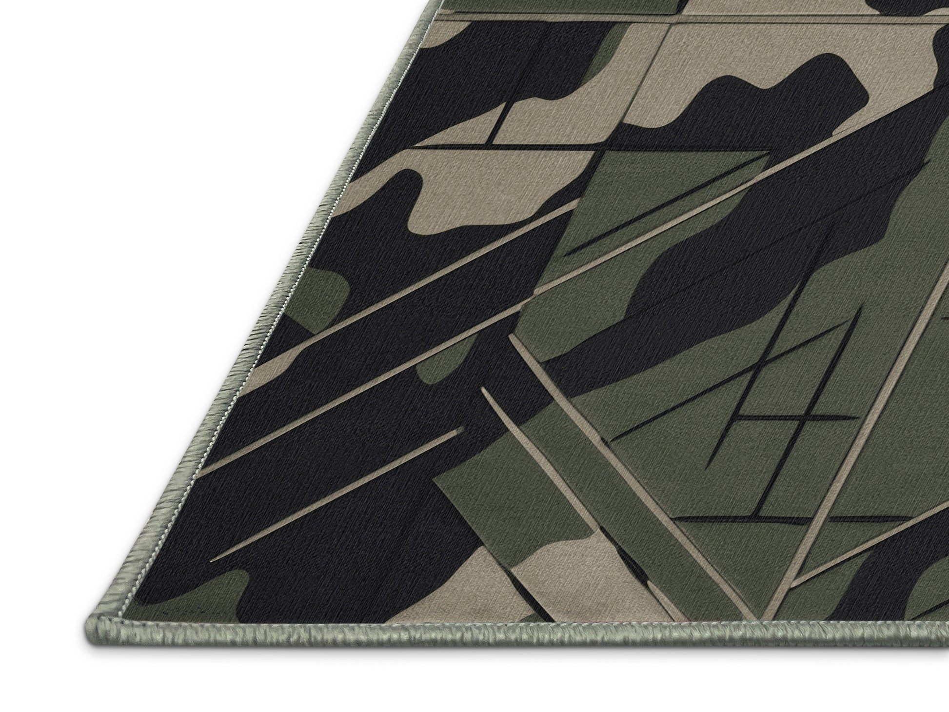 Shadow Flare from the Tactical Terrain collection brings rugged sophistication to your space with its striking Camouflage Green color (A muted and earthy green, perfect for outdoor and natural themes.), a bold tone in the Green color family. Inspired by military camouflage and geometric precision, this rug features angular motifs, sharp black gridlines, and a muted palette that evokes strength and resilience. Finished with SageGreen serging a durable edge that enhances its contemporary aesthetic this rug is crafted from premium polyester and machine-made in the USA with imported materials. Perfect for modern living rooms, industrial home offices, or creative studios, this design blends tactical flair with versatile style. Available in multiple sizes, the Tactical Terrain collection transforms your home with a distinctive edge and bold character, elevating any decor scheme.