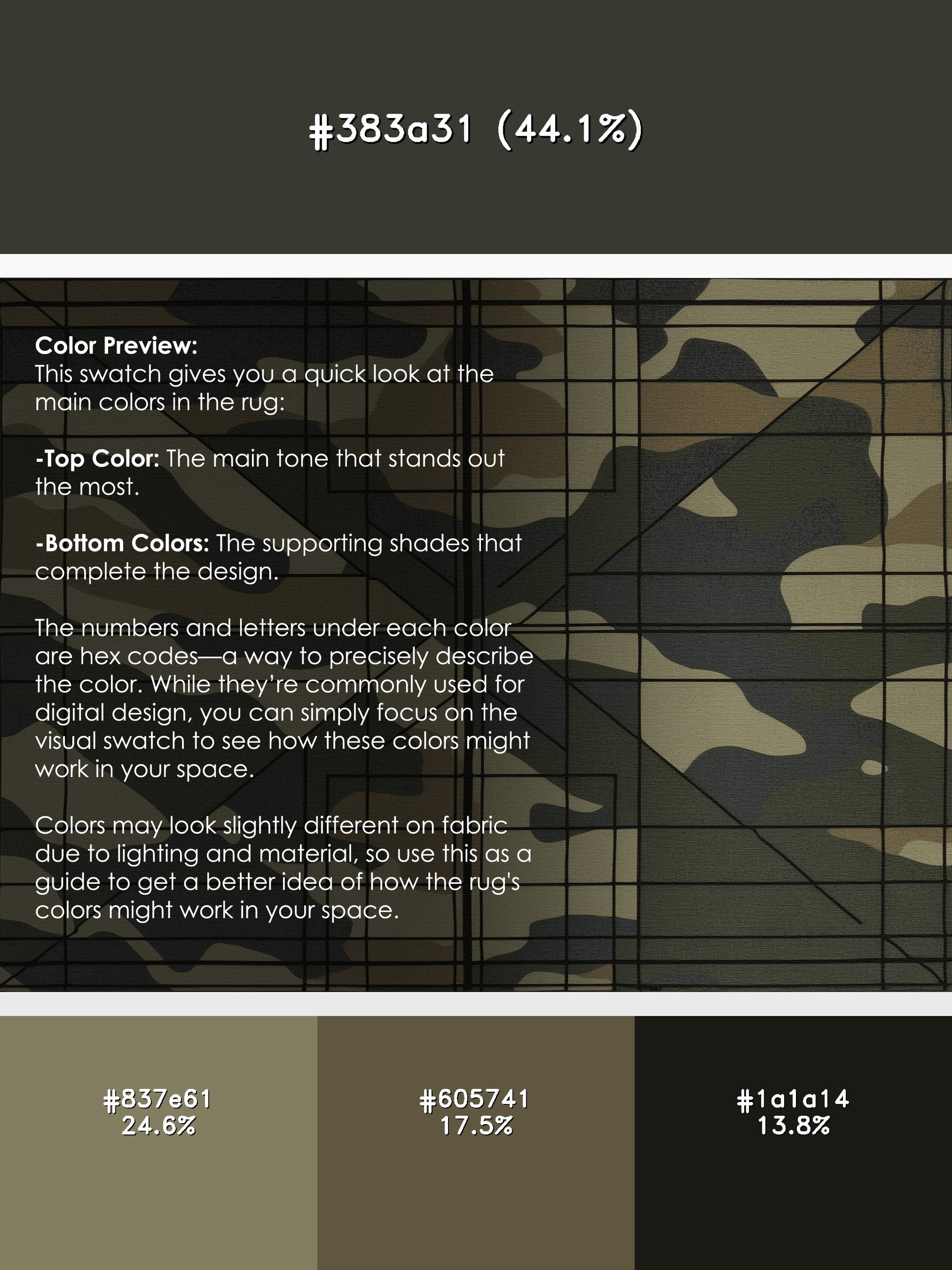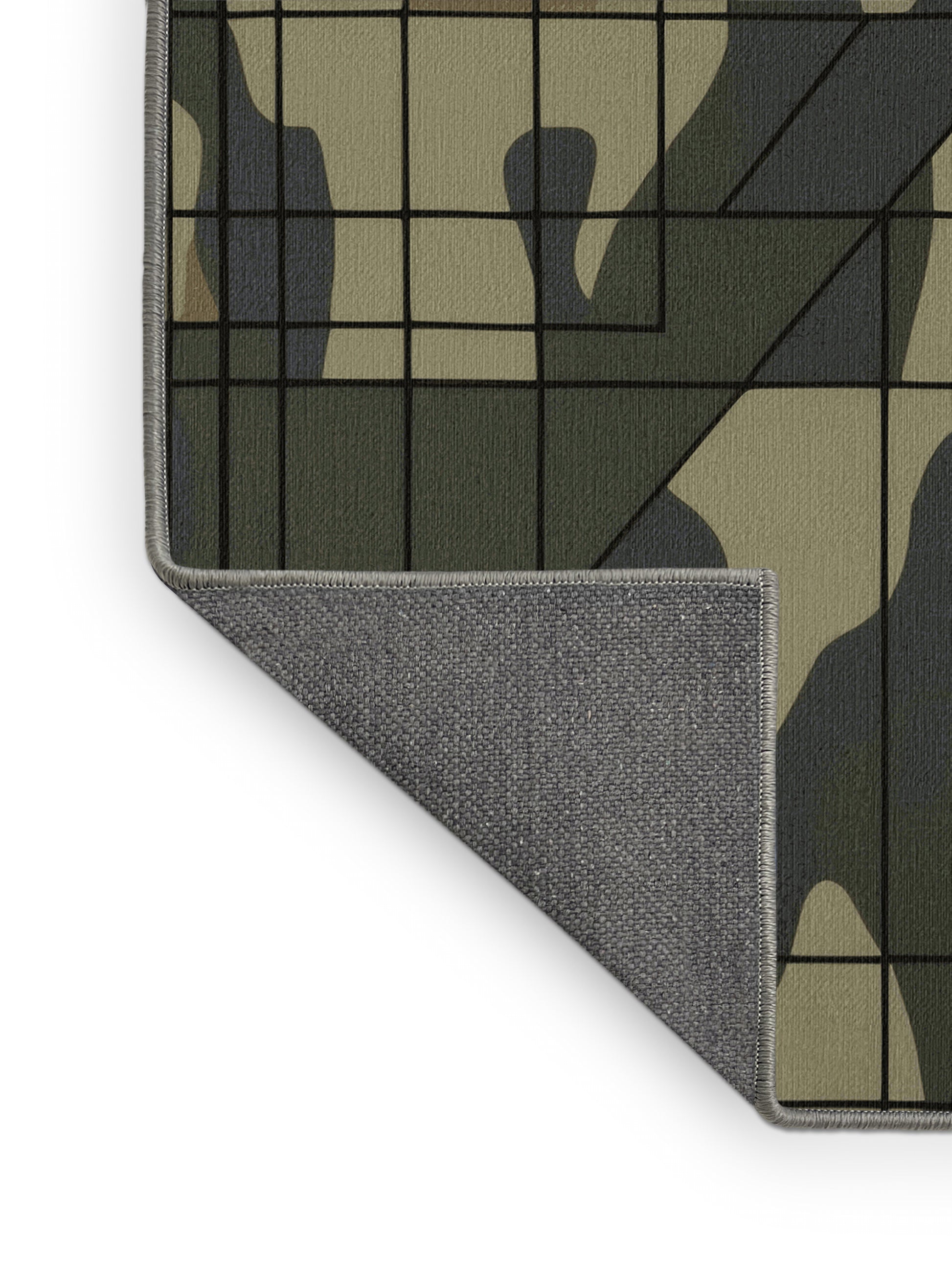 Shield Flow from the Tactical Terrain collection brings rugged sophistication to your space with its striking Sage Green color (A soft and muted green with a touch of gray, calm and soothing.), a bold tone in the Green color family. Inspired by military camouflage and geometric precision, this rug features angular motifs, sharp black gridlines, and a muted palette that evokes strength and resilience. Finished with Gray serging a durable edge that enhances its contemporary aesthetic this rug is crafted from premium polyester and machine-made in the USA with imported materials. Perfect for modern living rooms, industrial home offices, or creative studios, this design blends tactical flair with versatile style. Available in multiple sizes, the Tactical Terrain collection transforms your home with a distinctive edge and bold character, elevating any decor scheme.