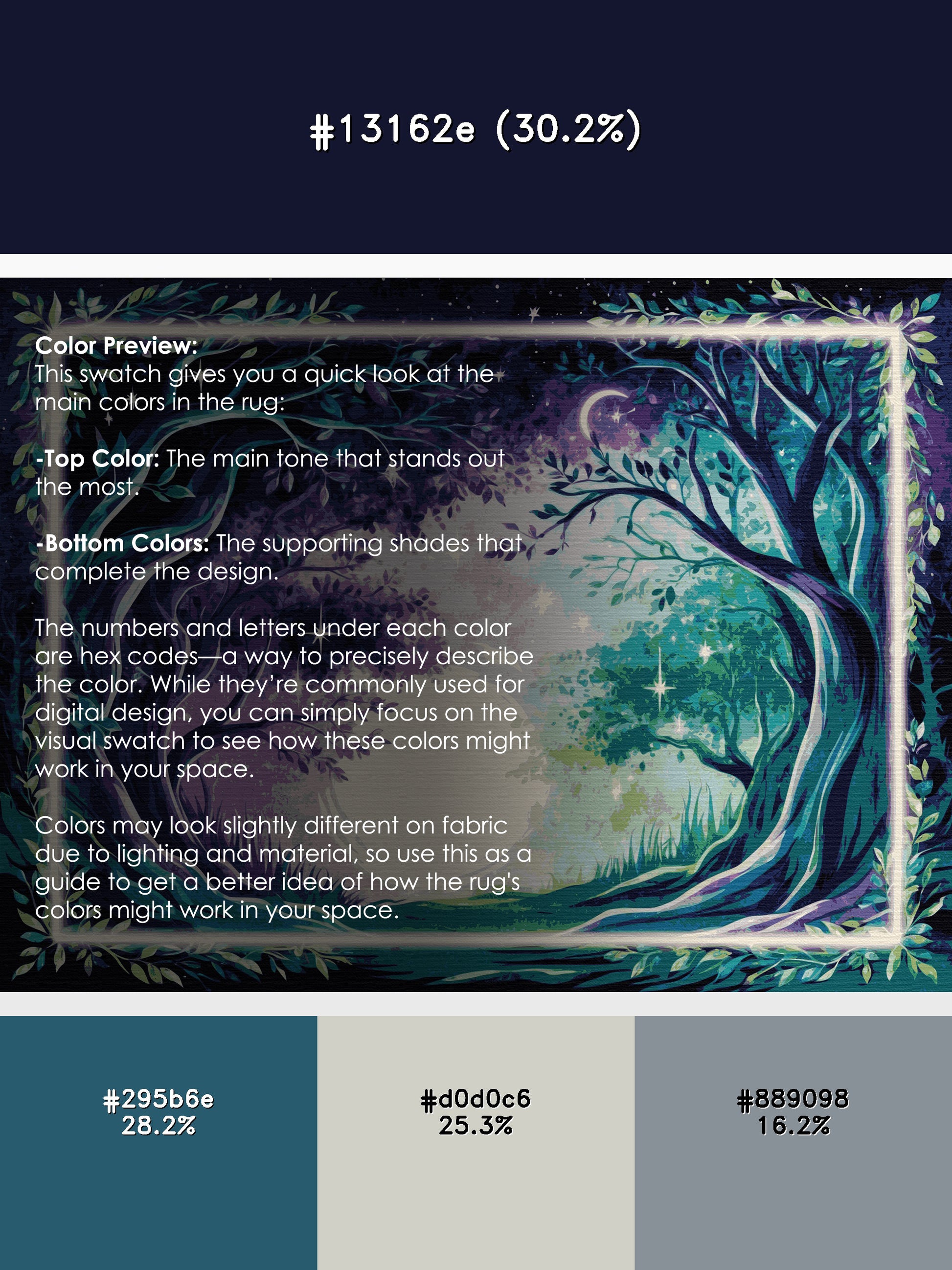 Shimmering Canopy from the Mystic Grove collection captures the tranquil essence of lush forest canopies with its stunning Dark Slate color (A dark slate blue with a cool and moody aesthetic.), a calming tone in the Blue color family. Inspired by flourishing greenery and woodland shadows, this rug features intricate leaf patterns, organic shapes, and layered designs that evoke depth and elegance. Finished with Black serging a durable edge that enhances its artisanal look this rug is crafted from premium polyester and machine-made in the USA with imported materials. Perfect for creating a serene retreat in living rooms, calming bedrooms, or artistic reading corners, this design brings a harmonious blend of nature and refinement to your space. Available in multiple sizes, the Mystic Grove collection transforms your home into a tranquil haven, offering timeless beauty and versatile style for modern or nature-inspired interiors.