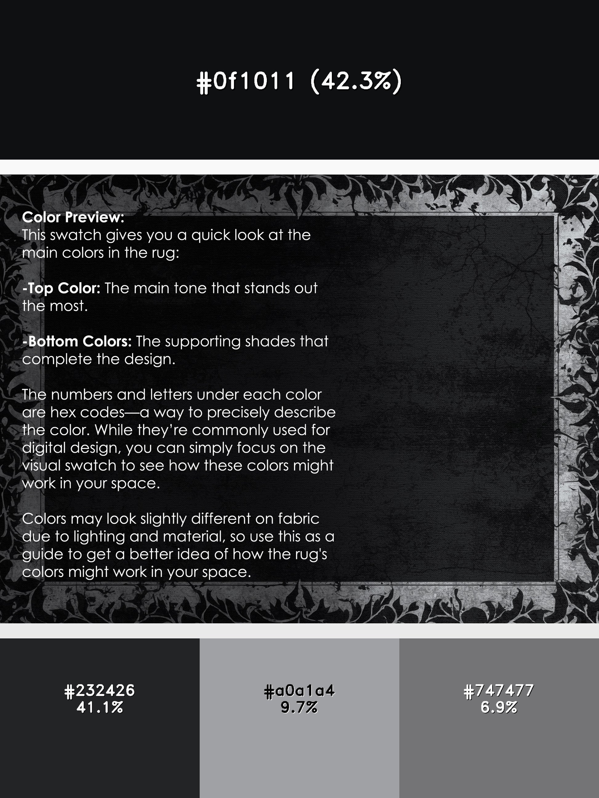 Shimmering Fog from the Nocturne Elegance collection exudes timeless sophistication with its captivating Midnight color (A deep, dark color with subtle red undertones, mysterious and bold.), a rich tone in the Black color family. Featuring intricate baroque-inspired patterns and swirling vine designs, this rug creates a sense of depth and refined elegance. Finished with Gray serging a durable edge that enhances its luxurious aesthetic this rug is crafted from premium polyester and machine-made in the USA with imported materials. Perfect for formal dining rooms, chic living areas, or cozy bedrooms, this design balances bold drama with subtle charm, complementing both contemporary and traditional interiors. Available in multiple sizes, the Nocturne Elegance collection transforms your home into a haven of understated grandeur and classic refinement.