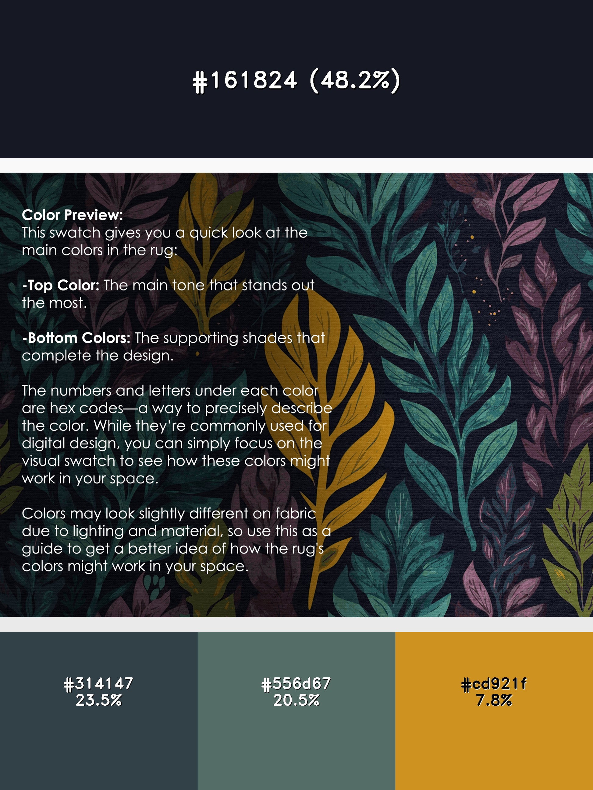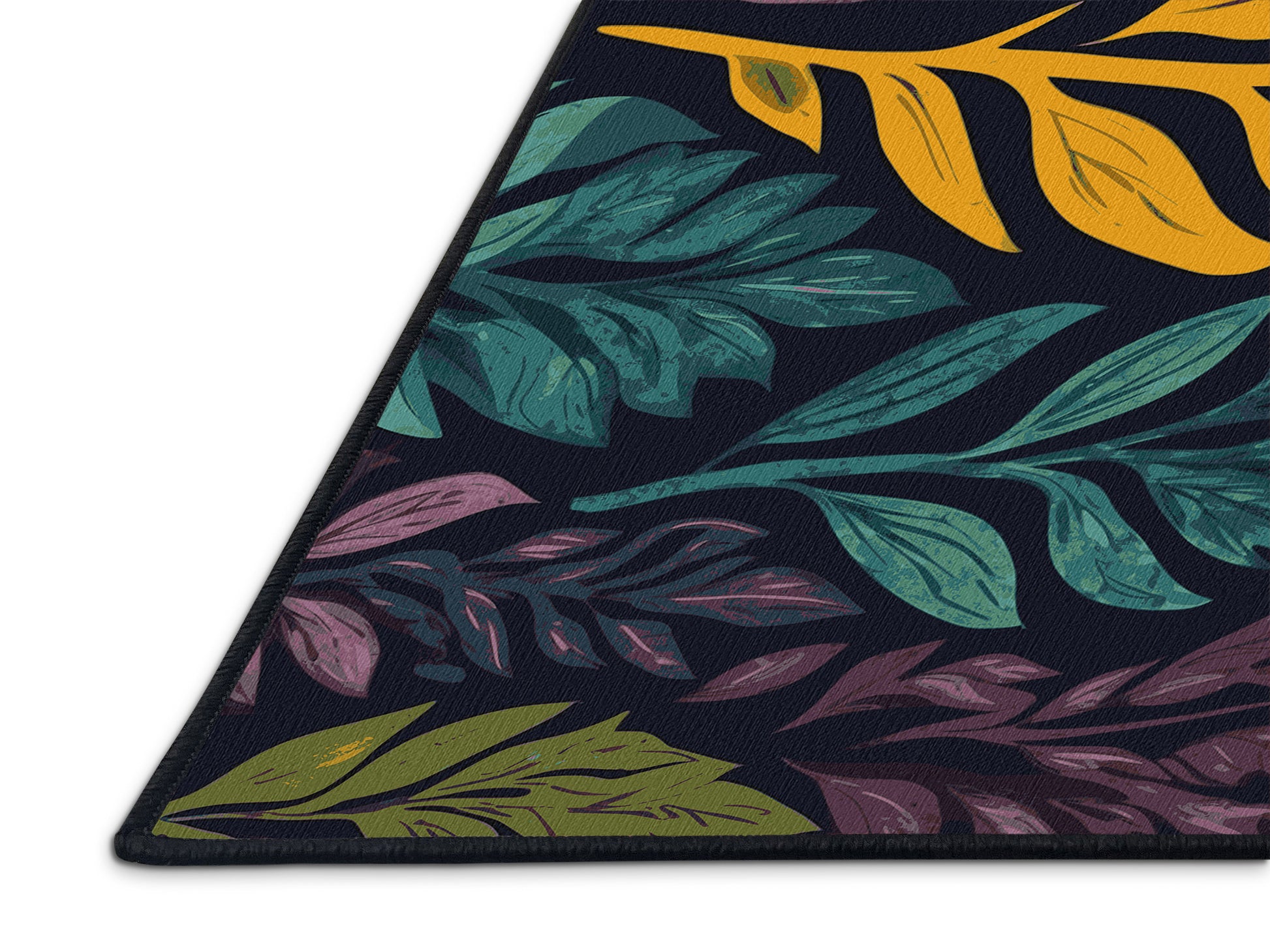Shimmering Glade from the Mystic Grove collection captures the tranquil essence of lush forest canopies with its stunning Dark Slate color (A dark slate blue with a cool and moody aesthetic.), a calming tone in the Blue color family. Inspired by flourishing greenery and woodland shadows, this rug features intricate leaf patterns, organic shapes, and layered designs that evoke depth and elegance. Finished with Black serging a durable edge that enhances its artisanal look this rug is crafted from premium polyester and machine-made in the USA with imported materials. Perfect for creating a serene retreat in living rooms, calming bedrooms, or artistic reading corners, this design brings a harmonious blend of nature and refinement to your space. Available in multiple sizes, the Mystic Grove collection transforms your home into a tranquil haven, offering timeless beauty and versatile style for modern or nature-inspired interiors.