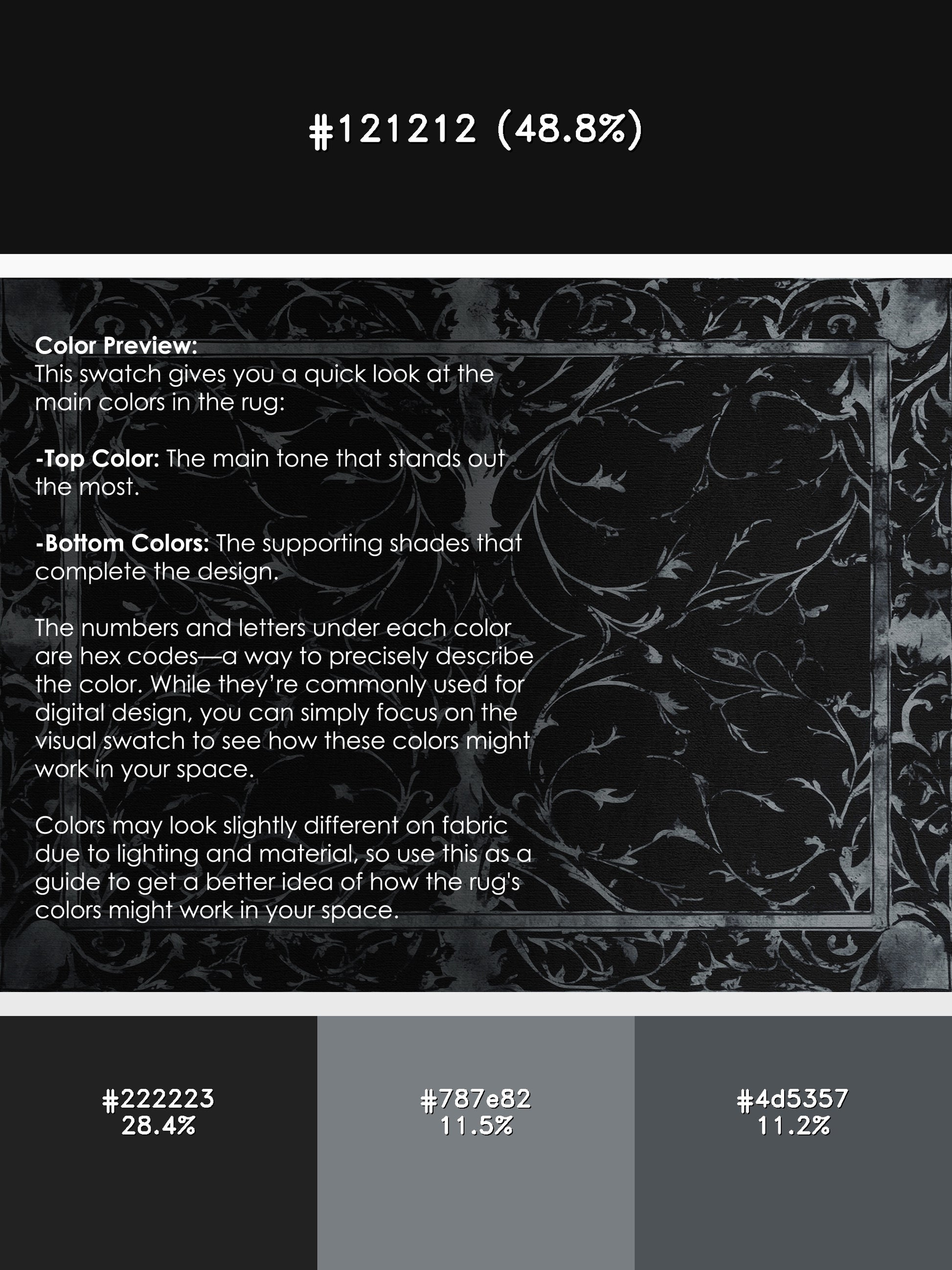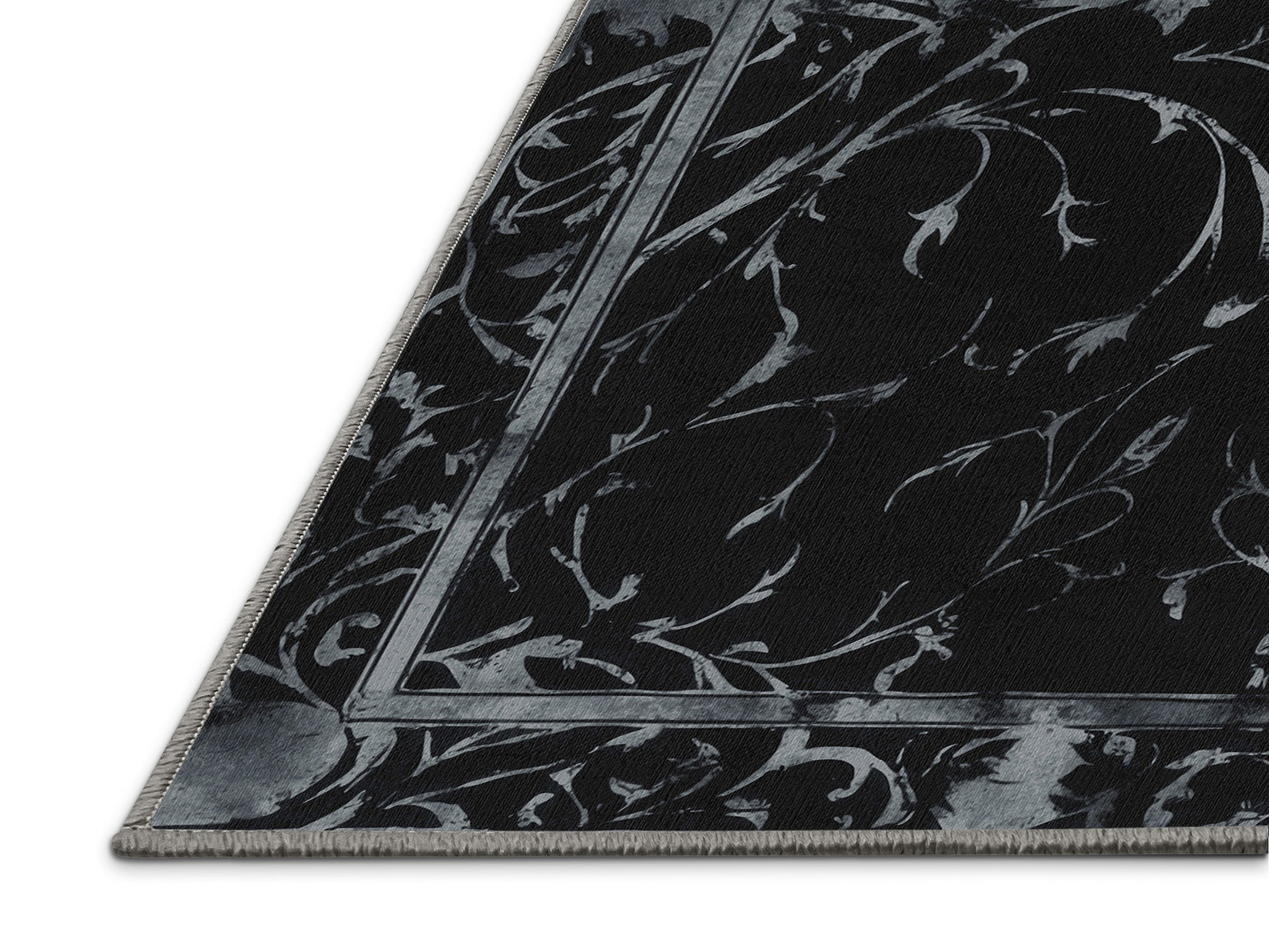 Smoky Twilight from the Nocturne Elegance collection exudes timeless sophistication with its captivating Midnight color (A deep, dark color with subtle red undertones, mysterious and bold.), a rich tone in the Black color family. Featuring intricate baroque-inspired patterns and swirling vine designs, this rug creates a sense of depth and refined elegance. Finished with Gray serging a durable edge that enhances its luxurious aesthetic this rug is crafted from premium polyester and machine-made in the USA with imported materials. Perfect for formal dining rooms, chic living areas, or cozy bedrooms, this design balances bold drama with subtle charm, complementing both contemporary and traditional interiors. Available in multiple sizes, the Nocturne Elegance collection transforms your home into a haven of understated grandeur and classic refinement.