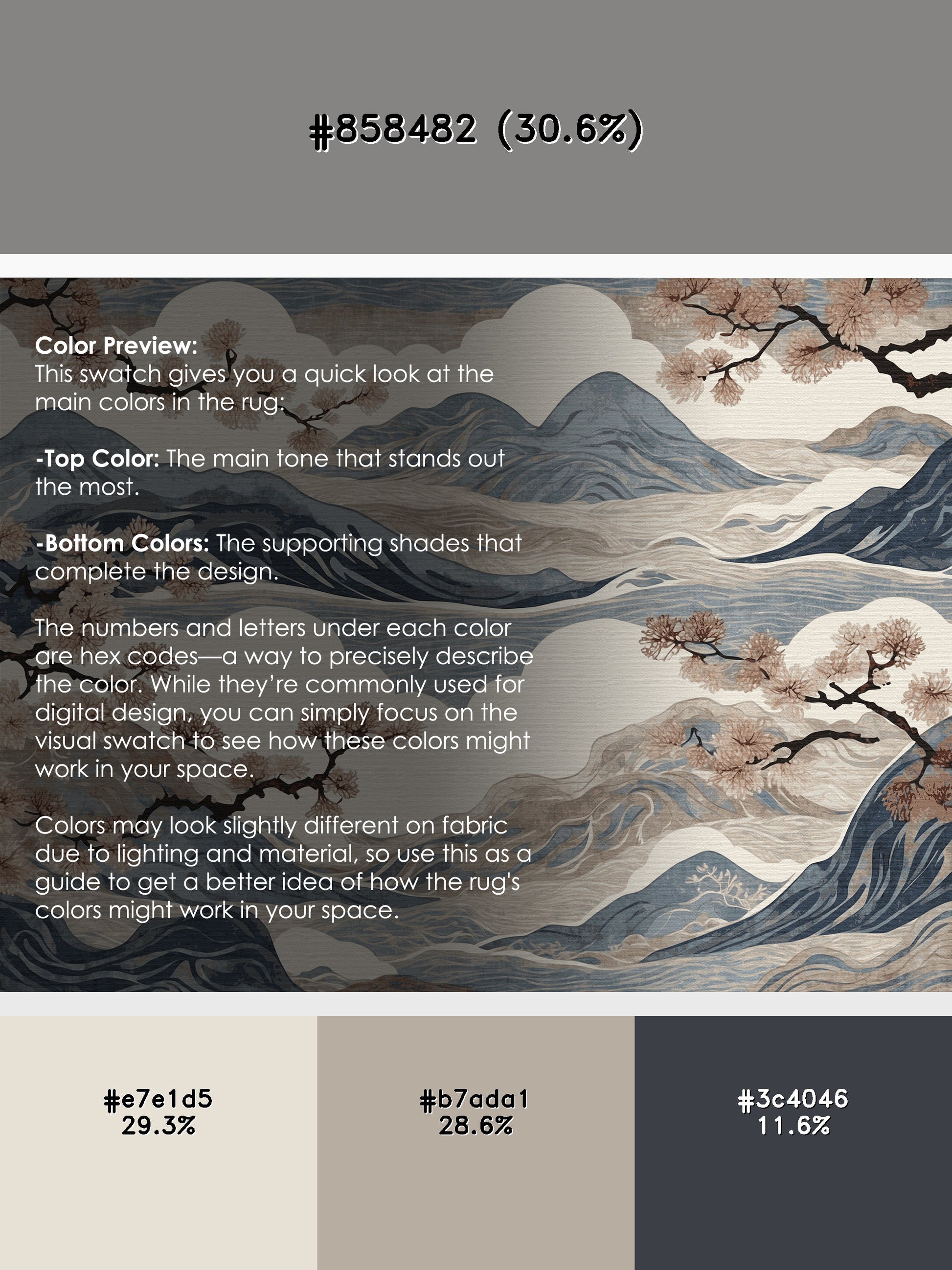 Soft Blossom from the Sakura Waves collection captures the timeless elegance of Japanese artistry with its captivating Granite color (A warm, earthy gray inspired by natural stone textures.), a refined tone in the Gray color family. Featuring delicate cherry blossom motifs and flowing wave-inspired patterns, this rug evokes the serene beauty of nature and the transient charm of sakura in bloom. Finished with Gray serging a durable edge that enhances its artistic appeal this rug is crafted from premium polyester and machine-made in the USA with imported materials. Perfect for minimalist living rooms, tranquil bedrooms, or zen-inspired spaces, this design blends cultural sophistication with modern functionality. Available in multiple sizes, the Sakura Waves collection transforms your home into a serene retreat, balancing artistic expression and versatile style seamlessly.