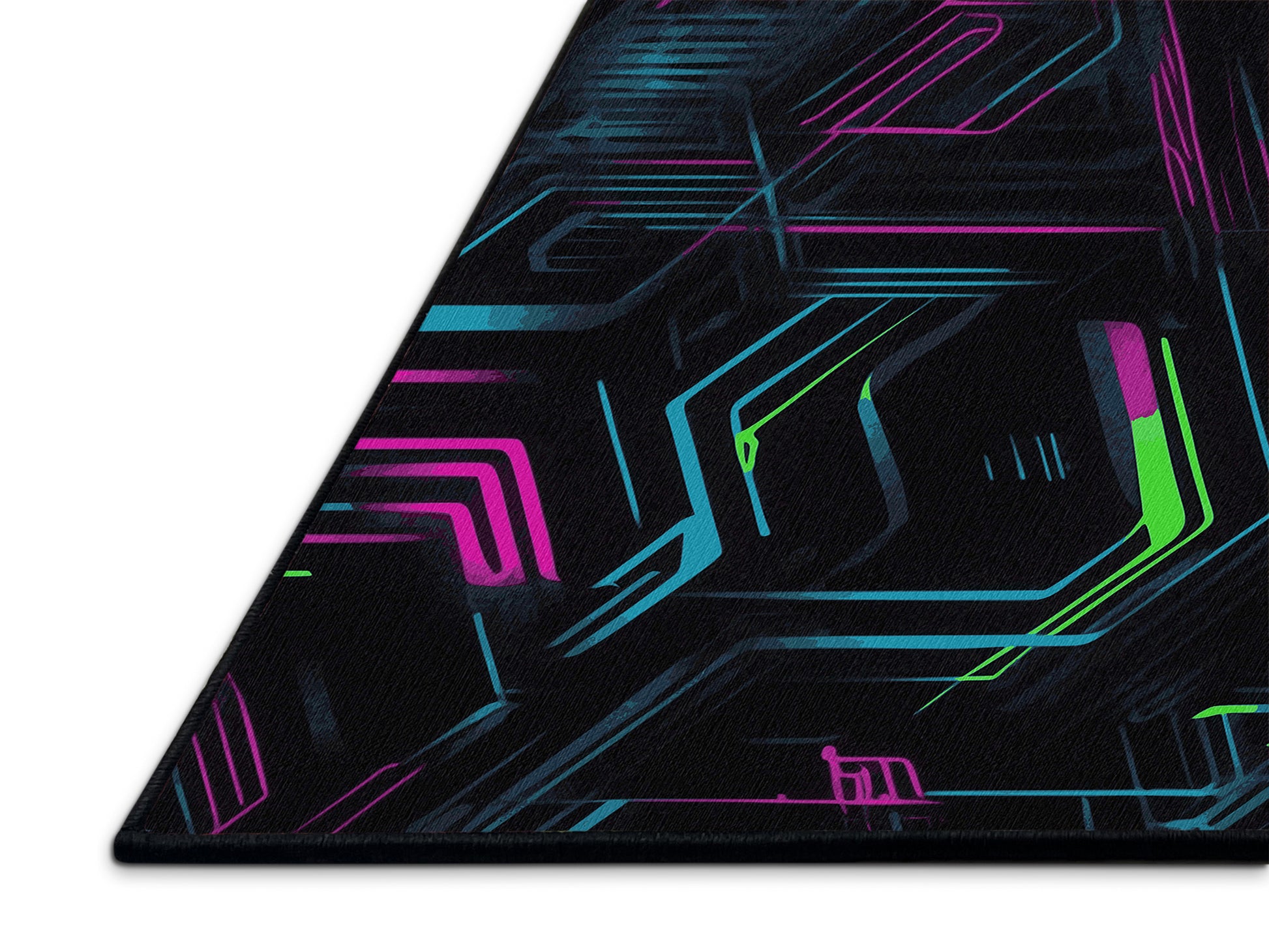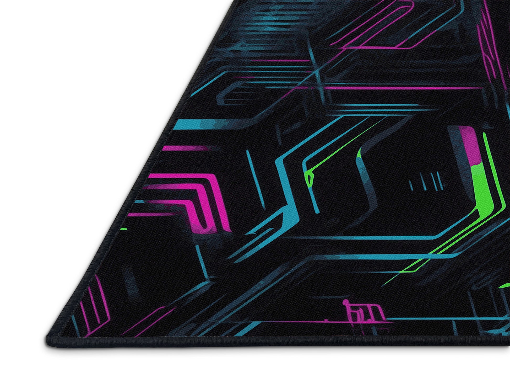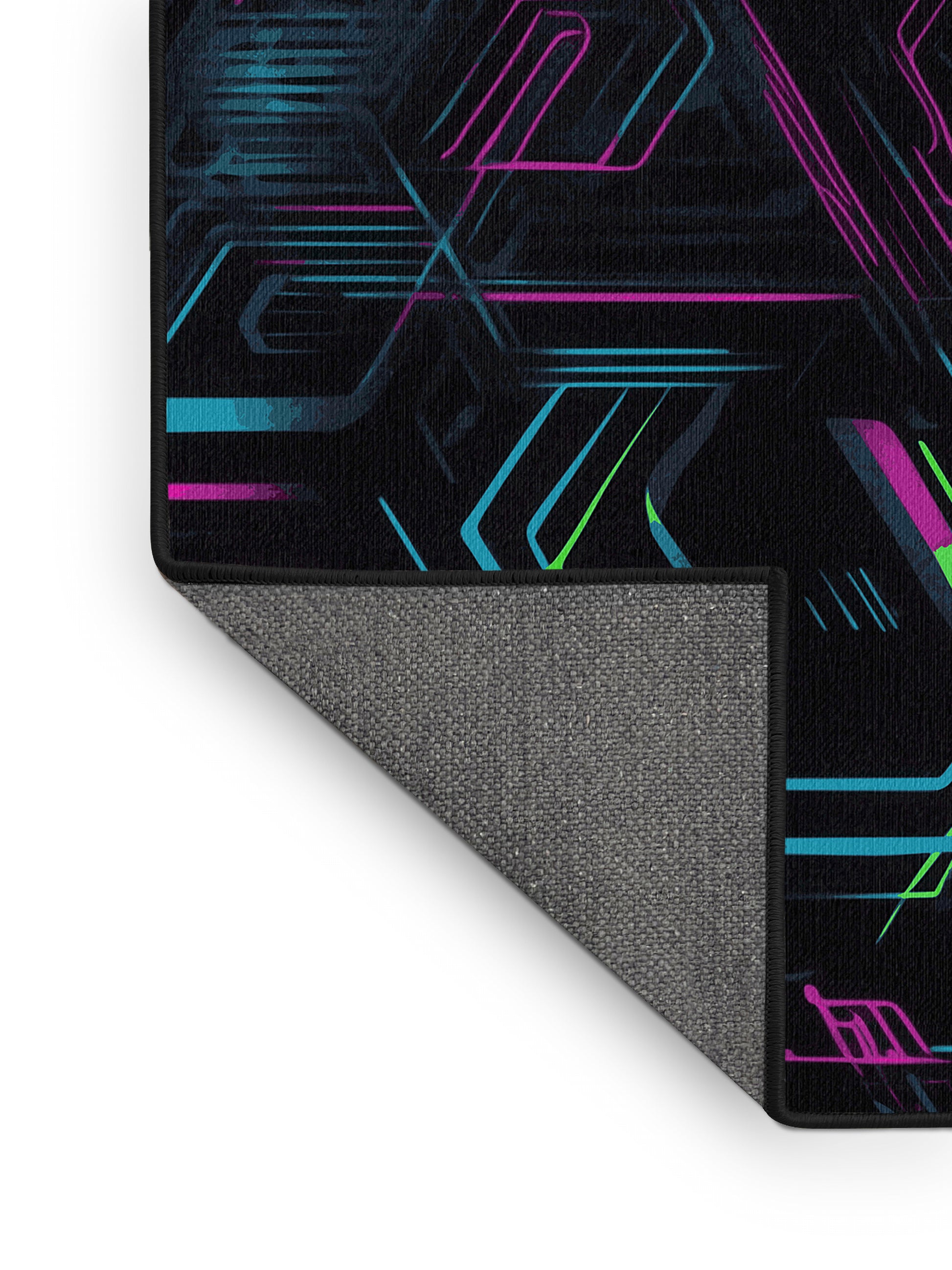 Spectrum Beats from the Neon Nexus collection electrifies your space with its bold Charcoal Blue color (A dark, muted blue with gray undertones, sleek and understated.), a striking tone in the Blue color family. Inspired by neon-lit cityscapes and cyberpunk design, this rug features sharp geometric patterns and dynamic lines illuminated by vibrant, electric hues. Finished with Black serging a sleek edge that enhances its futuristic appeal this rug is crafted from premium polyester and machine-made in the USA with imported materials. Perfect for modern gaming rooms, creative studios, or contemporary living spaces, this design balances cutting-edge energy with adaptable elegance. Available in multiple sizes, the Neon Nexus collection transforms any room into a bold statement of innovation and style, channeling the vibrant glow of a cyberpunk universe.
