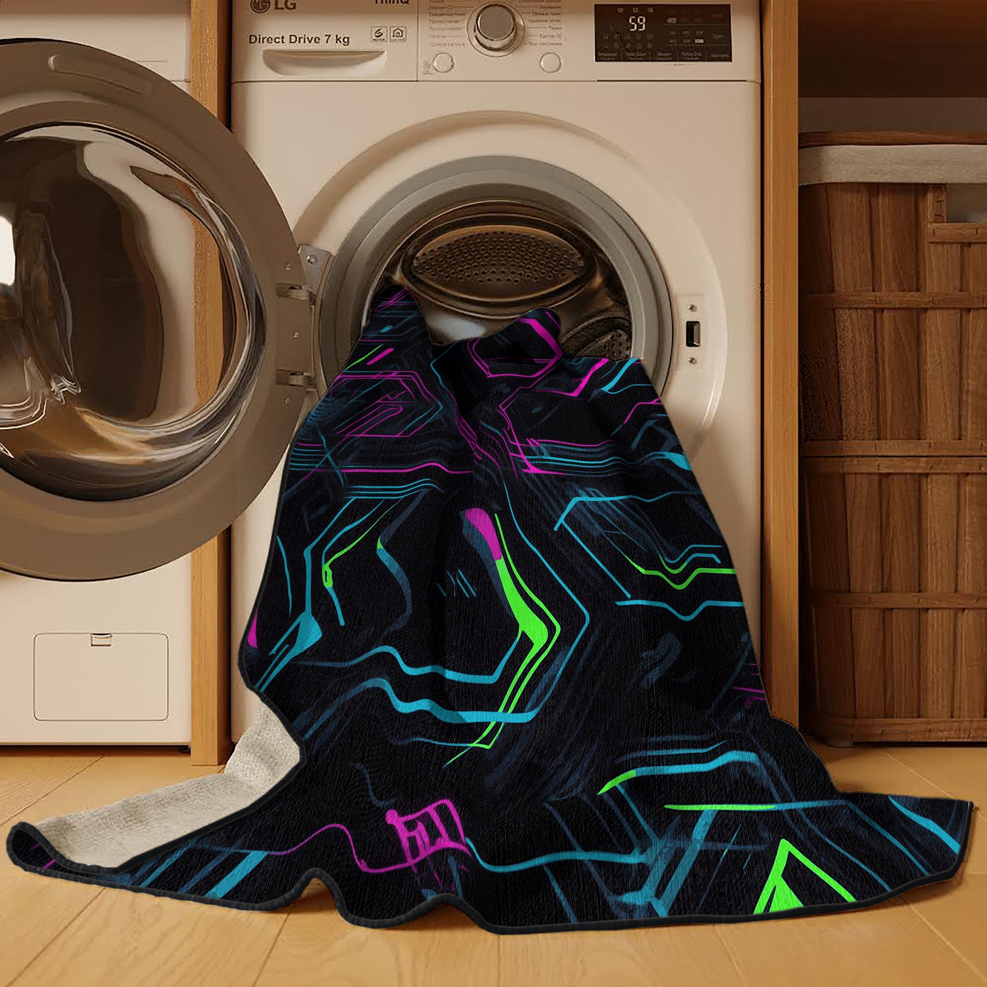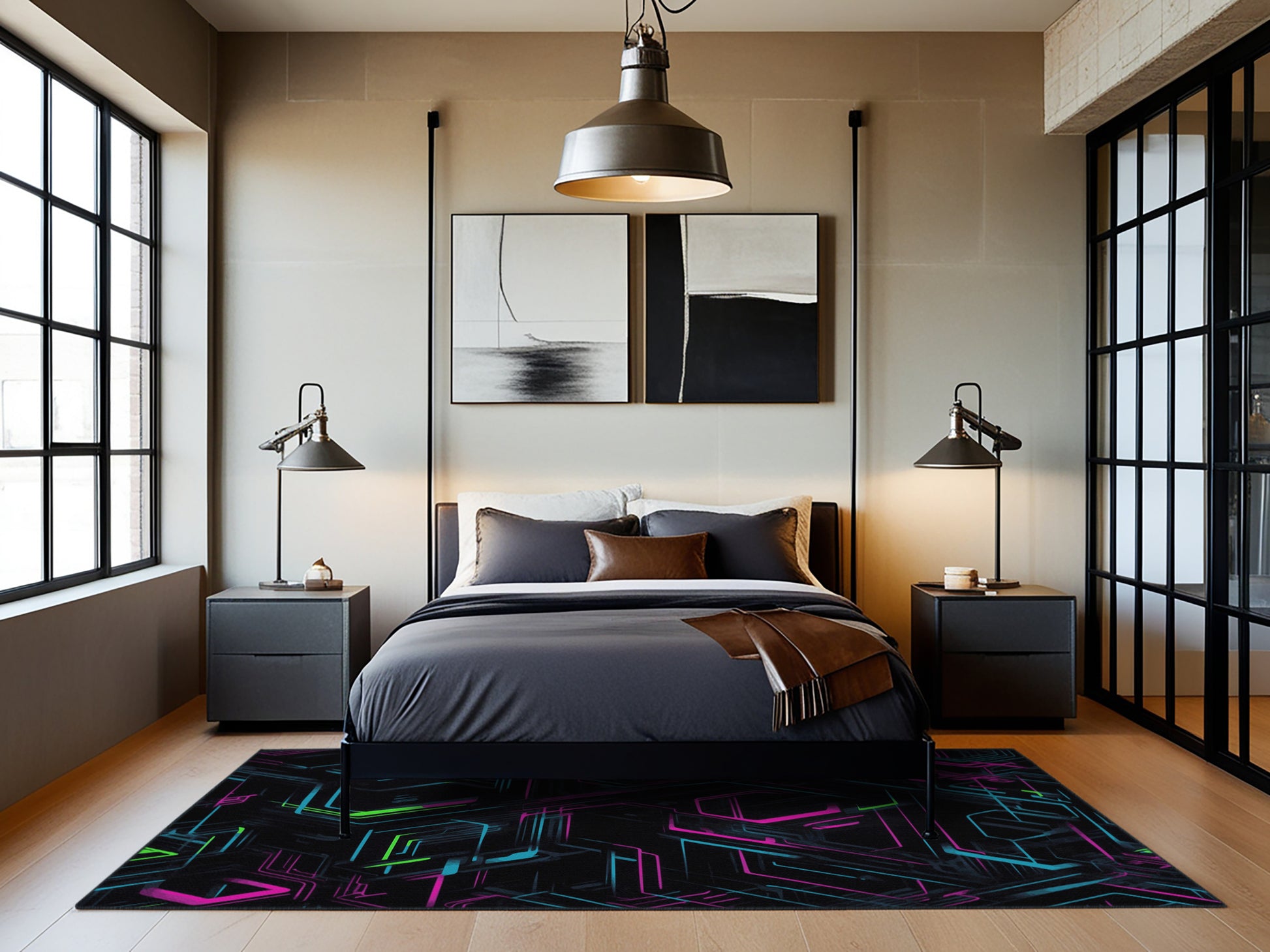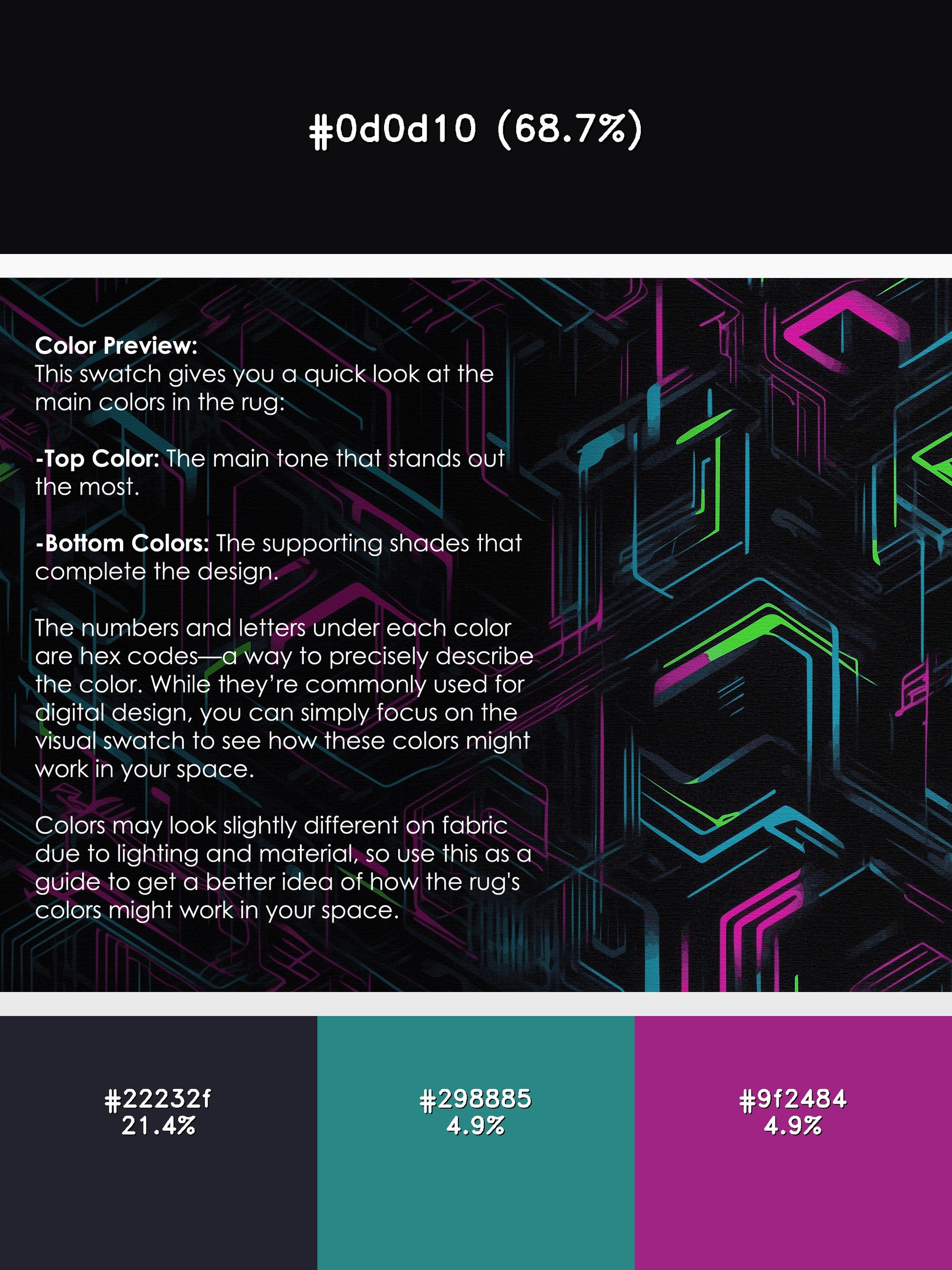 Spectrum Beats from the Neon Nexus collection electrifies your space with its bold Charcoal Blue color (A dark, muted blue with gray undertones, sleek and understated.), a striking tone in the Blue color family. Inspired by neon-lit cityscapes and cyberpunk design, this rug features sharp geometric patterns and dynamic lines illuminated by vibrant, electric hues. Finished with Black serging a sleek edge that enhances its futuristic appeal this rug is crafted from premium polyester and machine-made in the USA with imported materials. Perfect for modern gaming rooms, creative studios, or contemporary living spaces, this design balances cutting-edge energy with adaptable elegance. Available in multiple sizes, the Neon Nexus collection transforms any room into a bold statement of innovation and style, channeling the vibrant glow of a cyberpunk universe.