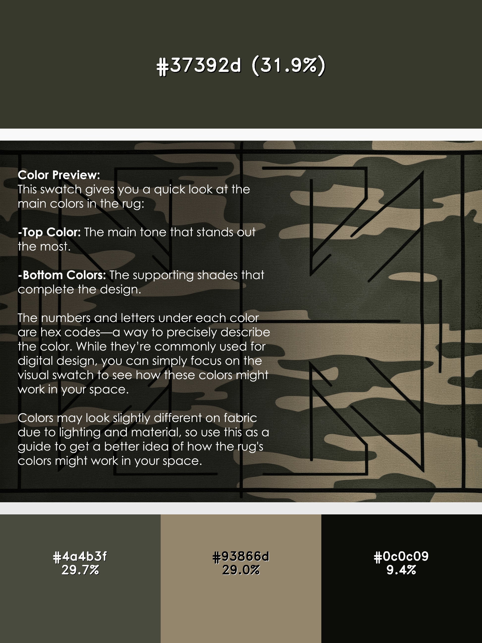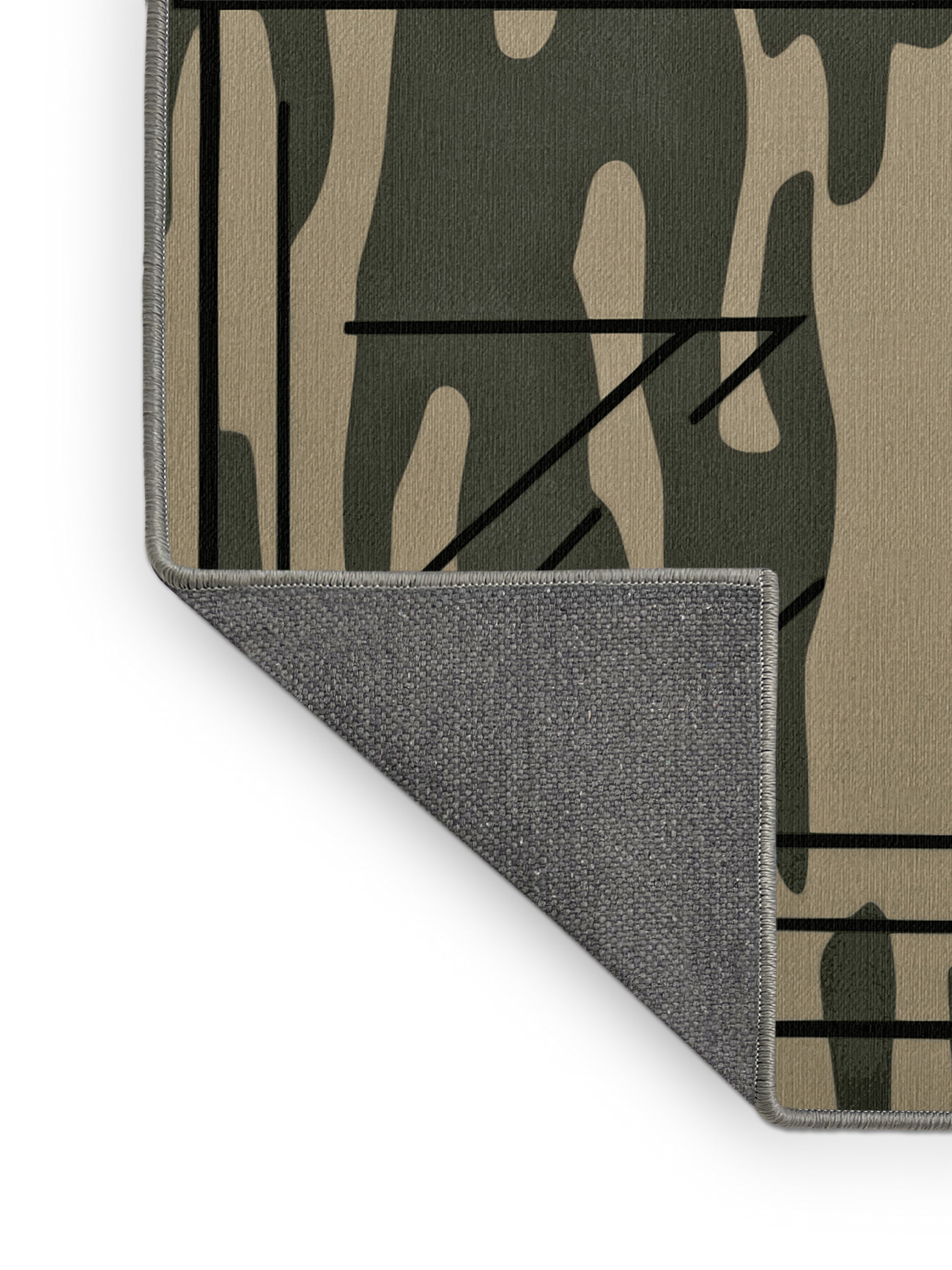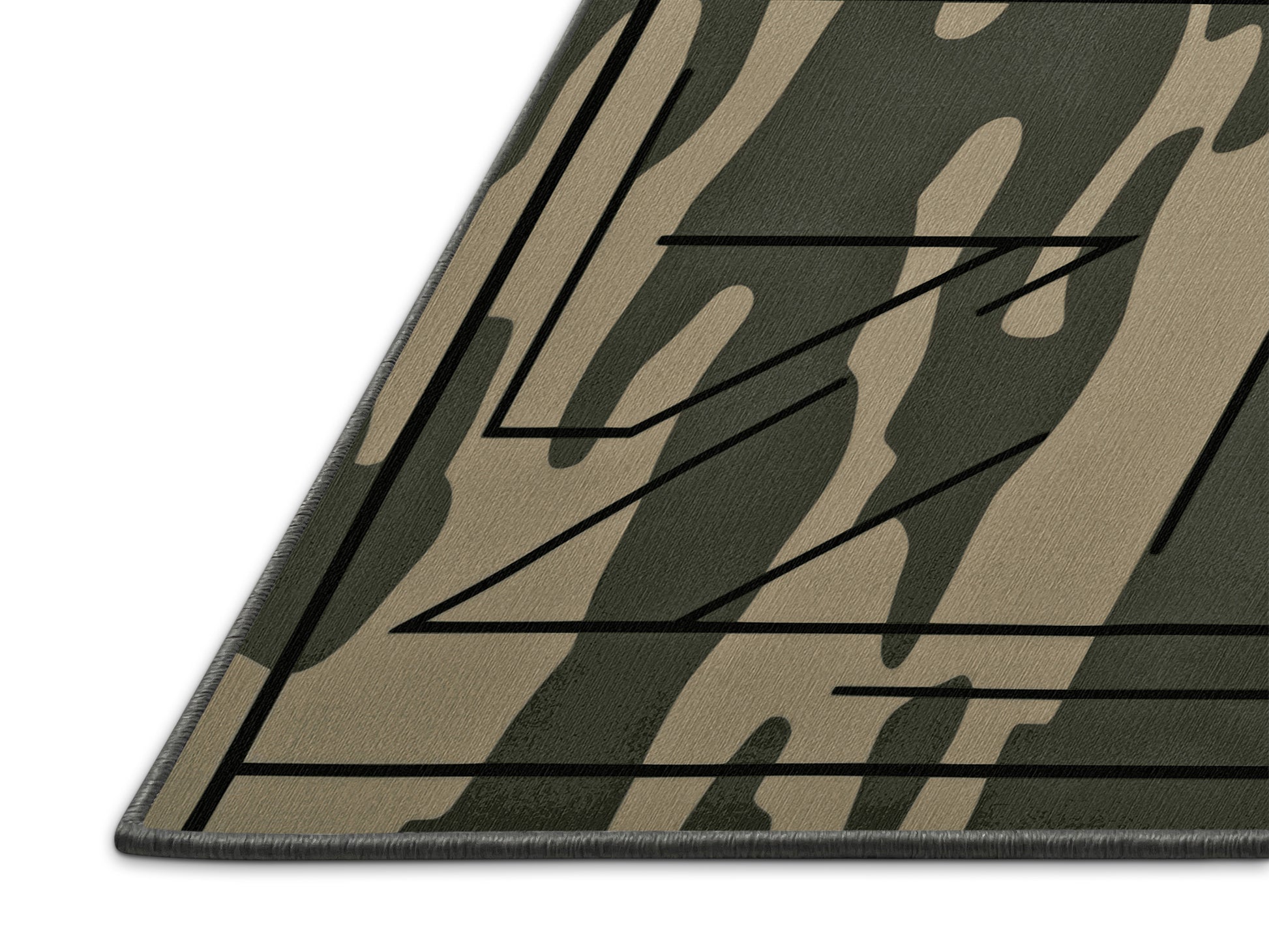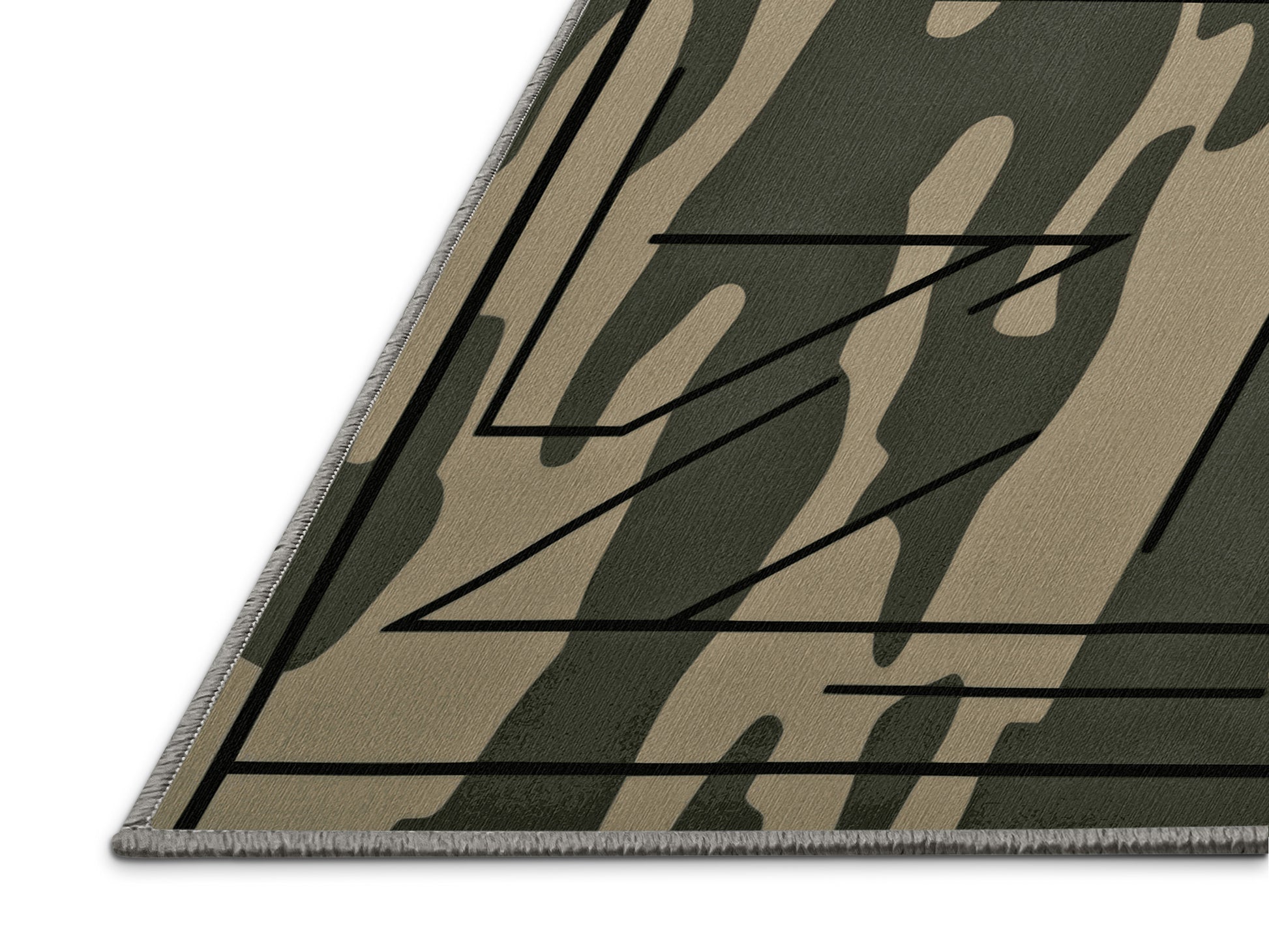 Spire Angles from the Tactical Terrain collection brings rugged sophistication to your space with its striking Sage Green color (A soft and muted green with a touch of gray, calm and soothing.), a bold tone in the Green color family. Inspired by military camouflage and geometric precision, this rug features angular motifs, sharp black gridlines, and a muted palette that evokes strength and resilience. Finished with Gray serging a durable edge that enhances its contemporary aesthetic this rug is crafted from premium polyester and machine-made in the USA with imported materials. Perfect for modern living rooms, industrial home offices, or creative studios, this design blends tactical flair with versatile style. Available in multiple sizes, the Tactical Terrain collection transforms your home with a distinctive edge and bold character, elevating any decor scheme.