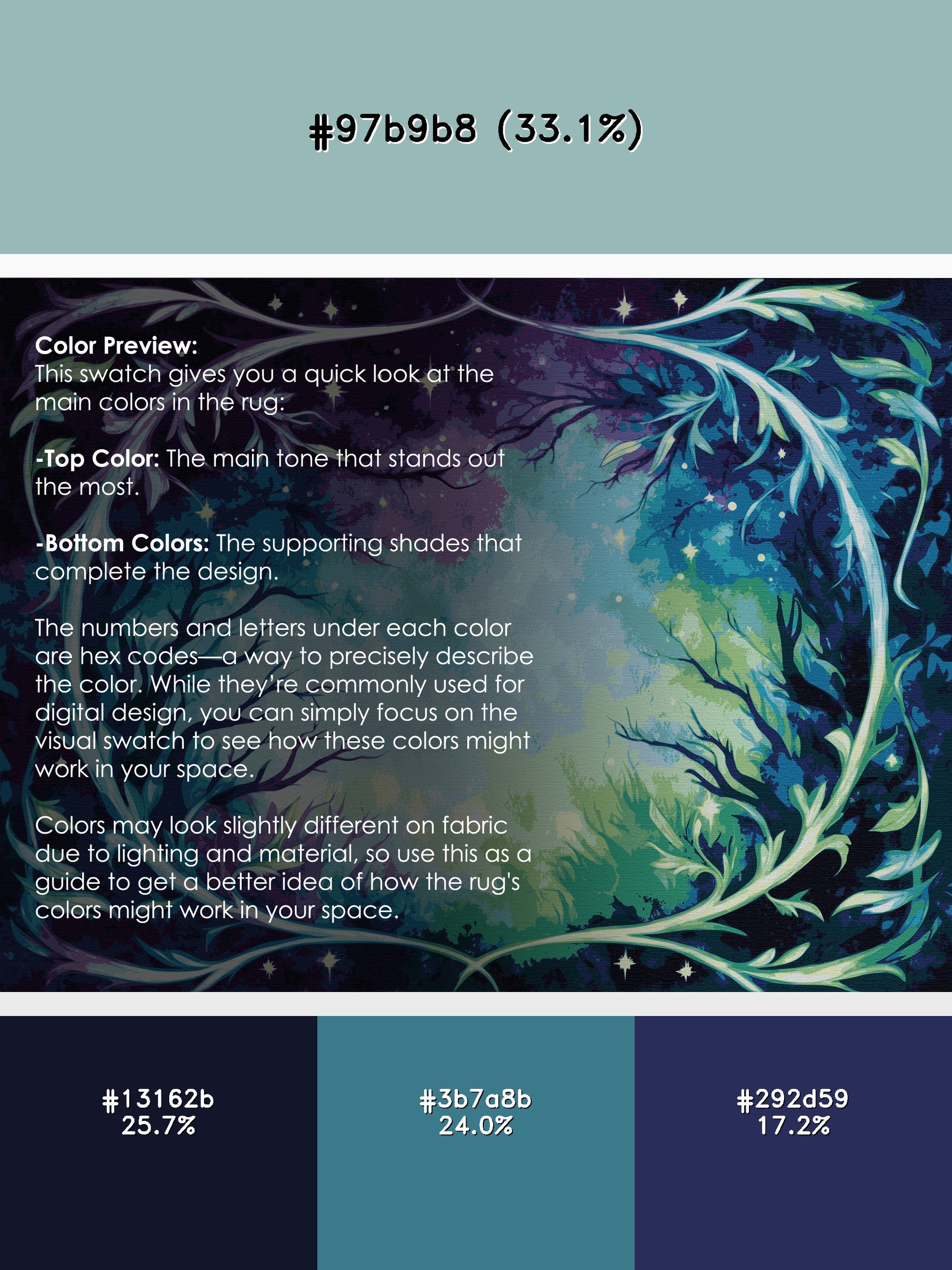 Starlit Thicket from the Mystic Grove collection captures the tranquil essence of lush forest canopies with its stunning Dark Slate color (A dark slate blue with a cool and moody aesthetic.), a calming tone in the Blue color family. Inspired by flourishing greenery and woodland shadows, this rug features intricate leaf patterns, organic shapes, and layered designs that evoke depth and elegance. Finished with Black serging a durable edge that enhances its artisanal look this rug is crafted from premium polyester and machine-made in the USA with imported materials. Perfect for creating a serene retreat in living rooms, calming bedrooms, or artistic reading corners, this design brings a harmonious blend of nature and refinement to your space. Available in multiple sizes, the Mystic Grove collection transforms your home into a tranquil haven, offering timeless beauty and versatile style for modern or nature-inspired interiors.