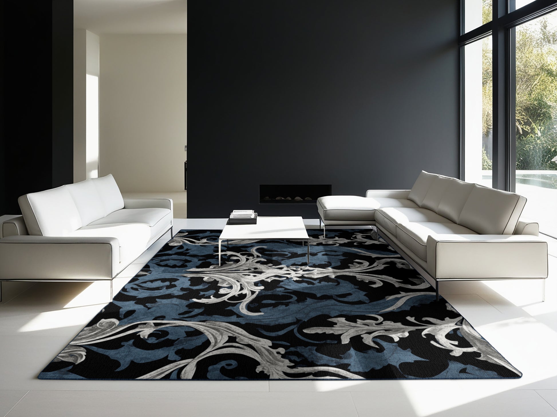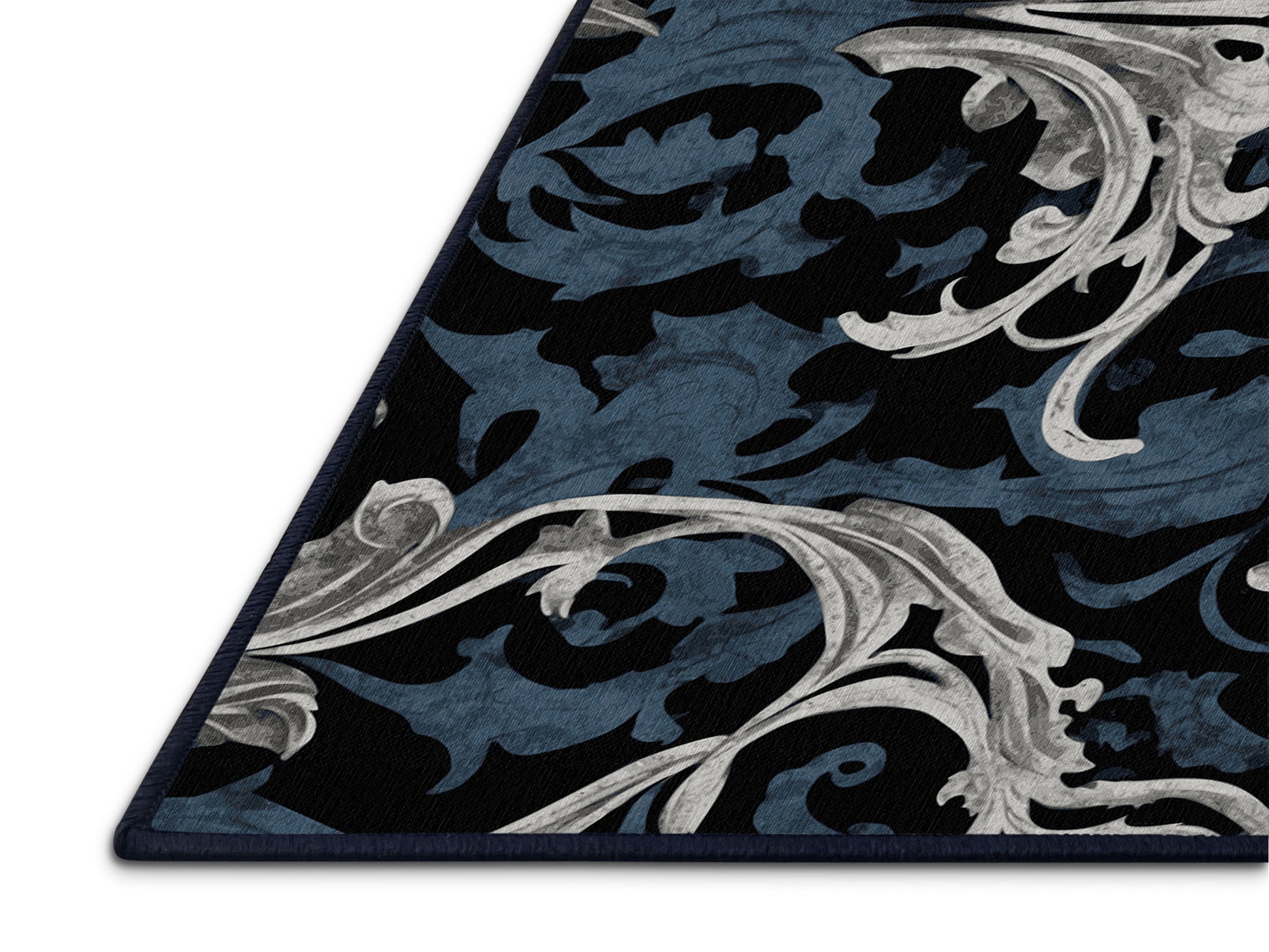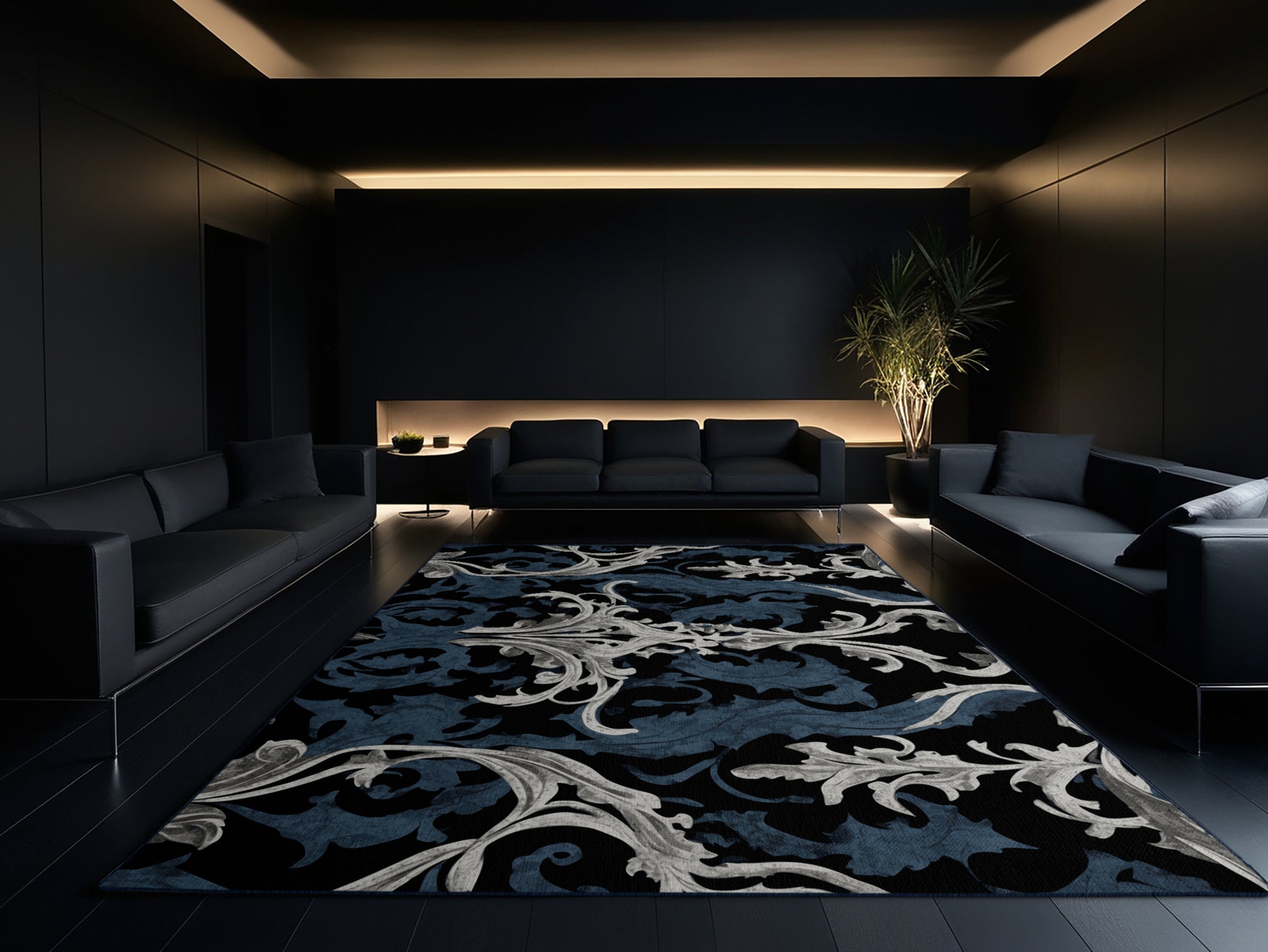 Starlit Whisper from the Nocturne Elegance collection exudes timeless sophistication with its captivating Black (W3C) color (A pure, true black, perfect for sleek and timeless designs.), a rich tone in the Black color family. Featuring intricate baroque-inspired patterns and swirling vine designs, this rug creates a sense of depth and refined elegance. Finished with Navy serging a durable edge that enhances its luxurious aesthetic this rug is crafted from premium polyester and machine-made in the USA with imported materials. Perfect for formal dining rooms, chic living areas, or cozy bedrooms, this design balances bold drama with subtle charm, complementing both contemporary and traditional interiors. Available in multiple sizes, the Nocturne Elegance collection transforms your home into a haven of understated grandeur and classic refinement.