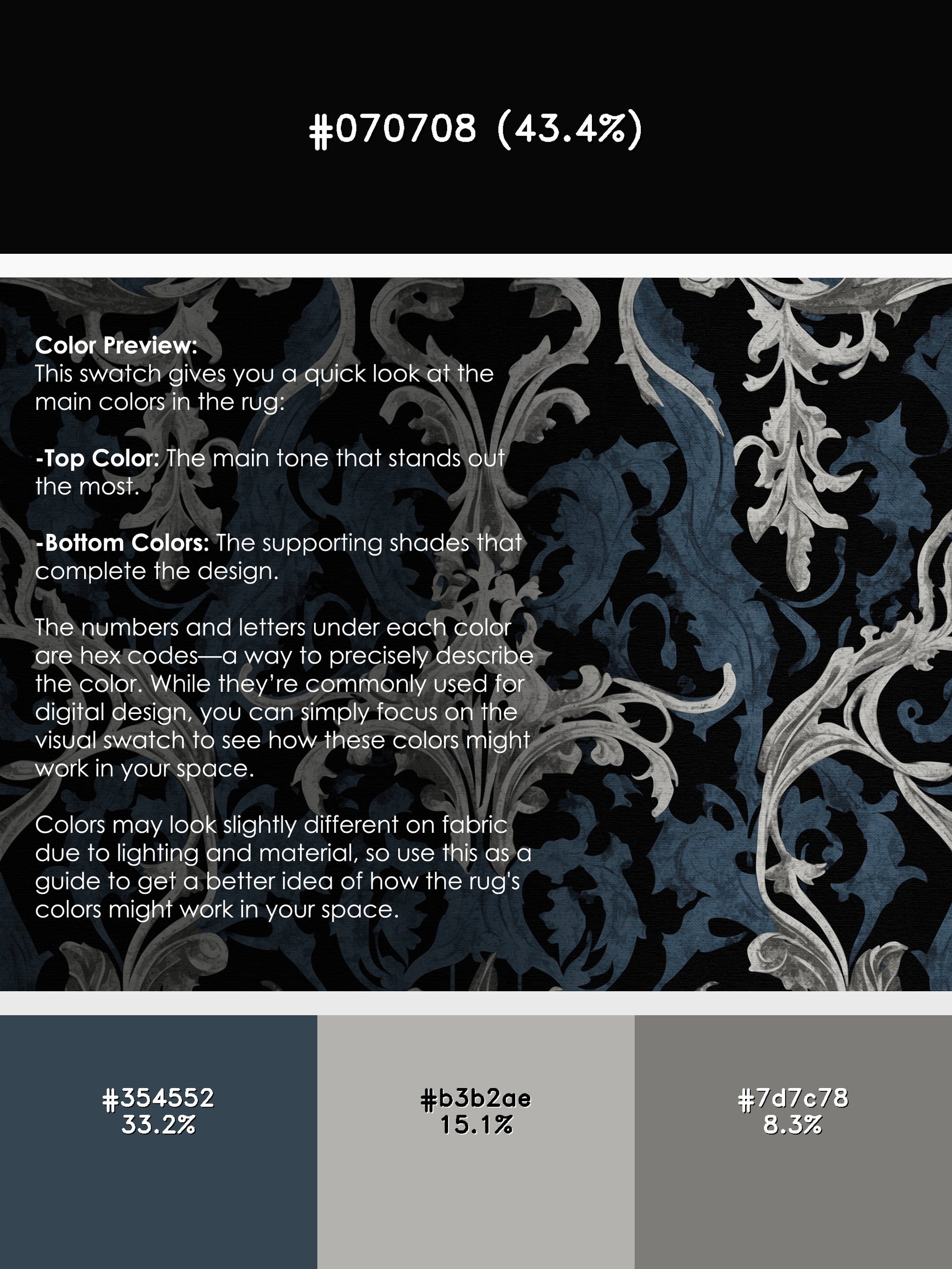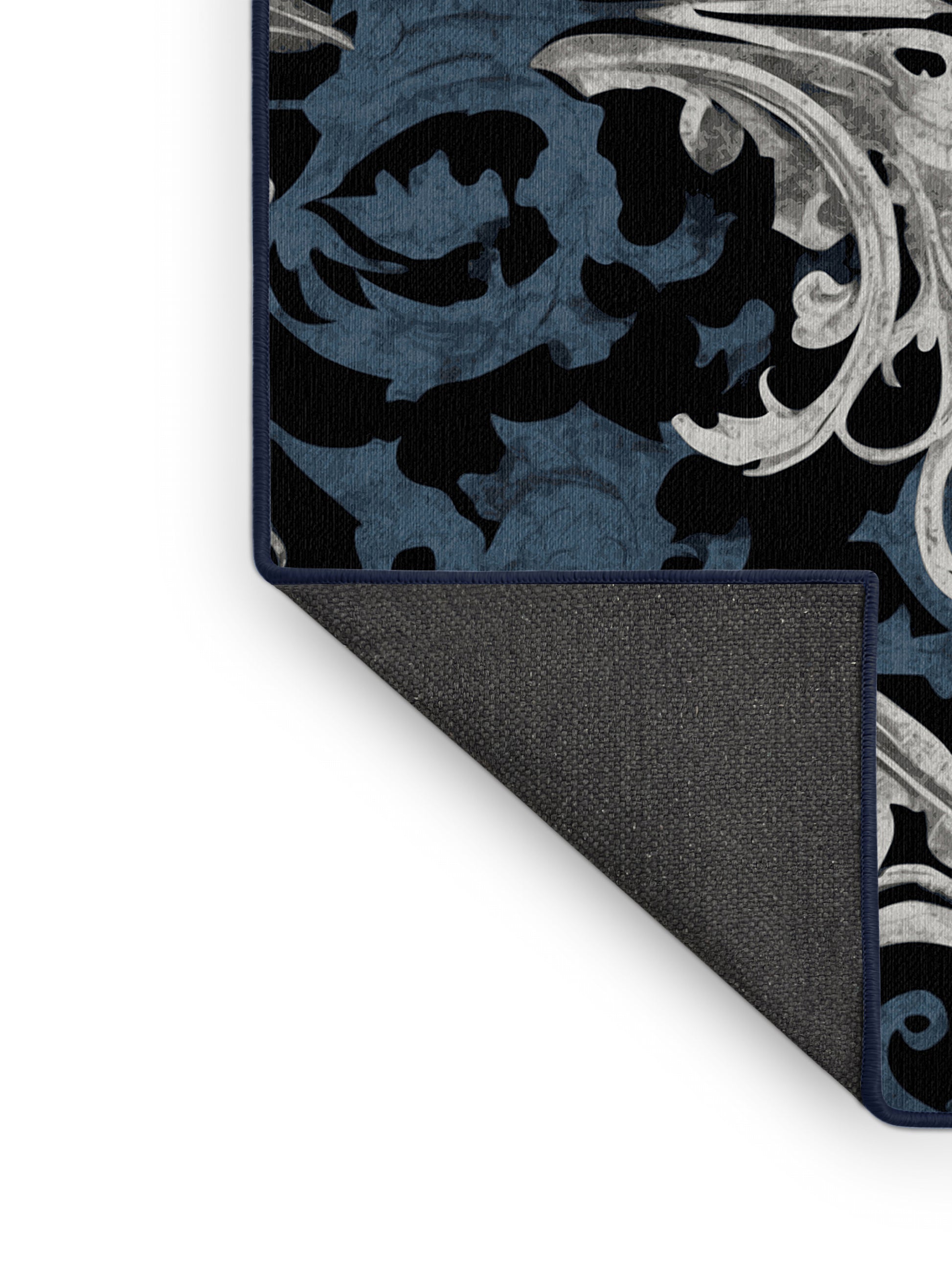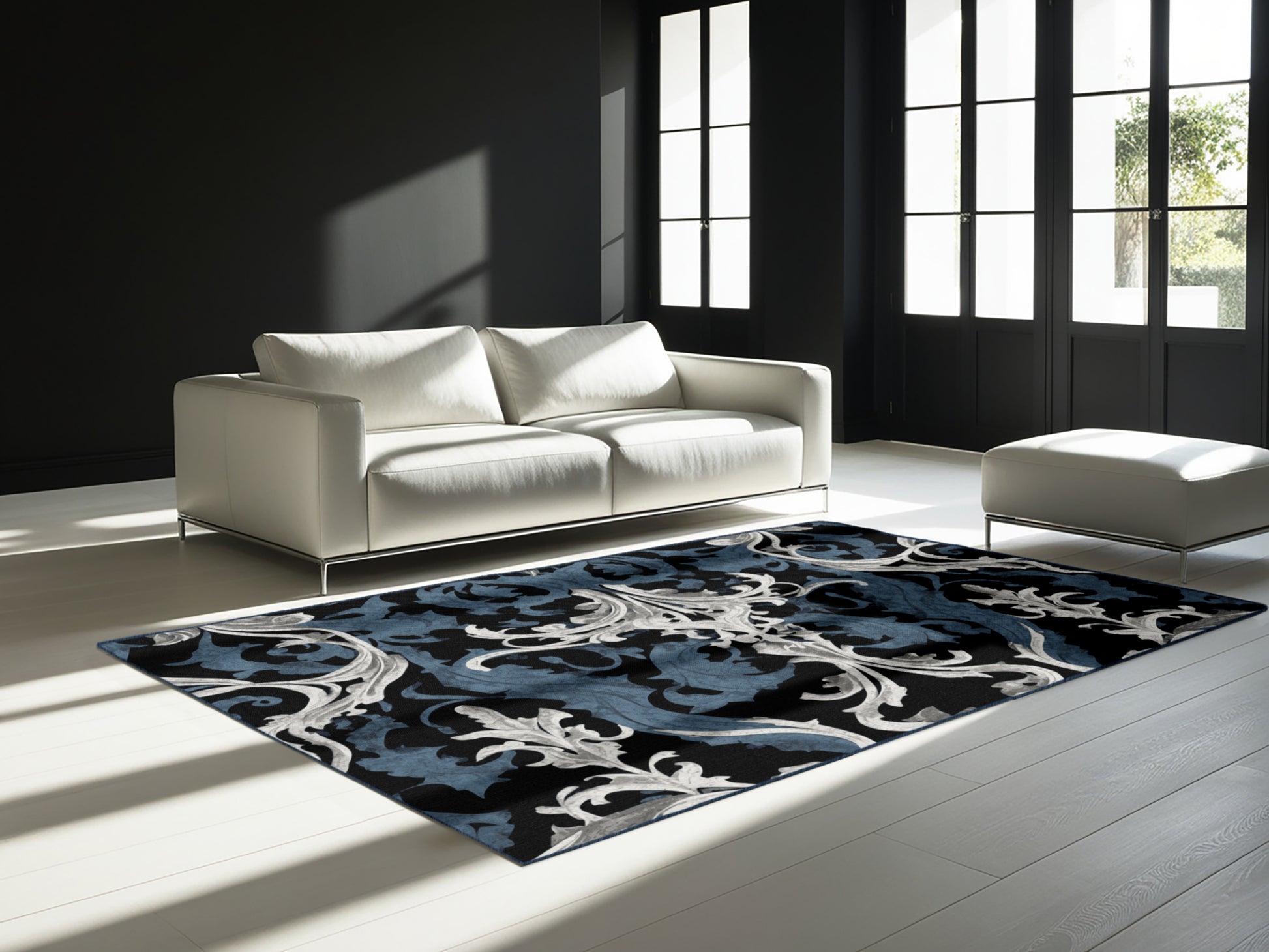 Starlit Whisper from the Nocturne Elegance collection exudes timeless sophistication with its captivating Black (W3C) color (A pure, true black, perfect for sleek and timeless designs.), a rich tone in the Black color family. Featuring intricate baroque-inspired patterns and swirling vine designs, this rug creates a sense of depth and refined elegance. Finished with Navy serging a durable edge that enhances its luxurious aesthetic this rug is crafted from premium polyester and machine-made in the USA with imported materials. Perfect for formal dining rooms, chic living areas, or cozy bedrooms, this design balances bold drama with subtle charm, complementing both contemporary and traditional interiors. Available in multiple sizes, the Nocturne Elegance collection transforms your home into a haven of understated grandeur and classic refinement.