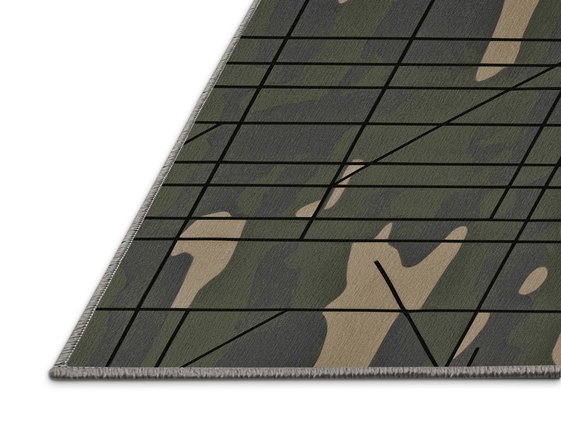 Stealth Strata from the Tactical Terrain collection brings rugged sophistication to your space with its striking Sage Green color (A soft and muted green with a touch of gray, calm and soothing.), a bold tone in the Green color family. Inspired by military camouflage and geometric precision, this rug features angular motifs, sharp black gridlines, and a muted palette that evokes strength and resilience. Finished with Gray serging a durable edge that enhances its contemporary aesthetic this rug is crafted from premium polyester and machine-made in the USA with imported materials. Perfect for modern living rooms, industrial home offices, or creative studios, this design blends tactical flair with versatile style. Available in multiple sizes, the Tactical Terrain collection transforms your home with a distinctive edge and bold character, elevating any decor scheme.