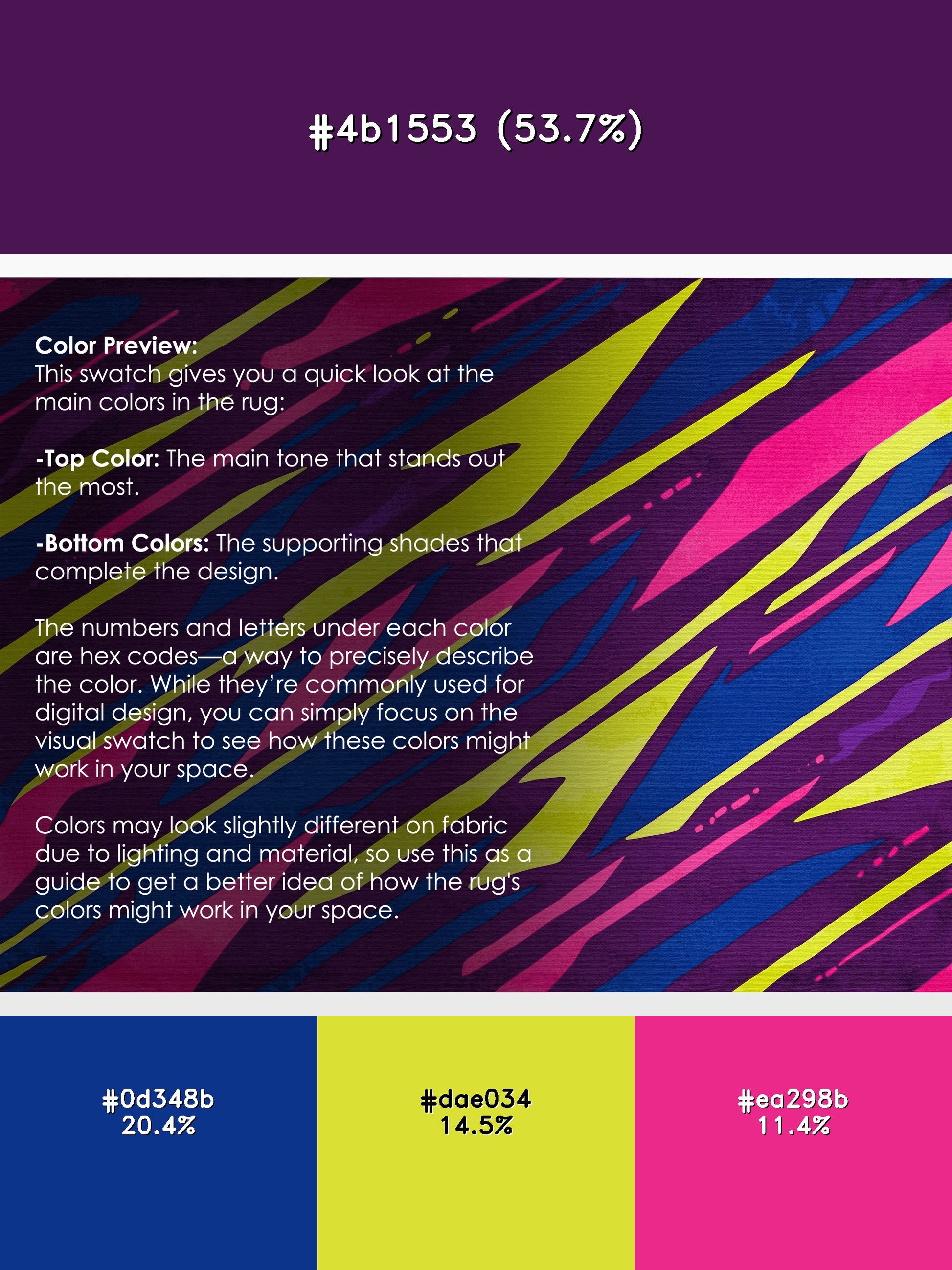 Synth Sunset from the Neon Nexus collection electrifies your space with its bold RebeccaPurple (W3C) color (A medium purple with soft and warm undertones, modern and bold.), a striking tone in the Purple color family. Inspired by neon-lit cityscapes and cyberpunk design, this rug features sharp geometric patterns and dynamic lines illuminated by vibrant, electric hues. Finished with Navy serging a sleek edge that enhances its futuristic appeal this rug is crafted from premium polyester and machine-made in the USA with imported materials. Perfect for modern gaming rooms, creative studios, or contemporary living spaces, this design balances cutting-edge energy with adaptable elegance. Available in multiple sizes, the Neon Nexus collection transforms any room into a bold statement of innovation and style, channeling the vibrant glow of a cyberpunk universe.