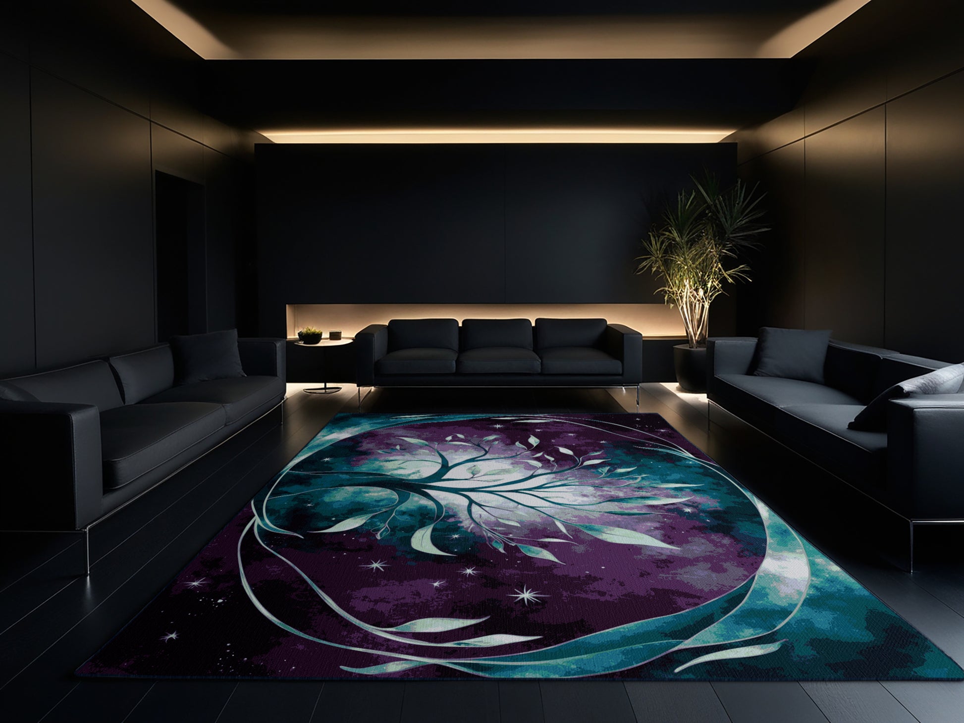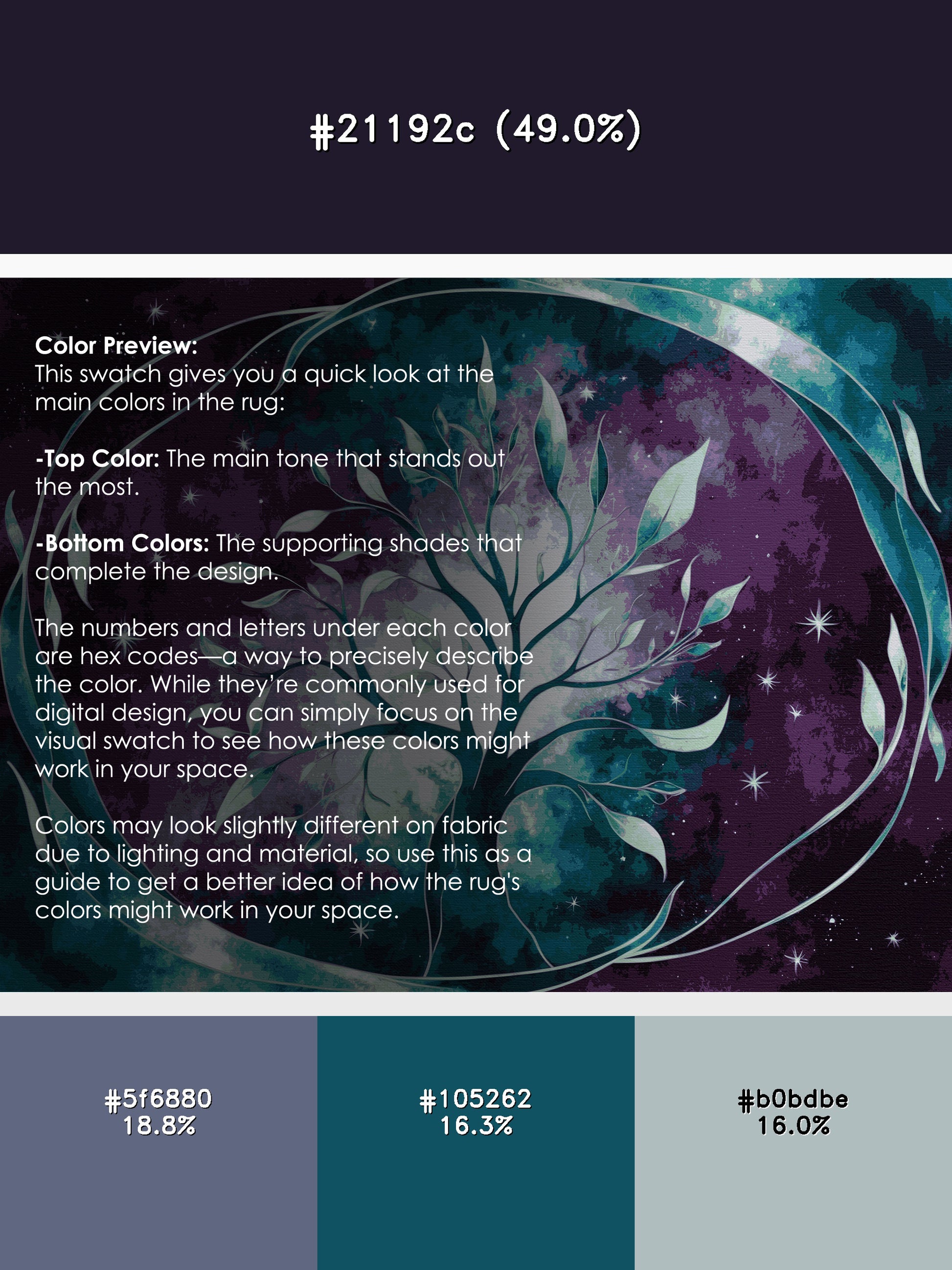 Twilight Bramble from the Mystic Grove collection captures the tranquil essence of lush forest canopies with its stunning Purple Haze color (A soft and dreamy purple with hazy undertones, romantic and subtle.), a calming tone in the Purple color family. Inspired by flourishing greenery and woodland shadows, this rug features intricate leaf patterns, organic shapes, and layered designs that evoke depth and elegance. Finished with Navy serging a durable edge that enhances its artisanal look this rug is crafted from premium polyester and machine-made in the USA with imported materials. Perfect for creating a serene retreat in living rooms, calming bedrooms, or artistic reading corners, this design brings a harmonious blend of nature and refinement to your space. Available in multiple sizes, the Mystic Grove collection transforms your home into a tranquil haven, offering timeless beauty and versatile style for modern or nature-inspired interiors.