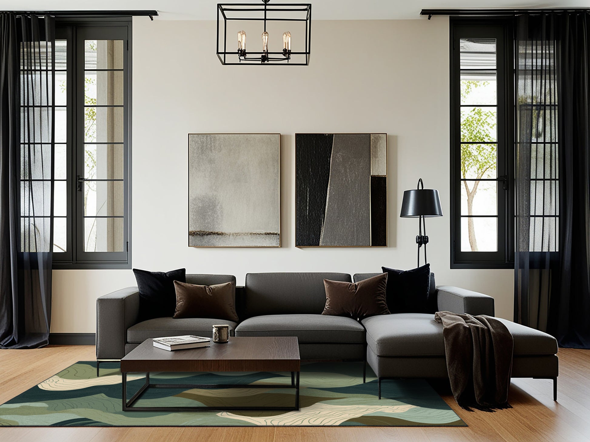 Twilight Fractals from the Mystical Horizons collection captures the serene beauty of nature's fluidity with its captivating Gunmetal Gray color (A cool, dark gray with a metallic feel, sleek and modern.), a calming tone in the Gray color family. Inspired by sweeping vistas and flowing patterns, this rug features abstract, organic designs that mimic the movement of wind, water, and rolling landscapes. Finished with Black serging a durable edge that enhances its refined aesthetic this rug is crafted from premium polyester and machine-made in the USA with imported materials. Perfect for creating a tranquil atmosphere in modern living rooms, serene bedrooms, or stylish home offices, this design blends natural inspiration with sophisticated artistry. Available in multiple sizes, the Mystical Horizons collection transforms any space into a serene retreat, offering a harmonious balance of style and tranquility.