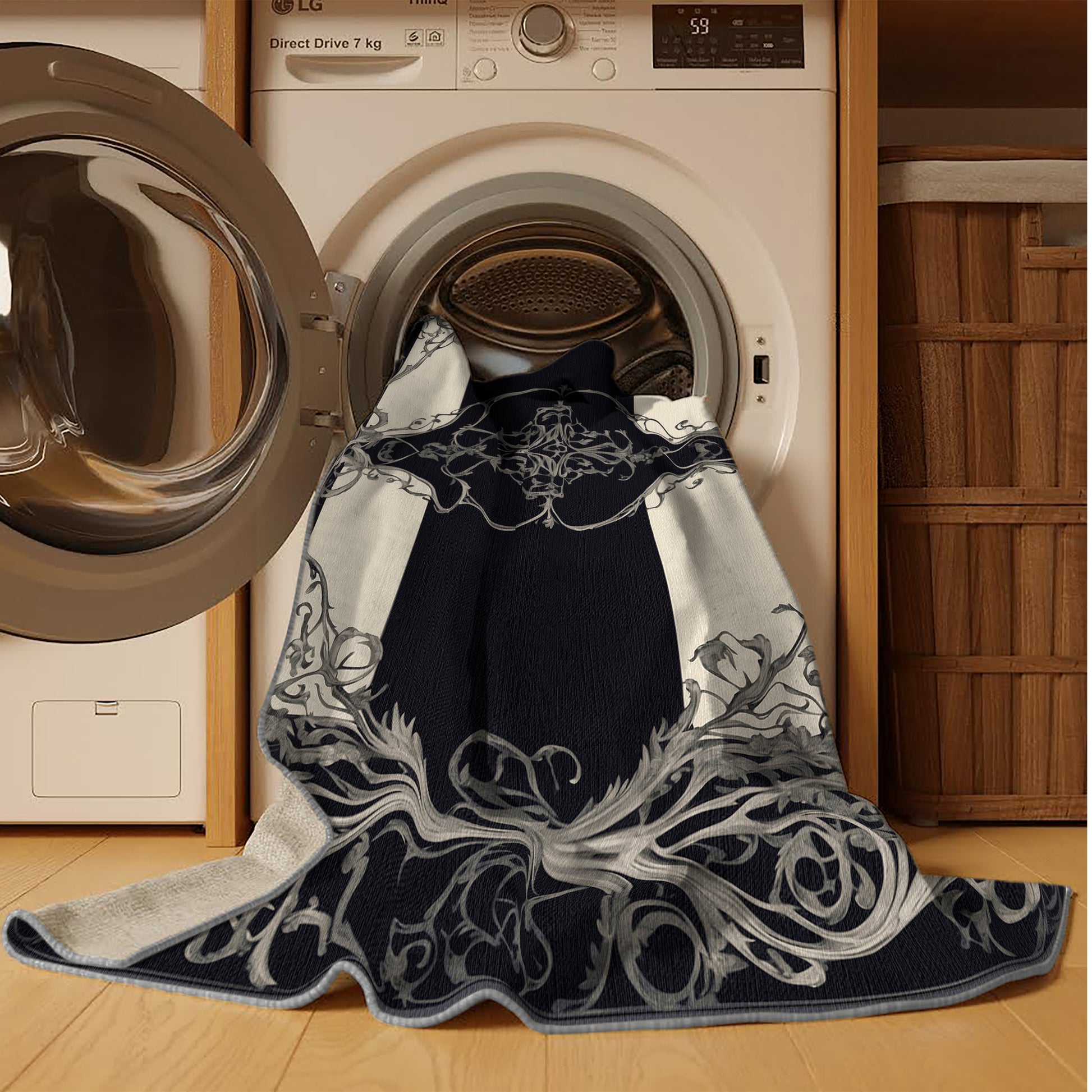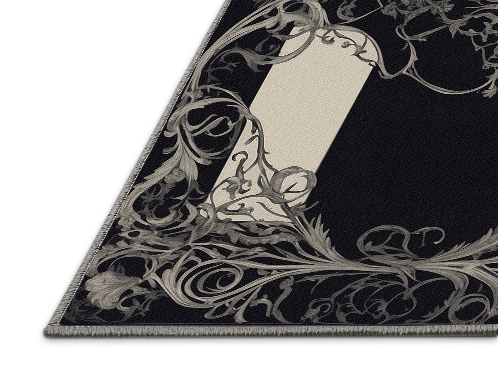 Veil of Night from the Nocturne Elegance collection exudes timeless sophistication with its captivating Midnight color (A deep, dark color with subtle red undertones, mysterious and bold.), a rich tone in the Black color family. Featuring intricate baroque-inspired patterns and swirling vine designs, this rug creates a sense of depth and refined elegance. Finished with Gray serging a durable edge that enhances its luxurious aesthetic this rug is crafted from premium polyester and machine-made in the USA with imported materials. Perfect for formal dining rooms, chic living areas, or cozy bedrooms, this design balances bold drama with subtle charm, complementing both contemporary and traditional interiors. Available in multiple sizes, the Nocturne Elegance collection transforms your home into a haven of understated grandeur and classic refinement.