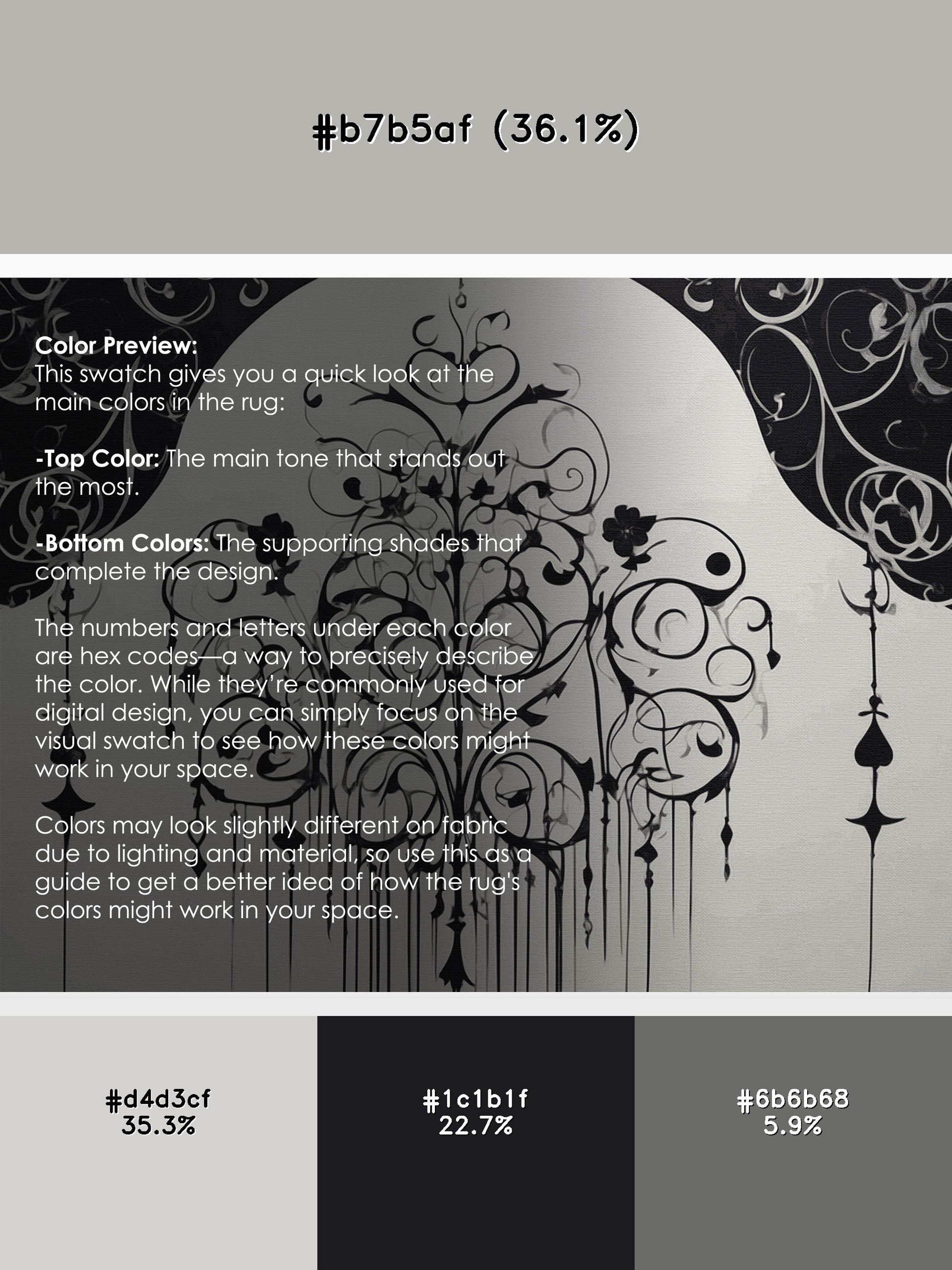 Veiled Fern from the Nocturne Elegance collection exudes timeless sophistication with its captivating Gray Cloud color (A soft gray with subtle warmth, like overcast skies.), a rich tone in the Gray color family. Featuring intricate baroque-inspired patterns and swirling vine designs, this rug creates a sense of depth and refined elegance. Finished with Gray serging a durable edge that enhances its luxurious aesthetic this rug is crafted from premium polyester and machine-made in the USA with imported materials. Perfect for formal dining rooms, chic living areas, or cozy bedrooms, this design balances bold drama with subtle charm, complementing both contemporary and traditional interiors. Available in multiple sizes, the Nocturne Elegance collection transforms your home into a haven of understated grandeur and classic refinement.