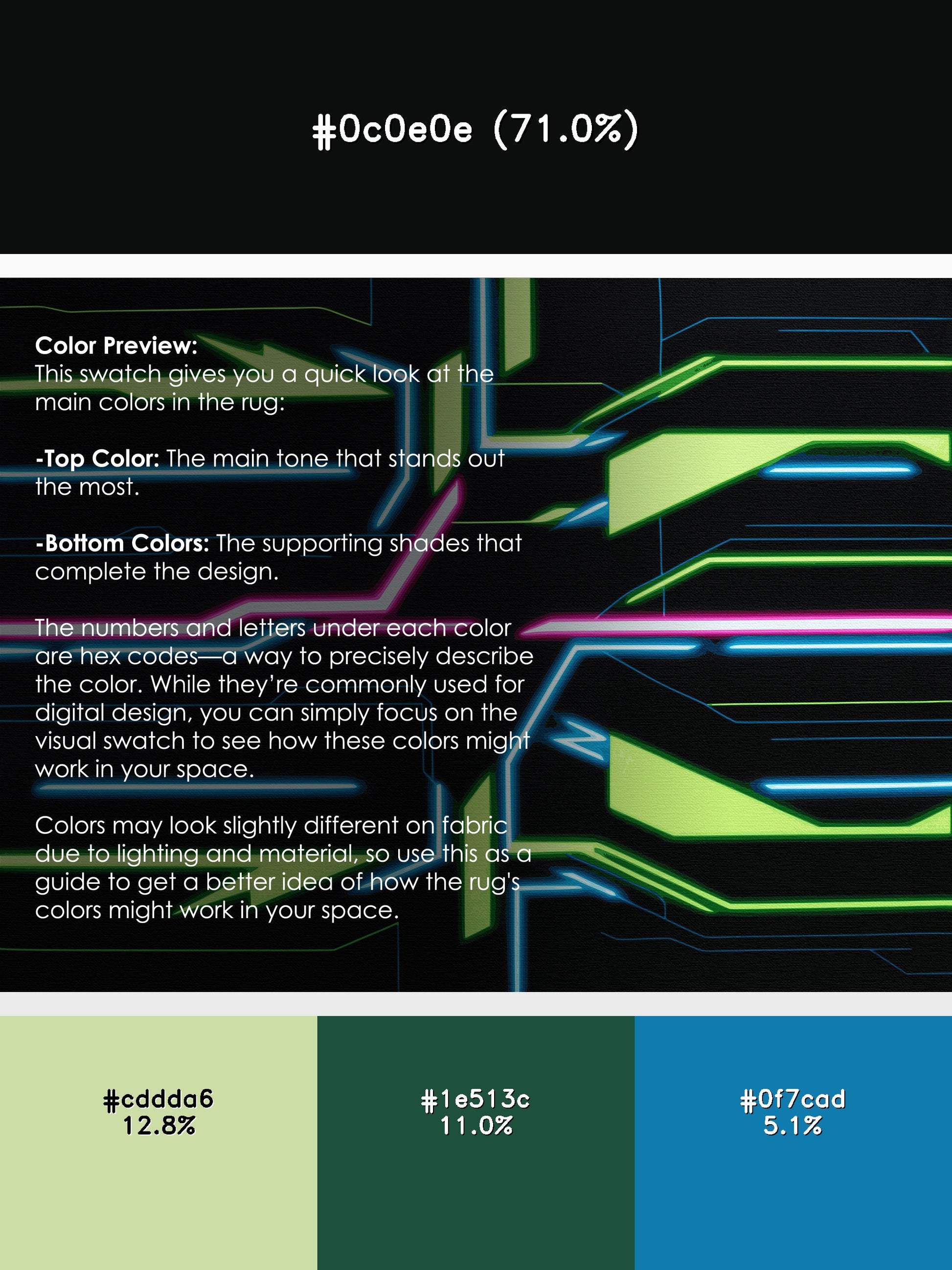 Velocity Shift from the Neon Nexus collection electrifies your space with its bold Gunmetal color (A deep, metallic gray with hints of green and blue.), a striking tone in the Gray color family. Inspired by neon-lit cityscapes and cyberpunk design, this rug features sharp geometric patterns and dynamic lines illuminated by vibrant, electric hues. Finished with Black serging a sleek edge that enhances its futuristic appeal this rug is crafted from premium polyester and machine-made in the USA with imported materials. Perfect for modern gaming rooms, creative studios, or contemporary living spaces, this design balances cutting-edge energy with adaptable elegance. Available in multiple sizes, the Neon Nexus collection transforms any room into a bold statement of innovation and style, channeling the vibrant glow of a cyberpunk universe.