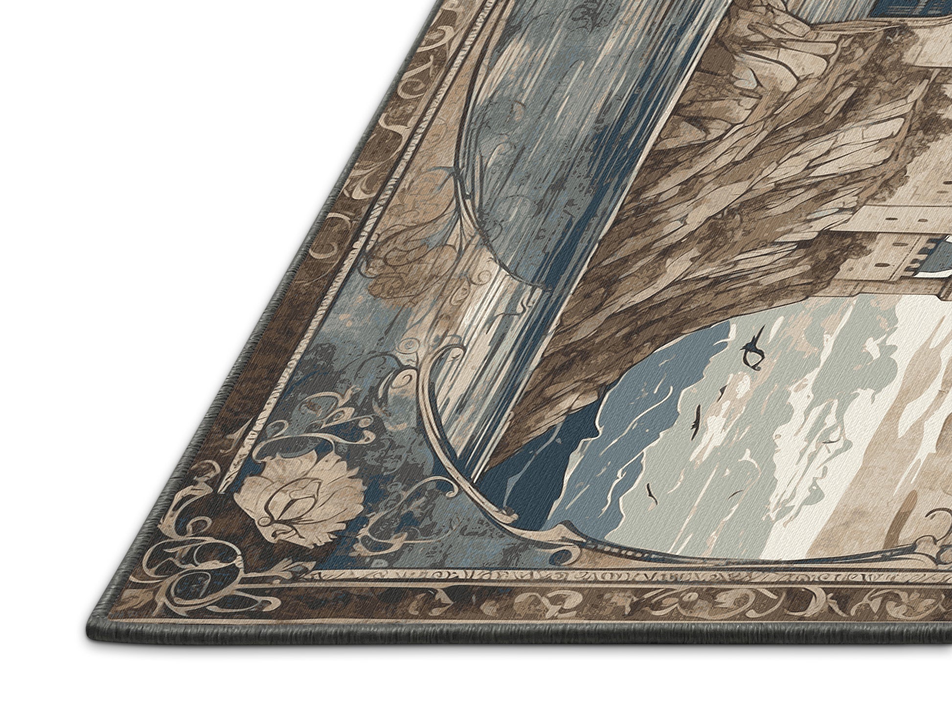 Velvet Ramparts from the Castle Chronicles collection brings the timeless grandeur of medieval elegance to your space with its striking Sandstone color (A soft and warm beige inspired by natural sandstone.), a rich tone in the Beige color family. Featuring intricate castle motifs and ornate detailing, this rug is finished with Gray serging a durable stitched edge that prevents fraying and enhances its refined look. Crafted from premium polyester and machine-made in the USA with imported materials, it delivers lasting quality and effortless sophistication. Perfect for study rooms, traditional living spaces, luxurious offices, and dining areas, this design combines heraldic patterns, vintage artistry, and everyday practicality. Available in multiple sizes, the Castle Chronicles collection offers a stately yet versatile style to transform your home into a regal retreat steeped in history and charm.