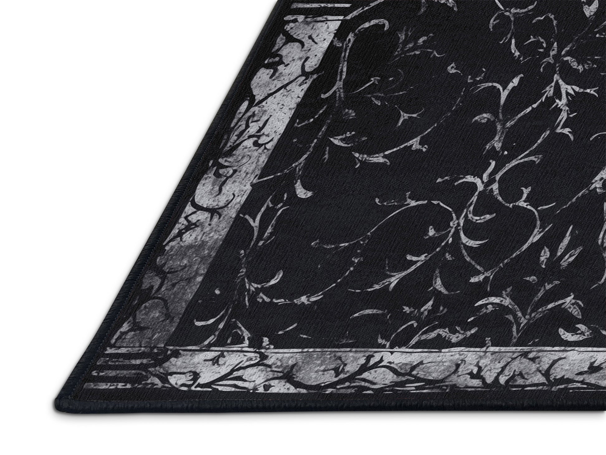 Velvet Raven from the Nocturne Elegance collection exudes timeless sophistication with its captivating Gunmetal color (A deep, metallic gray with hints of green and blue.), a rich tone in the Gray color family. Featuring intricate baroque-inspired patterns and swirling vine designs, this rug creates a sense of depth and refined elegance. Finished with Black serging a durable edge that enhances its luxurious aesthetic this rug is crafted from premium polyester and machine-made in the USA with imported materials. Perfect for formal dining rooms, chic living areas, or cozy bedrooms, this design balances bold drama with subtle charm, complementing both contemporary and traditional interiors. Available in multiple sizes, the Nocturne Elegance collection transforms your home into a haven of understated grandeur and classic refinement.