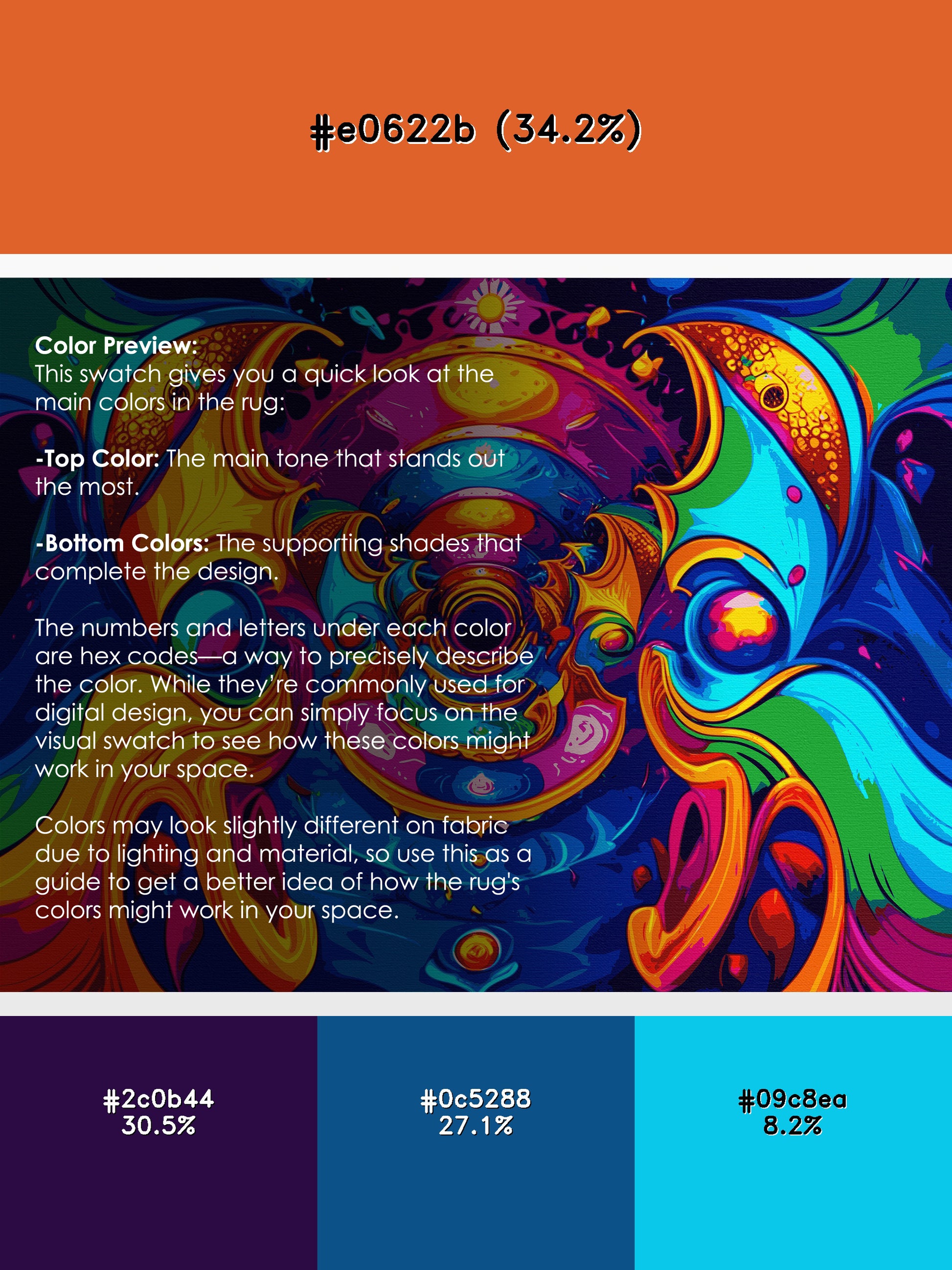 Visionary Surge from the Psychedelia Peaks collection radiates vibrant energy with its bold Blue Whale color (A dark blue with soft purple undertones, deep and elegant.), a striking tone in the Blue color family. Featuring swirling, kaleidoscopic patterns and electrifying neon hues inspired by the psychedelic art movement, this rug brings a sense of dynamic motion and artistic expression to your space. Finished with Navy serging a durable edge that enhances its playful and vibrant aesthetic this rug is crafted from premium polyester and machine-made in the USA with imported materials. Perfect for eclectic living rooms, retro-inspired spaces, or creative studios, this design transforms any room into a lively haven of individuality and boldness. Available in multiple sizes, the Psychedelia Peaks collection adds a dramatic, colorful statement to your decor, turning your home into a canvas of unrestrained creativity.