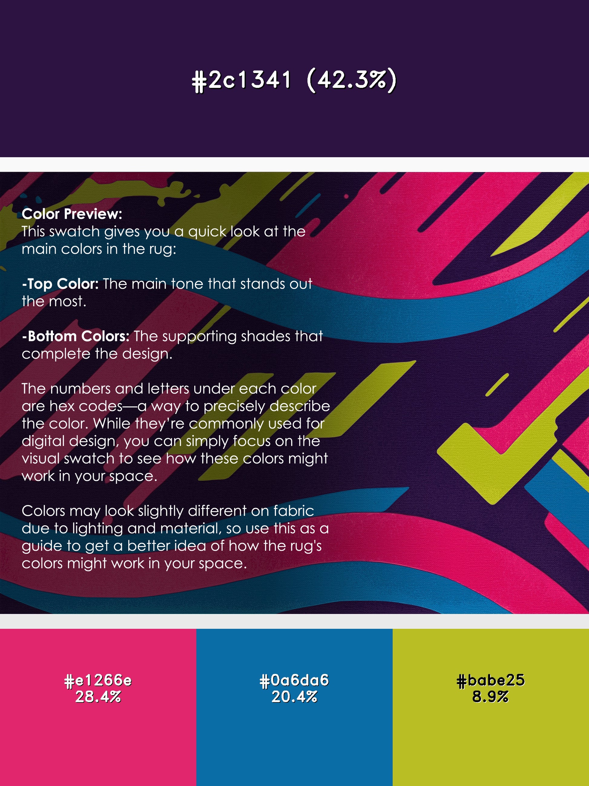 Vivid Oscillation from the Neon Nexus collection electrifies your space with its bold DarkSlateBlue (W3C) color (A dark and muted blue with slate-inspired undertones, versatile and bold.), a striking tone in the Blue color family. Inspired by neon-lit cityscapes and cyberpunk design, this rug features sharp geometric patterns and dynamic lines illuminated by vibrant, electric hues. Finished with Navy serging a sleek edge that enhances its futuristic appeal this rug is crafted from premium polyester and machine-made in the USA with imported materials. Perfect for modern gaming rooms, creative studios, or contemporary living spaces, this design balances cutting-edge energy with adaptable elegance. Available in multiple sizes, the Neon Nexus collection transforms any room into a bold statement of innovation and style, channeling the vibrant glow of a cyberpunk universe.