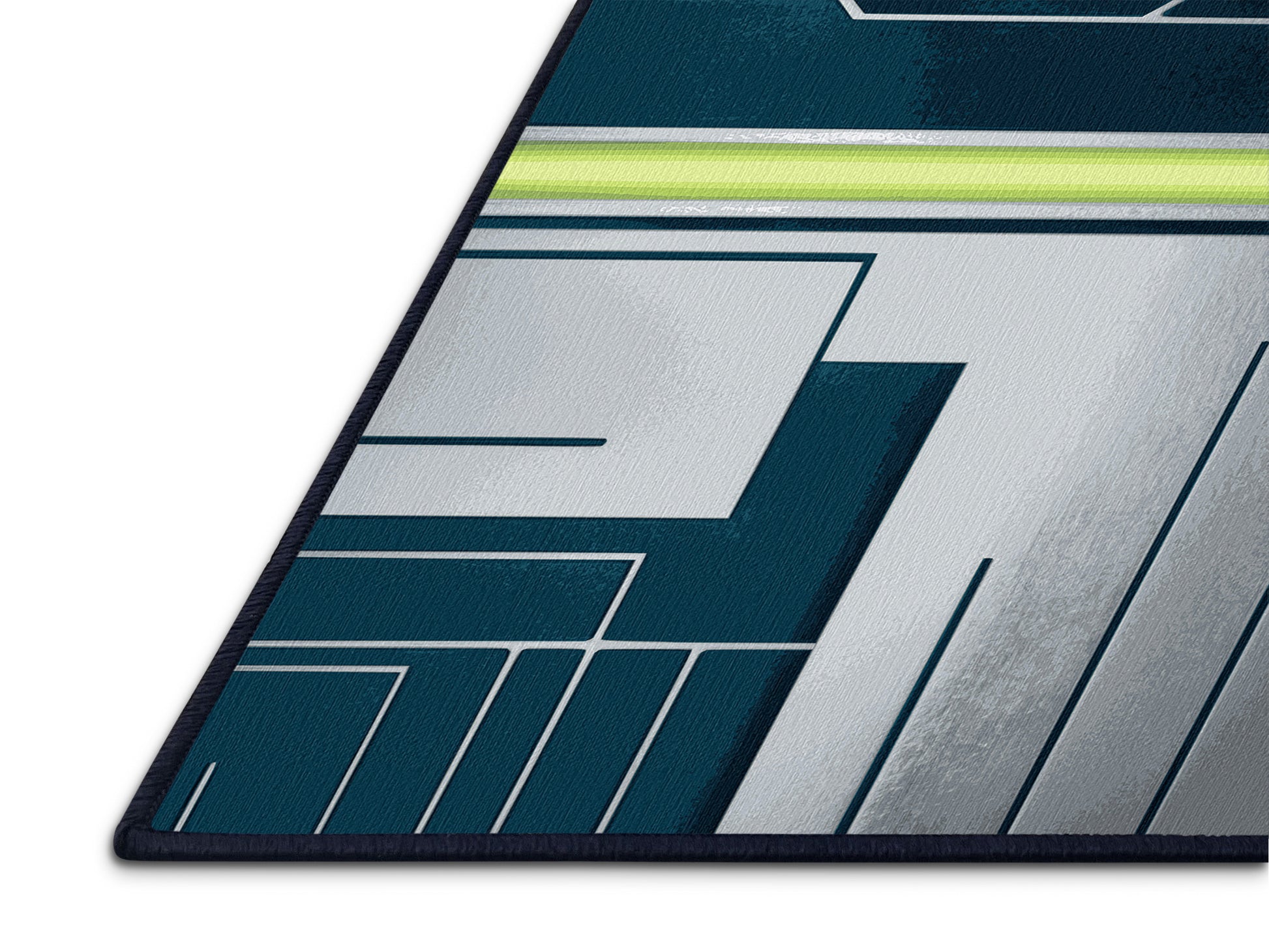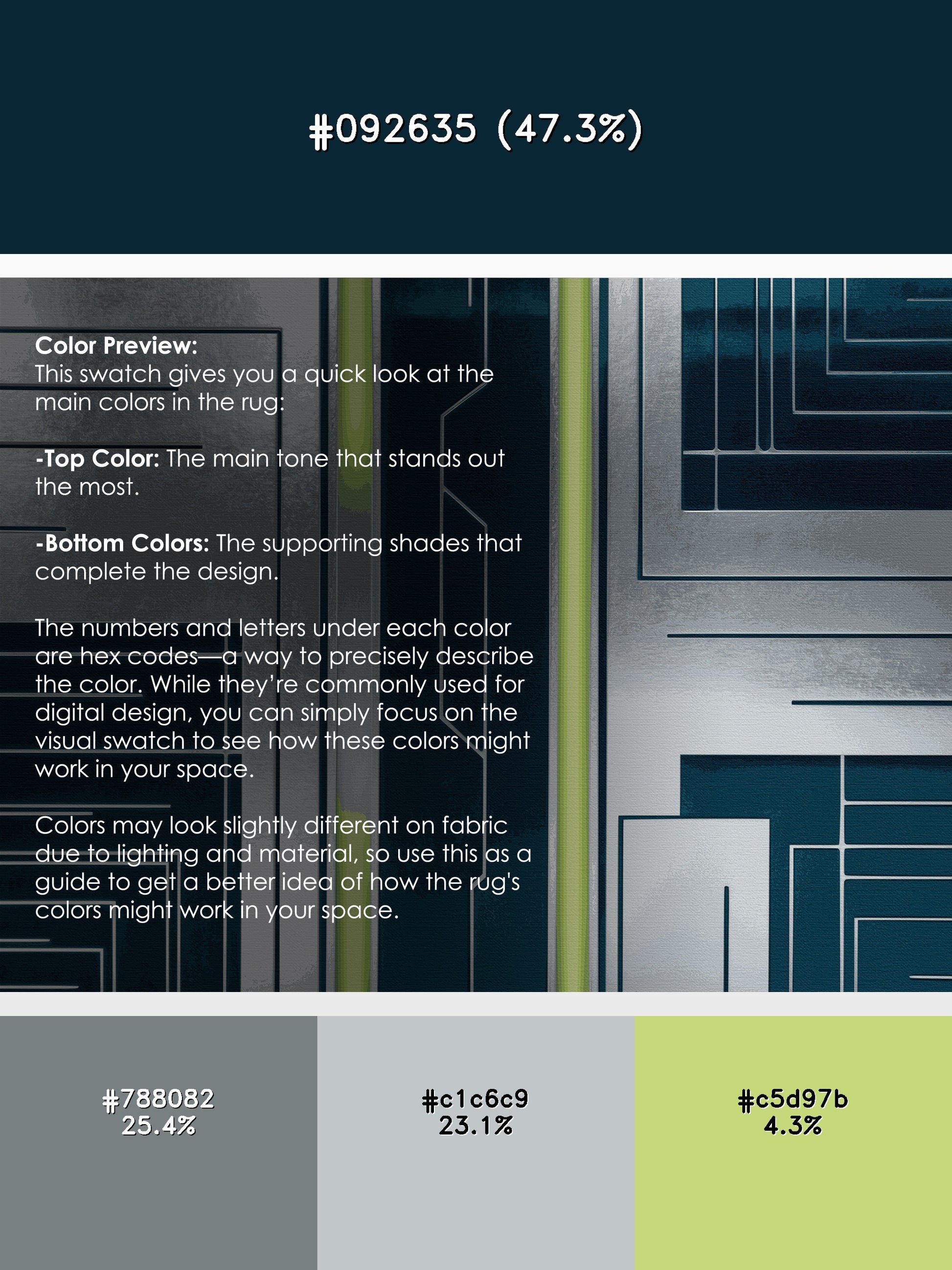 Voidwalker Threads from the NeoLoom Galaxy collection brings futuristic sophistication to your space with its striking Deep Teal color (A rich and dark teal, offering depth and sophistication.), a bold tone in the Green color family. Featuring cutting-edge geometric patterns and dynamic lines inspired by space exploration and advanced technology, this rug is finished with Navy serging a sleek edge that enhances its modern aesthetic. Crafted from premium polyester and machine-made in the USA with imported materials, it combines innovation, durability, and style. Perfect for contemporary living rooms, futuristic home offices, or bold creative studios, this design blends avant-garde artistry with forward-thinking design. Available in multiple sizes, the NeoLoom Galaxy collection transforms any space into a statement of sleek modernity and endless possibilities.