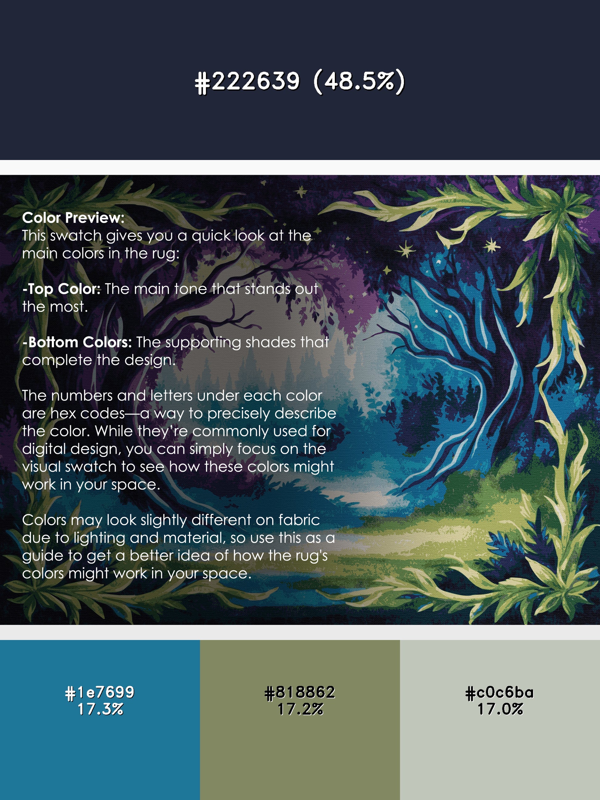 Whispering Leaves from the Mystic Grove collection captures the tranquil essence of lush forest canopies with its stunning Dark Slate color (A dark slate blue with a cool and moody aesthetic.), a calming tone in the Blue color family. Inspired by flourishing greenery and woodland shadows, this rug features intricate leaf patterns, organic shapes, and layered designs that evoke depth and elegance. Finished with Black serging a durable edge that enhances its artisanal look this rug is crafted from premium polyester and machine-made in the USA with imported materials. Perfect for creating a serene retreat in living rooms, calming bedrooms, or artistic reading corners, this design brings a harmonious blend of nature and refinement to your space. Available in multiple sizes, the Mystic Grove collection transforms your home into a tranquil haven, offering timeless beauty and versatile style for modern or nature-inspired interiors.