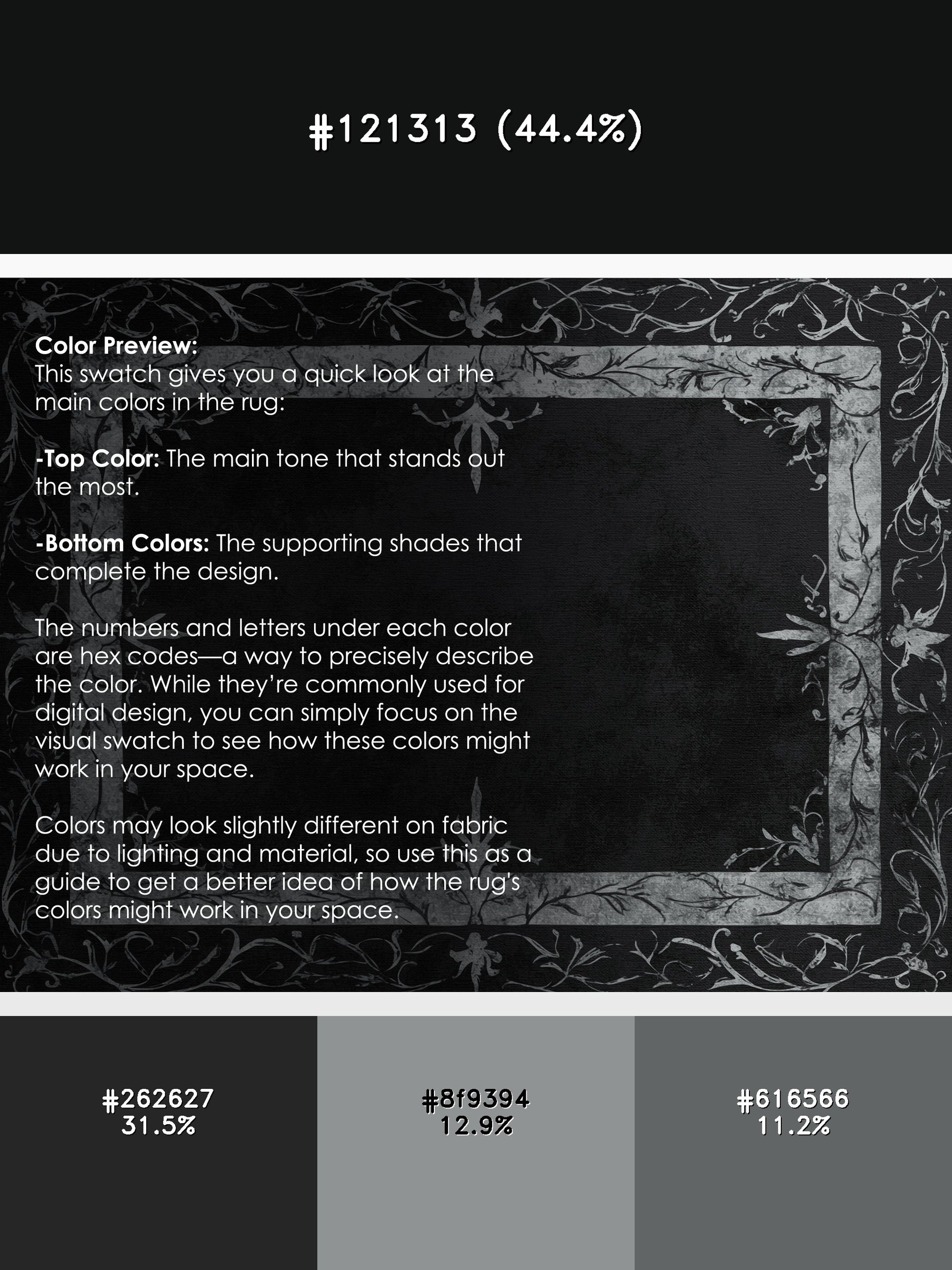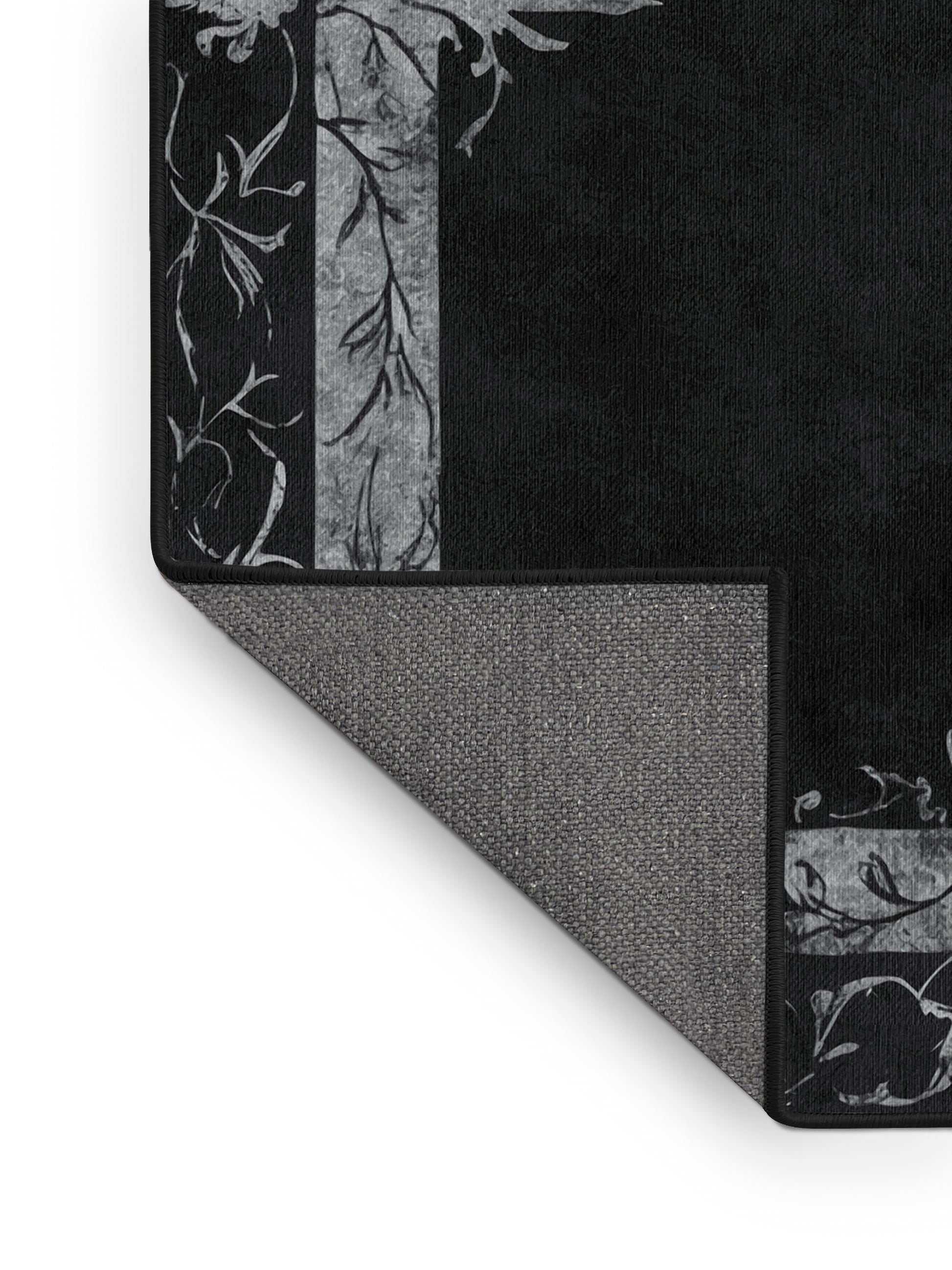 Whispering Thorn from the Nocturne Elegance collection exudes timeless sophistication with its captivating Gunmetal color (A deep, metallic gray with hints of green and blue.), a rich tone in the Gray color family. Featuring intricate baroque-inspired patterns and swirling vine designs, this rug creates a sense of depth and refined elegance. Finished with Black serging a durable edge that enhances its luxurious aesthetic this rug is crafted from premium polyester and machine-made in the USA with imported materials. Perfect for formal dining rooms, chic living areas, or cozy bedrooms, this design balances bold drama with subtle charm, complementing both contemporary and traditional interiors. Available in multiple sizes, the Nocturne Elegance collection transforms your home into a haven of understated grandeur and classic refinement.