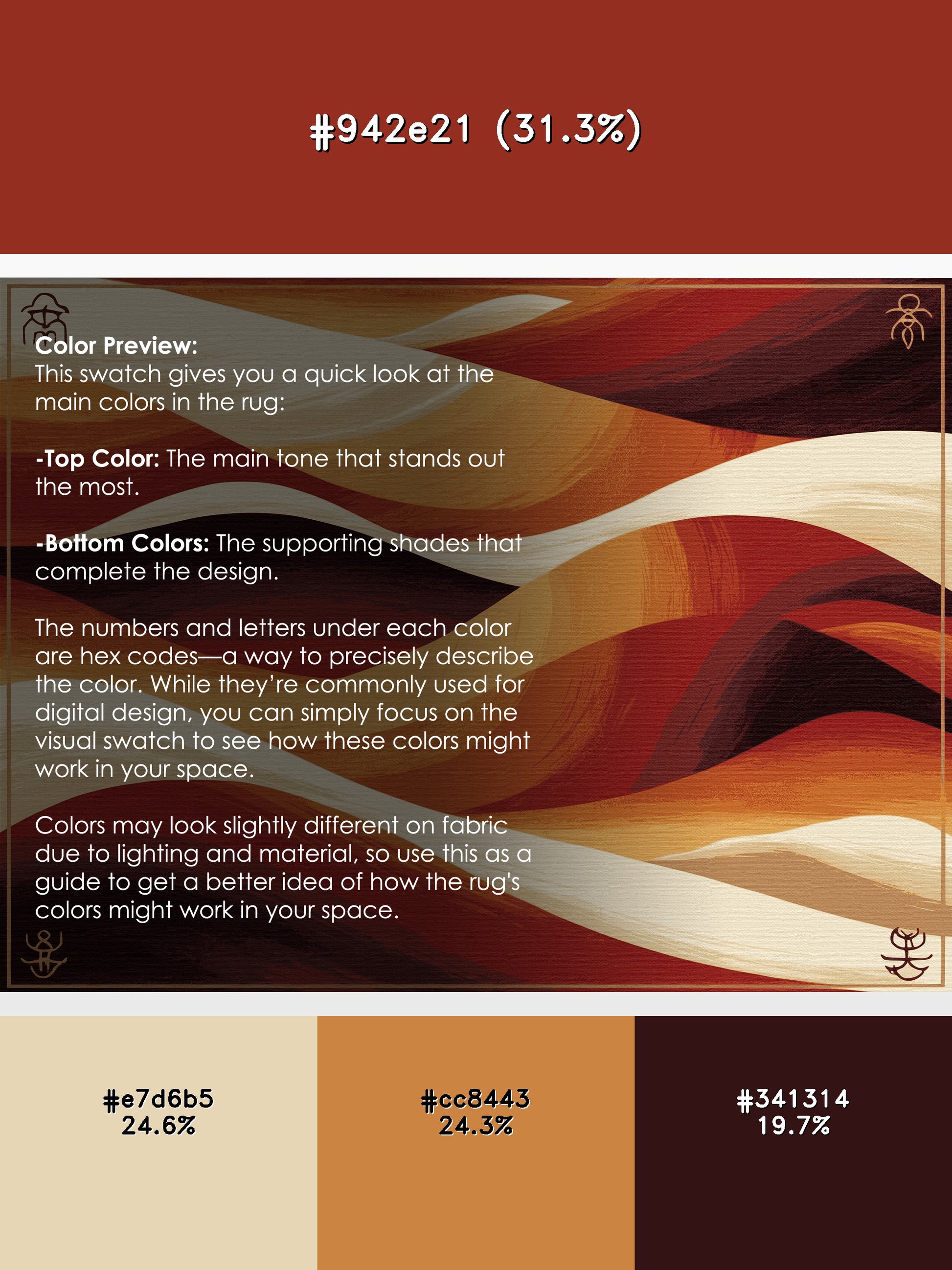 Windswept Echoes from the Desert Horizons collection captures the raw beauty of desert landscapes with its stunning Sienna (W3C) color (A warm, reddish-brown inspired by natural pigments.), a warm tone in the Brown color family. Featuring organic, flowing patterns inspired by sunlit dunes and expansive horizons, this rug is finished with LightBrown serging a durable stitched edge that prevents fraying and enhances its refined look. Crafted from premium polyester and machine-made in the USA with imported materials, it combines natural elegance with long-lasting durability. Perfect for cozy living rooms, warm bedrooms, or bohemian-inspired spaces, this design brings texture, warmth, and timeless charm into your home. Available in multiple sizes, the Desert Horizons collection offers a versatile foundation for rustic, modern, or eclectic interiors, delivering a cozy yet sophisticated vibe.