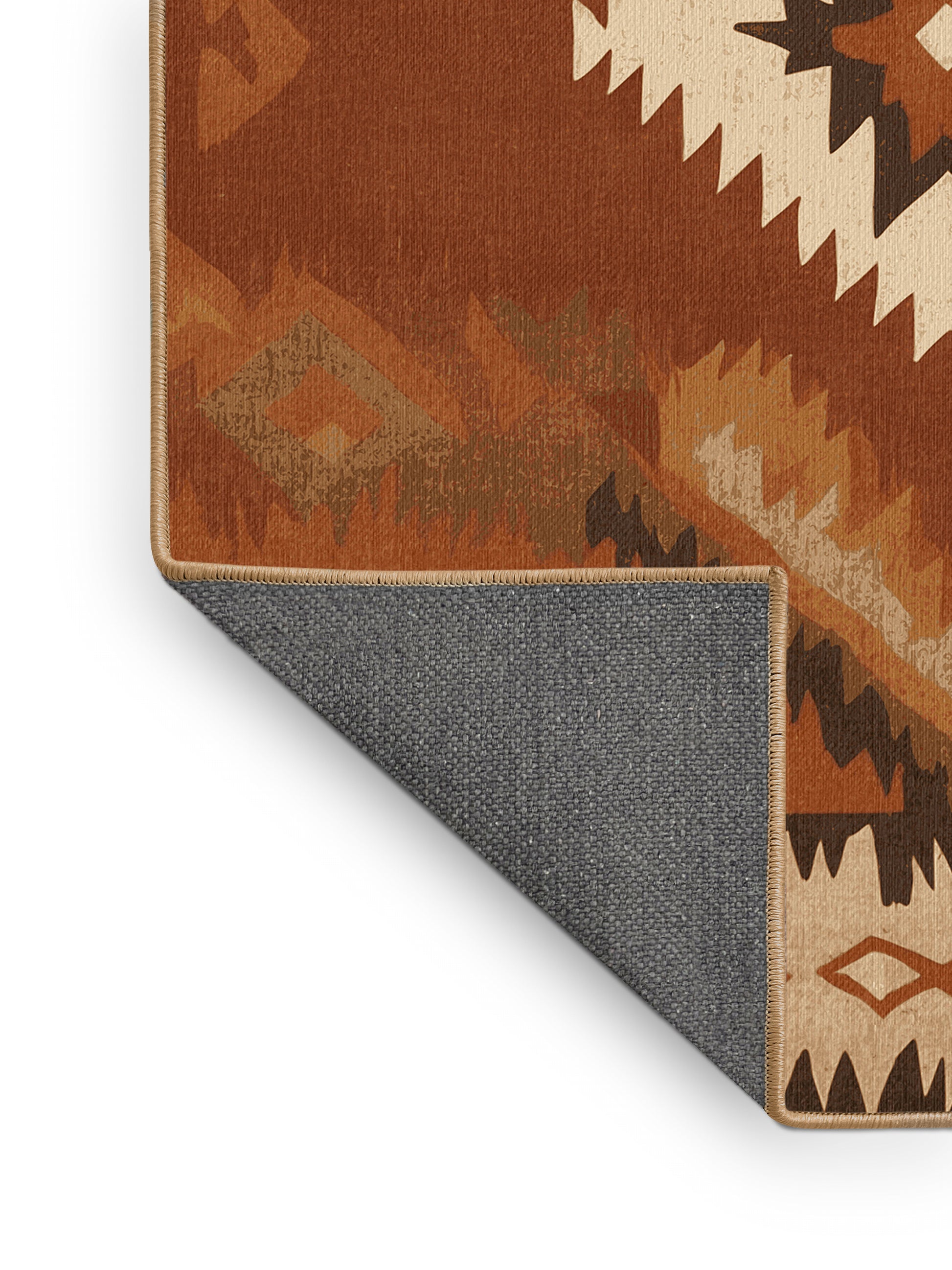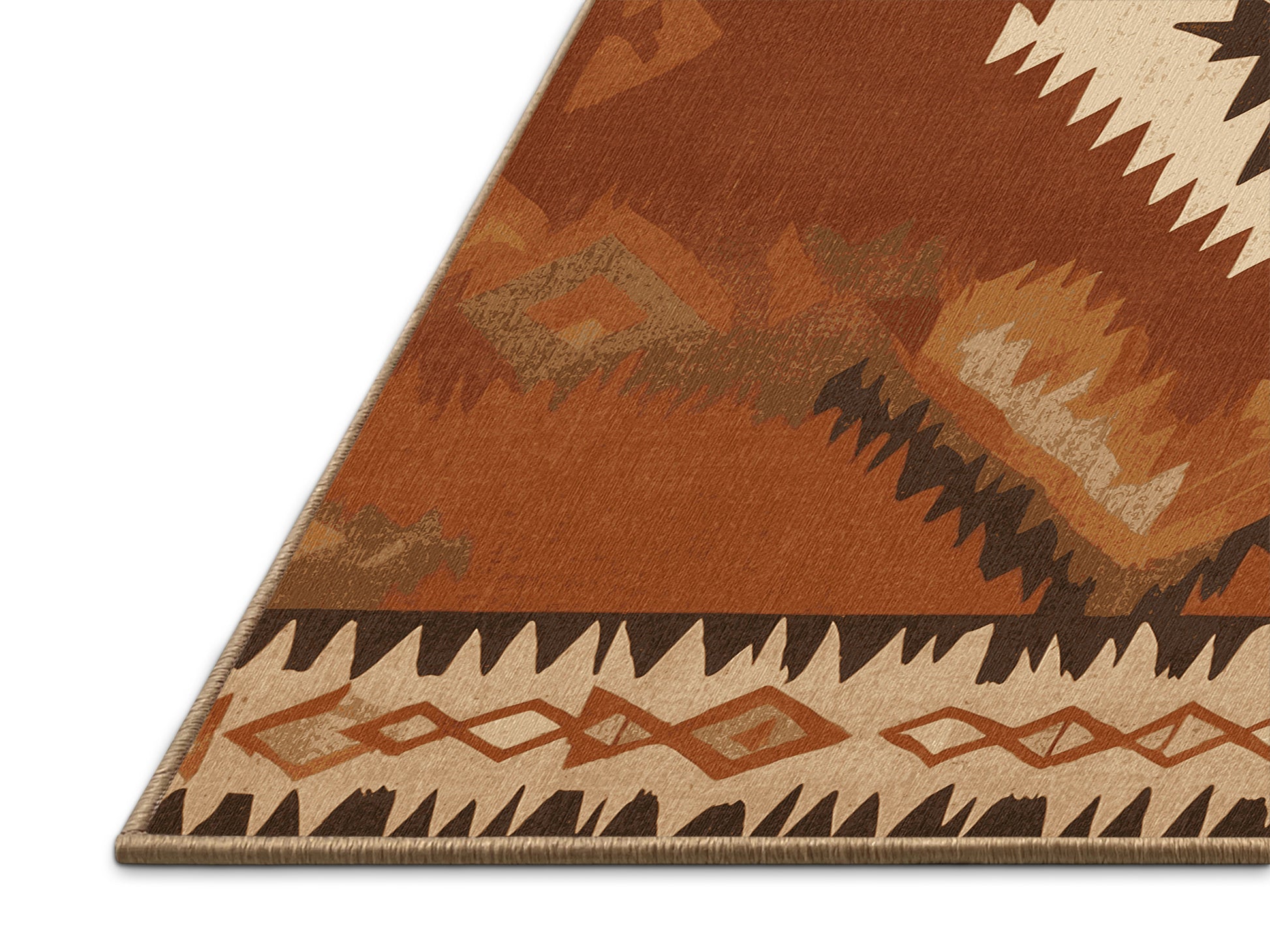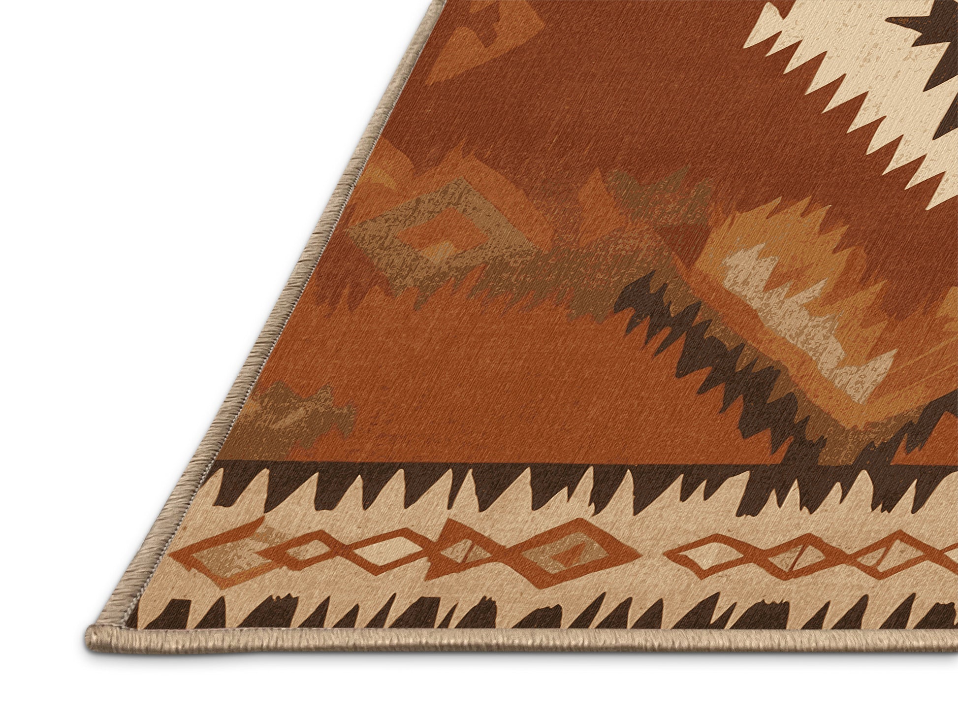 Zuni Zephyr from the Heritage Southwest collection captures the rugged charm of the American Southwest with its bold Sienna (W3C) color (A warm, reddish-brown inspired by natural pigments.), a striking tone in the Brown color family. Inspired by traditional Navajo artistry and desert landscapes, this rug features geometric patterns and tribal-inspired designs that evoke cultural heritage and timeless beauty. Finished with LightBrown serging a durable stitched edge that prevents fraying and enhances its rustic appeal this rug is crafted from premium polyester and machine-made in the USA with imported materials. Perfect for grounding a living room, adding warmth to a bedroom, or enhancing a dining area, this design seamlessly complements rustic, bohemian, or modern interiors. Available in multiple sizes, the Heritage Southwest collection brings the spirit of the desert into your home with its warm tones and artisanal charm.