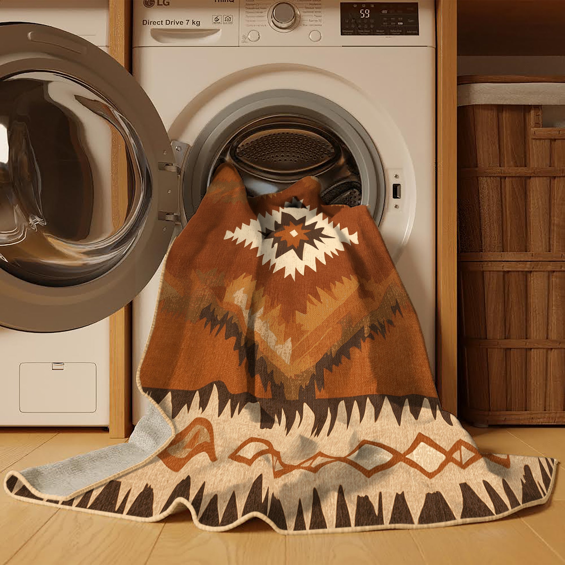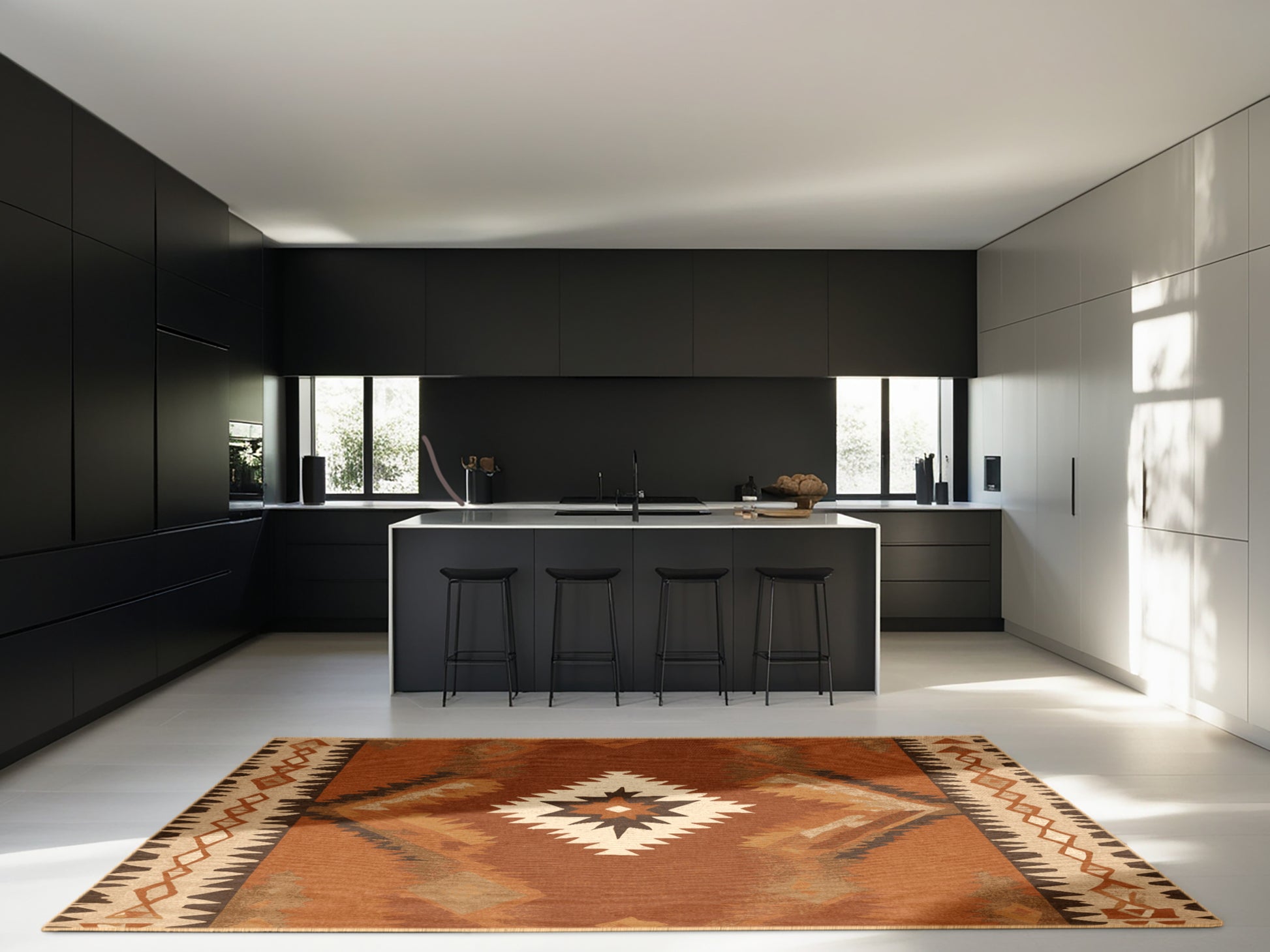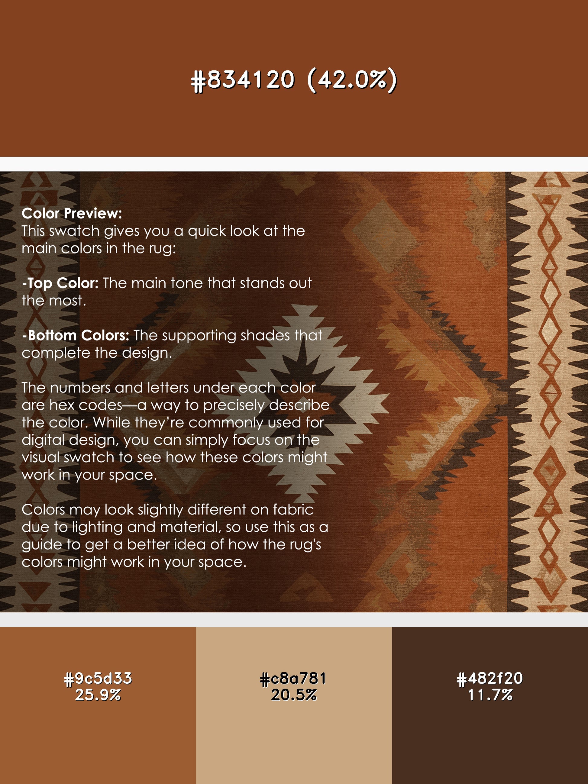 Zuni Zephyr from the Heritage Southwest collection captures the rugged charm of the American Southwest with its bold Sienna (W3C) color (A warm, reddish-brown inspired by natural pigments.), a striking tone in the Brown color family. Inspired by traditional Navajo artistry and desert landscapes, this rug features geometric patterns and tribal-inspired designs that evoke cultural heritage and timeless beauty. Finished with LightBrown serging a durable stitched edge that prevents fraying and enhances its rustic appeal this rug is crafted from premium polyester and machine-made in the USA with imported materials. Perfect for grounding a living room, adding warmth to a bedroom, or enhancing a dining area, this design seamlessly complements rustic, bohemian, or modern interiors. Available in multiple sizes, the Heritage Southwest collection brings the spirit of the desert into your home with its warm tones and artisanal charm.